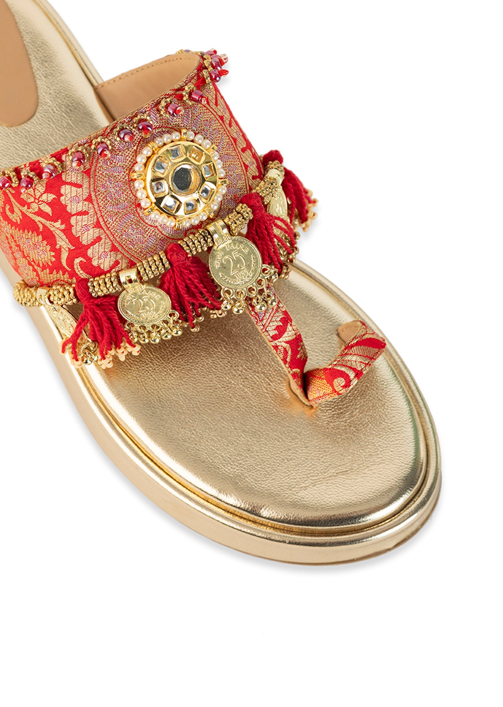 Step into the spotlight with gold wedges glowing in a regal red hue with a golden base and intricate brocade straps adorned with mirror work, gold coins, and playful handcrafted tassels. Crafted on smooth faux leather, they blend bold festive flair with a touch of traditional charm. The moti and tassel details add sparkle and movement, making them perfect for weddings, mehendi events, and lively celebrations. Awarded as the Most Trusted Brand, we're delivering styles you love, just as promised.