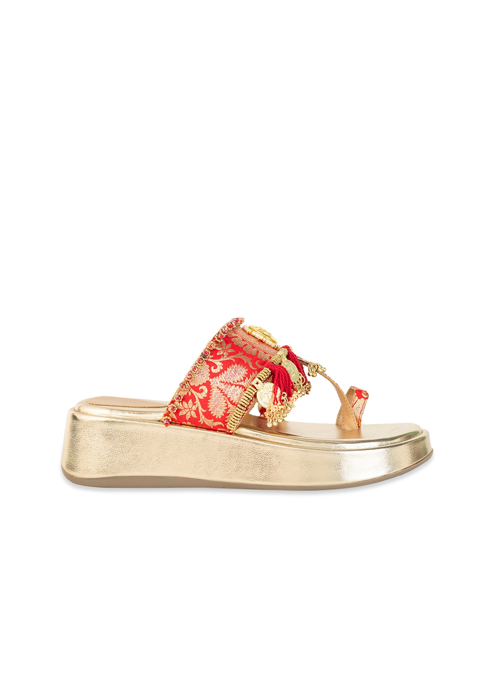 Step into the spotlight with gold wedges glowing in a regal red hue with a golden base and intricate brocade straps adorned with mirror work, gold coins, and playful handcrafted... More Product Details