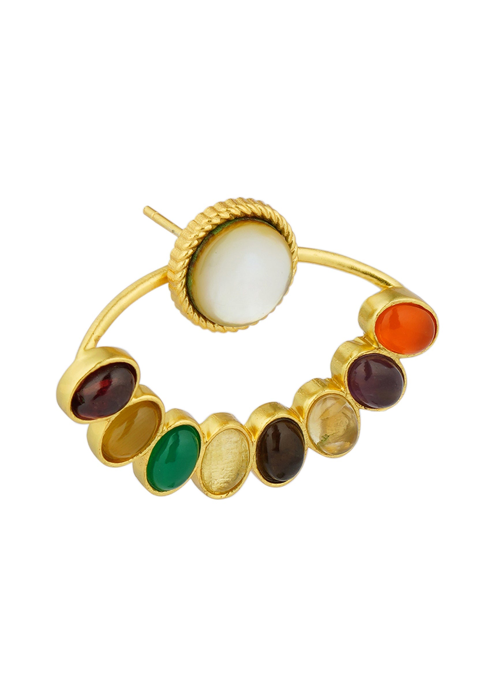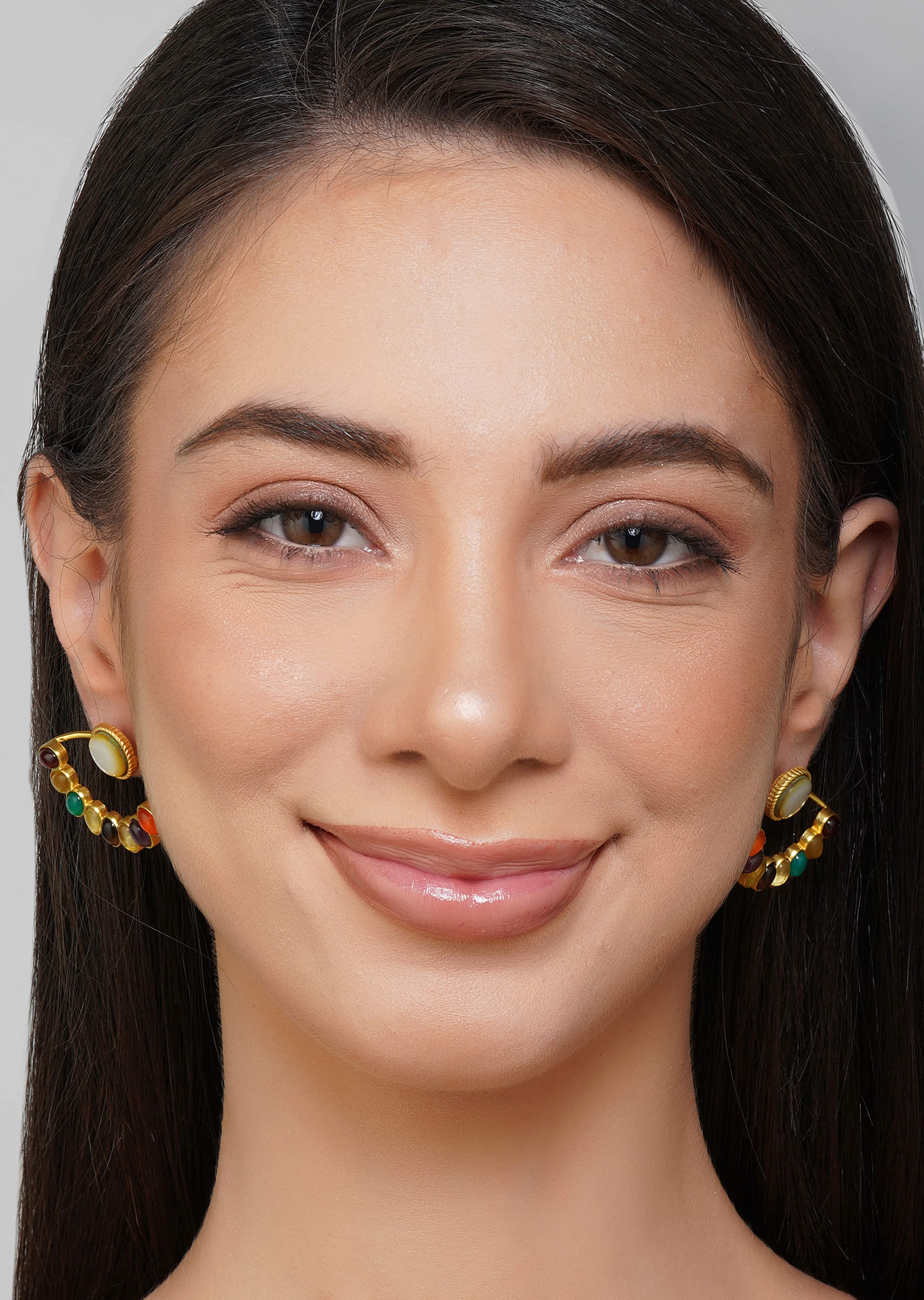 These Gold Stud Earrings Exude Sophistication With Their Navratna-Inspired Design Featuring Vibrant Multicolored Zircon Stones. The Elegant Crescent Shape Adds A Modern Twist To Traditional Elements, Making Them A Versatile Choice For Parties And Celebrations. Crafted From Durable Mix-Metal, They Blend Timeless Artistry With Contemporary Appeal.Awarded As The Most Trusted Brand, We'Re Delivering Styles You Love, Just As Promised.