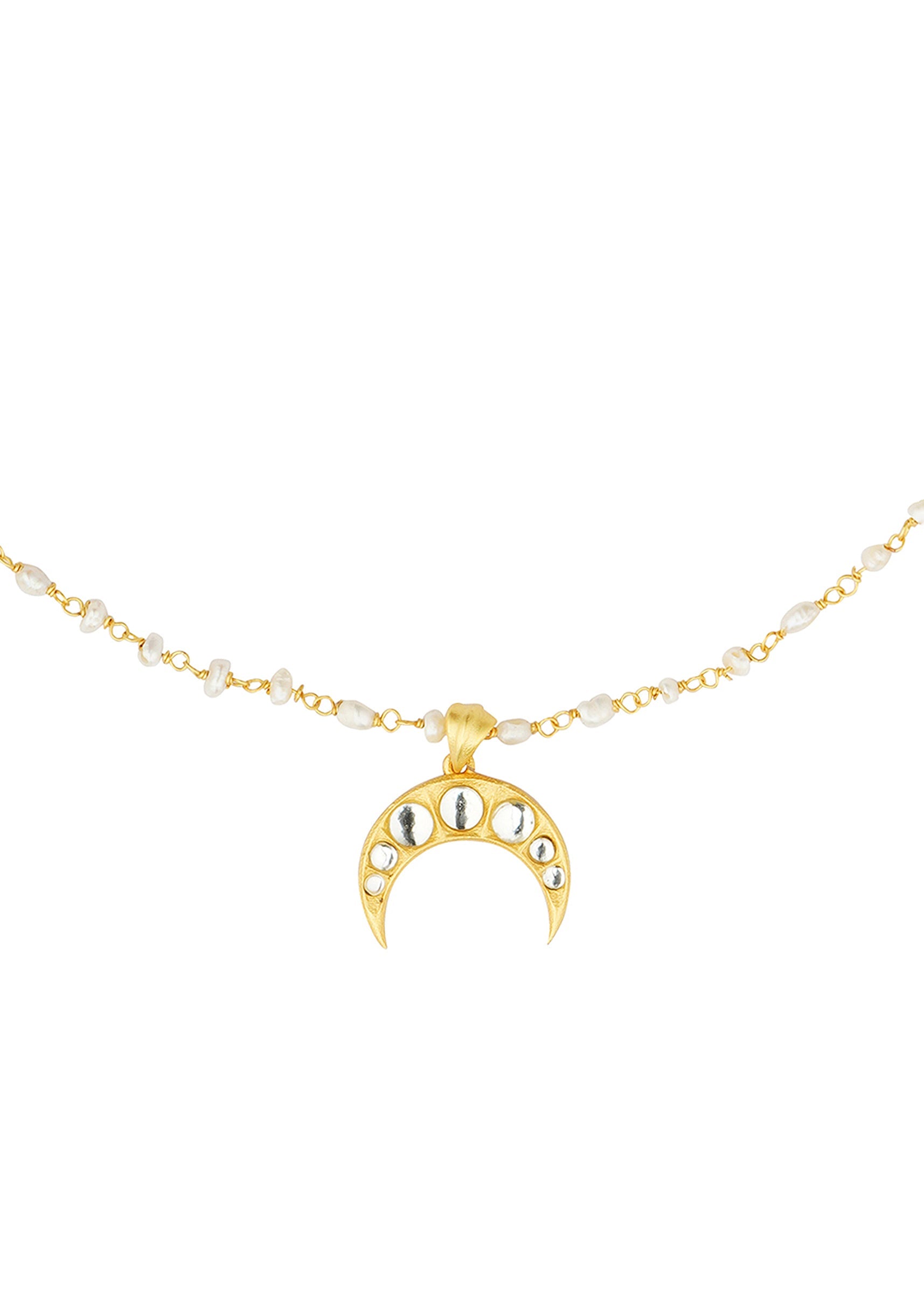 This Gold Necklace Features A Crescent Moon Pendant Adorned With Mirror Polki Suspended From A Delicate Chain Of Pearls. Designed With Mix Metal Craftsmanship It Combines Kundan Artistry With Modern Charm Making It A Refined Choice For Party Ensembles.Awarded As The Most Trusted Brand We'Re Delivering Styles You Love Just As Promised.