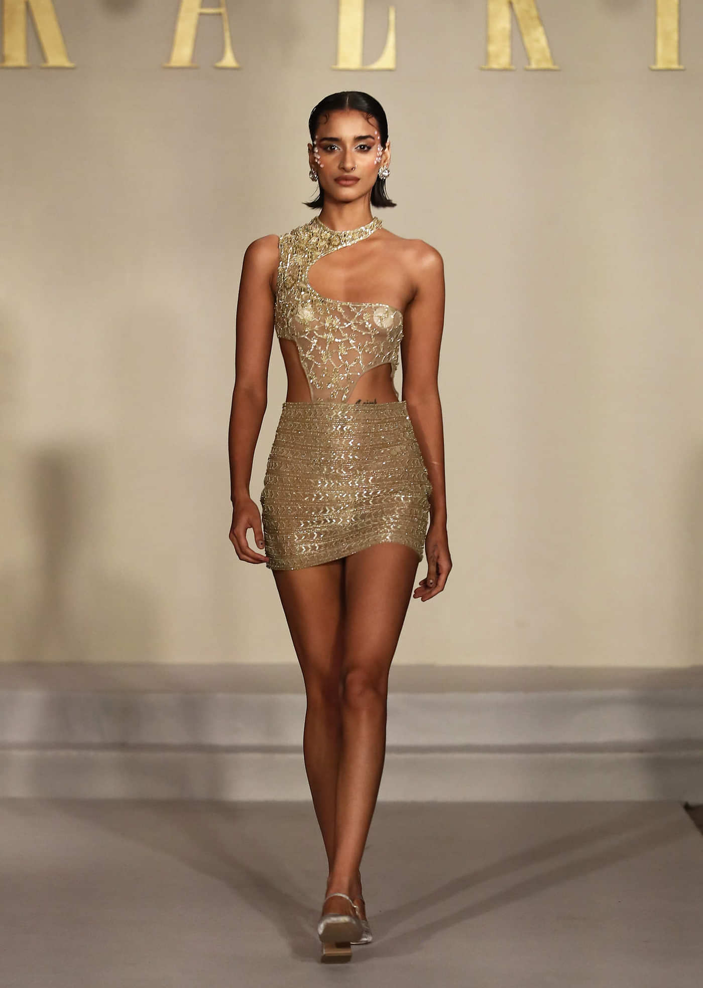 A sleek statement lands perfectly when this gold net metallic Indo western set brings a sleeveless asymmetric bodysuit together with a coordinated mini skirt. Handwork in sequins and cutdana delivers... More Product Details