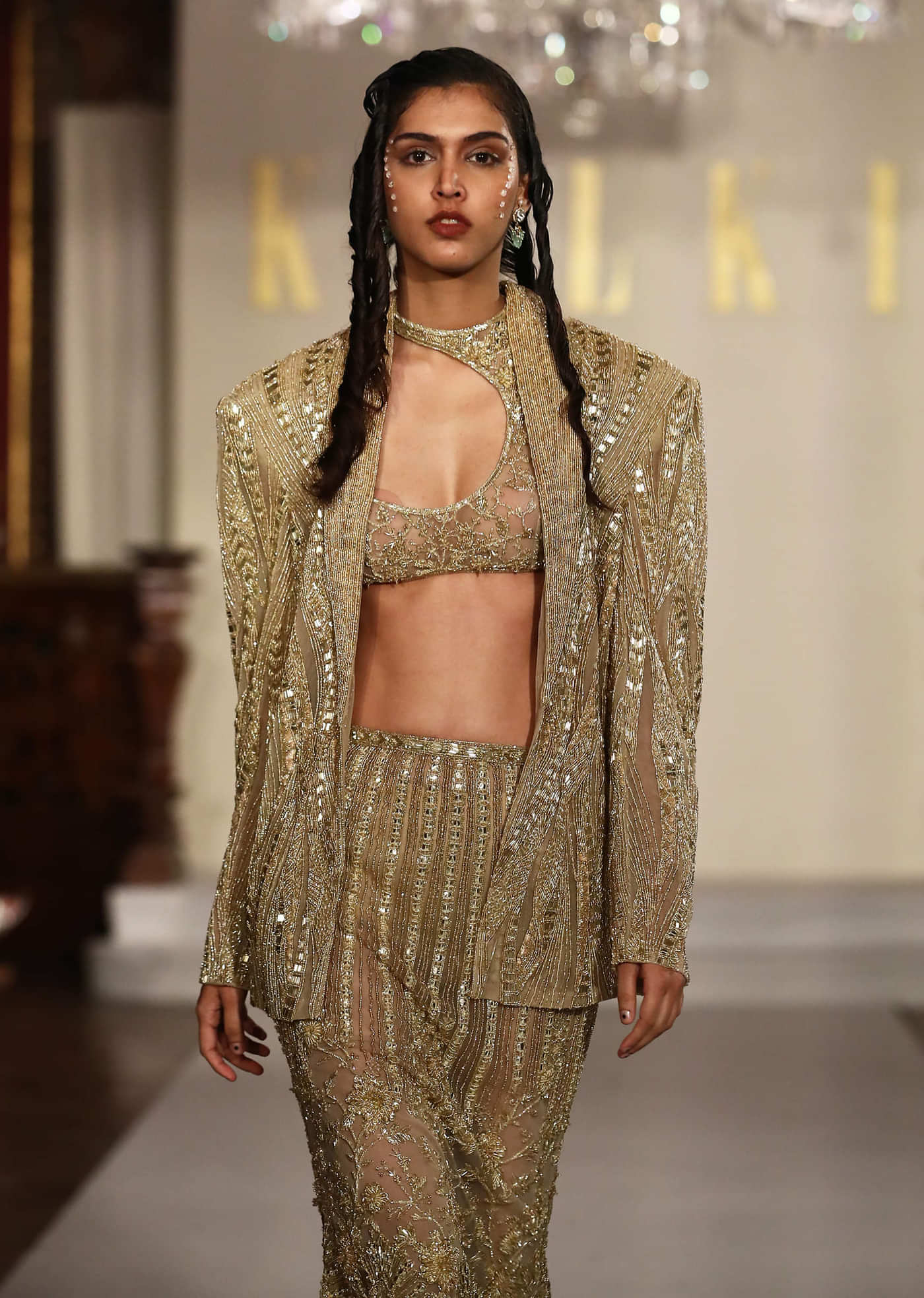 Runway energy meets ceremony as this moment lands and the gold net metallic Indo western set steps in with a mermaid-fit skirt and asymmetric blouse under an embroidered blazer. Hand... More Product Details