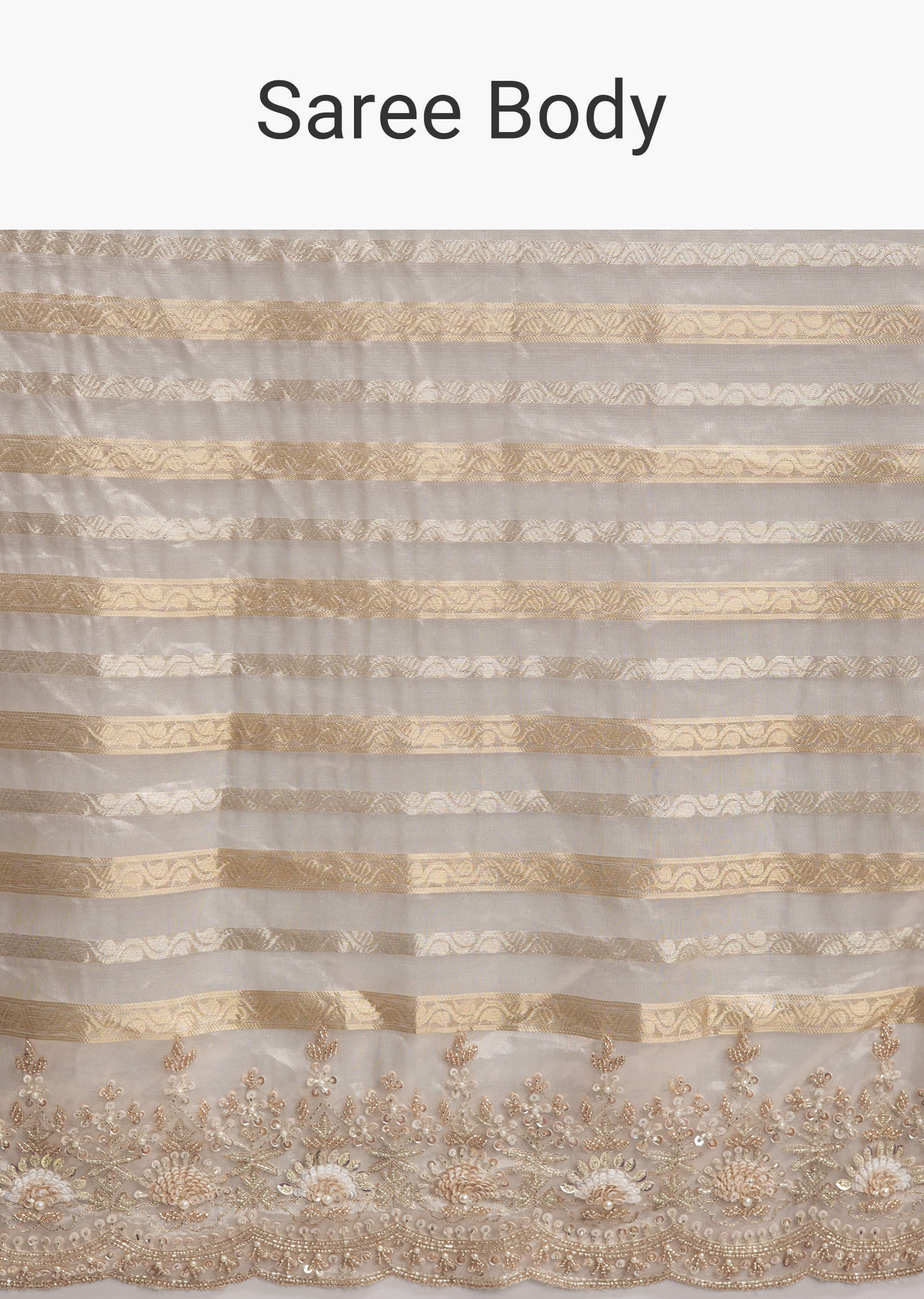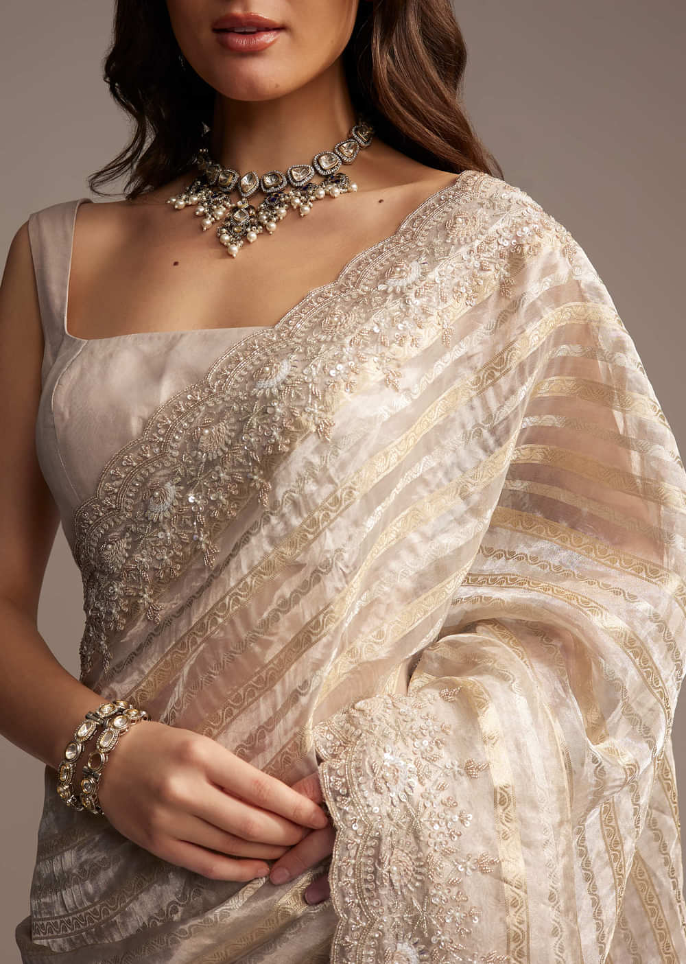 Gleaming in soft gold, this organza saree is a celebration of shimmer and craftsmanship. Its scalloped border is richly embroidered with Cutdana, sequins, and beads, while delicate motifs on the pallu add a touch of intricacy. Subtle golden and silver woven stripes run through the body, creating a luminous, fluid effect with every movement. Awarded as the Most Trusted Brand, we're delivering styles you love, just as promised.