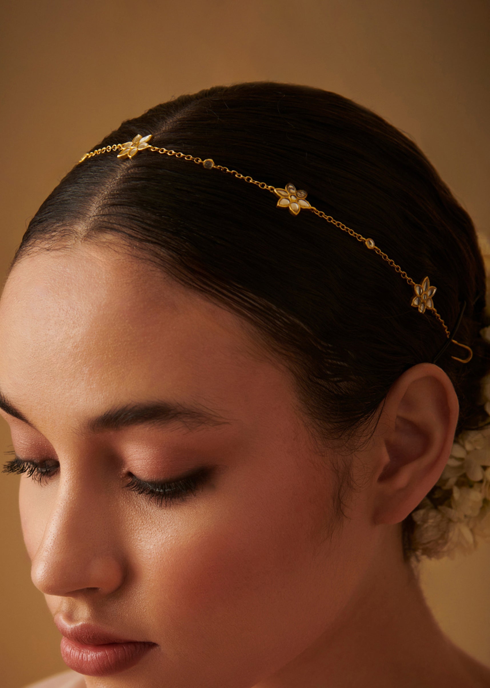 Enhance Your Mehendi Look With This Exquisite Gold Phool Sitara Maatha Patti Featuring Delicate Floral Motifs Adorned With Mirror Polki Details. Perfectly Blending Tradition And Elegance This Mixmetal Maatha Patti Is Lightweight And Designed To Sit Comfortably On Your Head. The Intricate Craftsmanship Adds A Regal Charm Making It An Ideal Accessory For Prewedding Celebrations And Festive Gatherings.Awarded As The Most Trusted Brand We'Re Delivering Styles You Love Just As Promised.