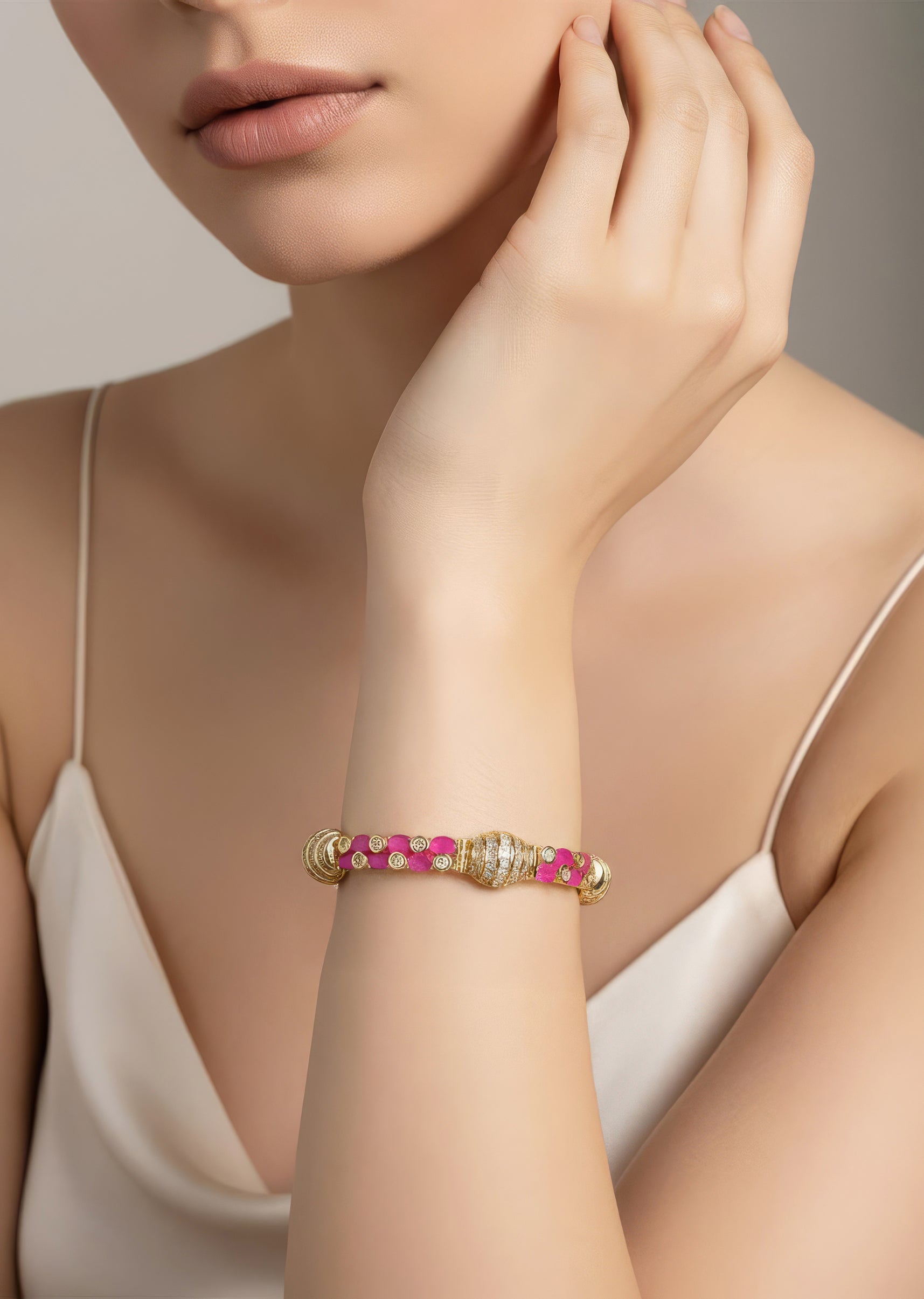 Elegant gold-finish bangles adorned with dazzling white stones and vibrant pink accents. A perfect blend of tradition and modernity, ideal for special occasions and everyday glamour. Product dimensions may vary... More Product Details