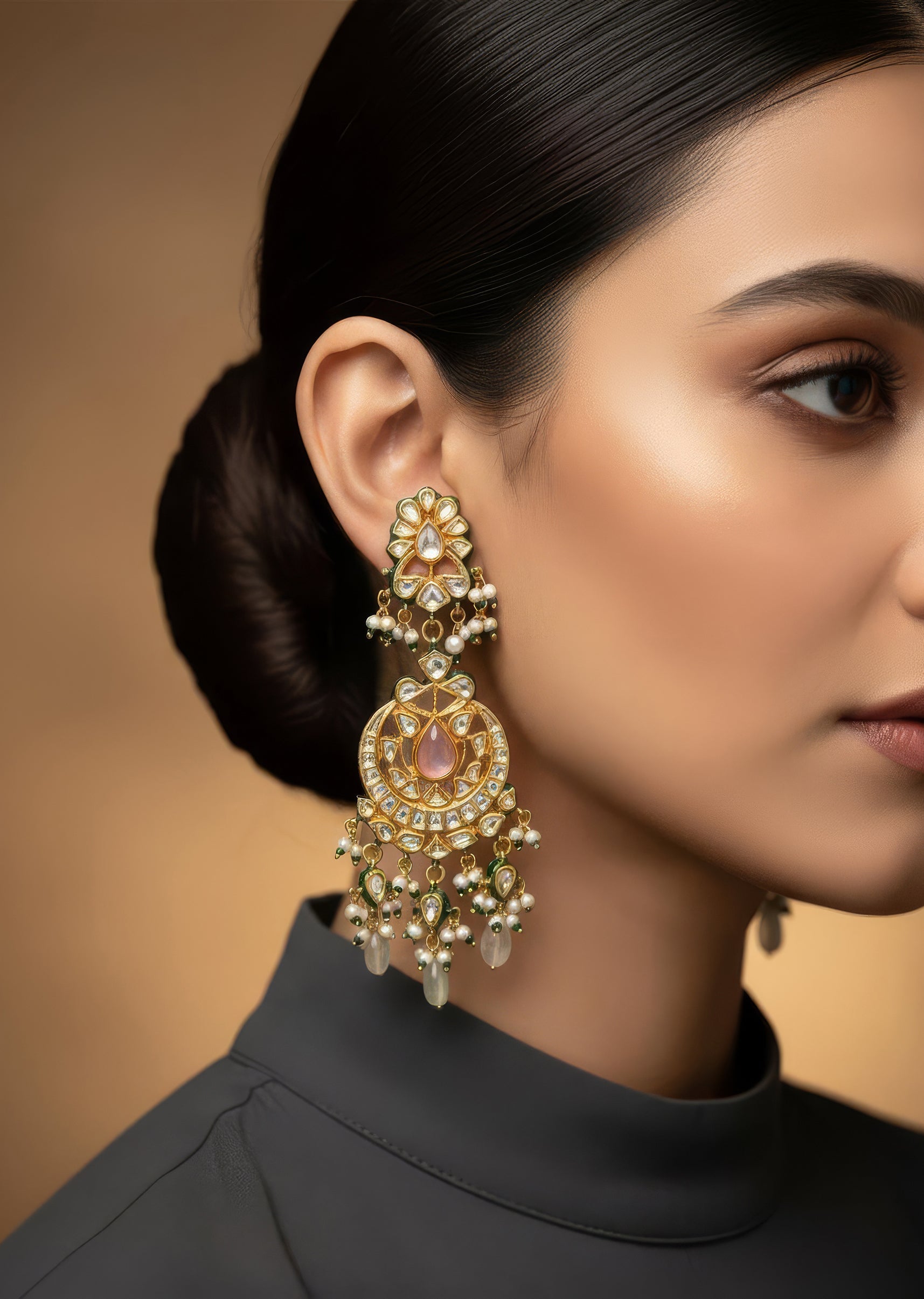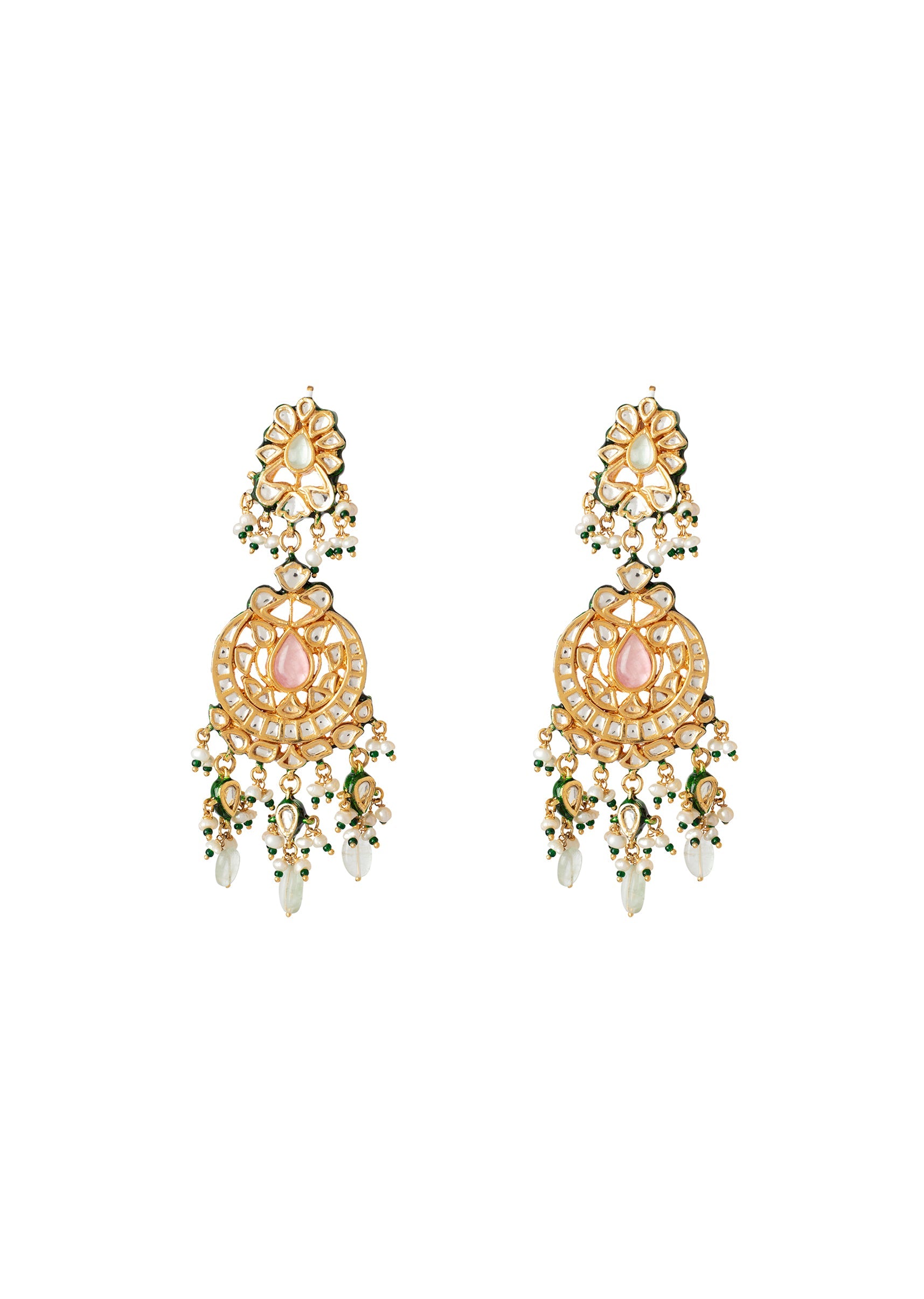 Exquisite handcrafted earrings featuring an intricate gold-toned design adorned with pink and green accents. Perfect for weddings or festive occasions, these earrings embody elegance and timeless beauty. Product dimensions may... More Product Details