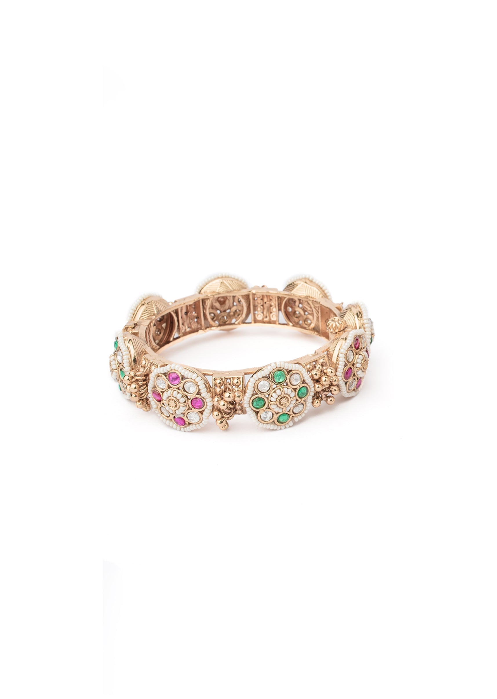 Exquisite gold bangles featuring intricate floral designs with sparkling pink & green gemstones. These traditional bangles add timeless elegance & vibrant charm, perfect for festive & special occasion Product dimensions... More Product Details