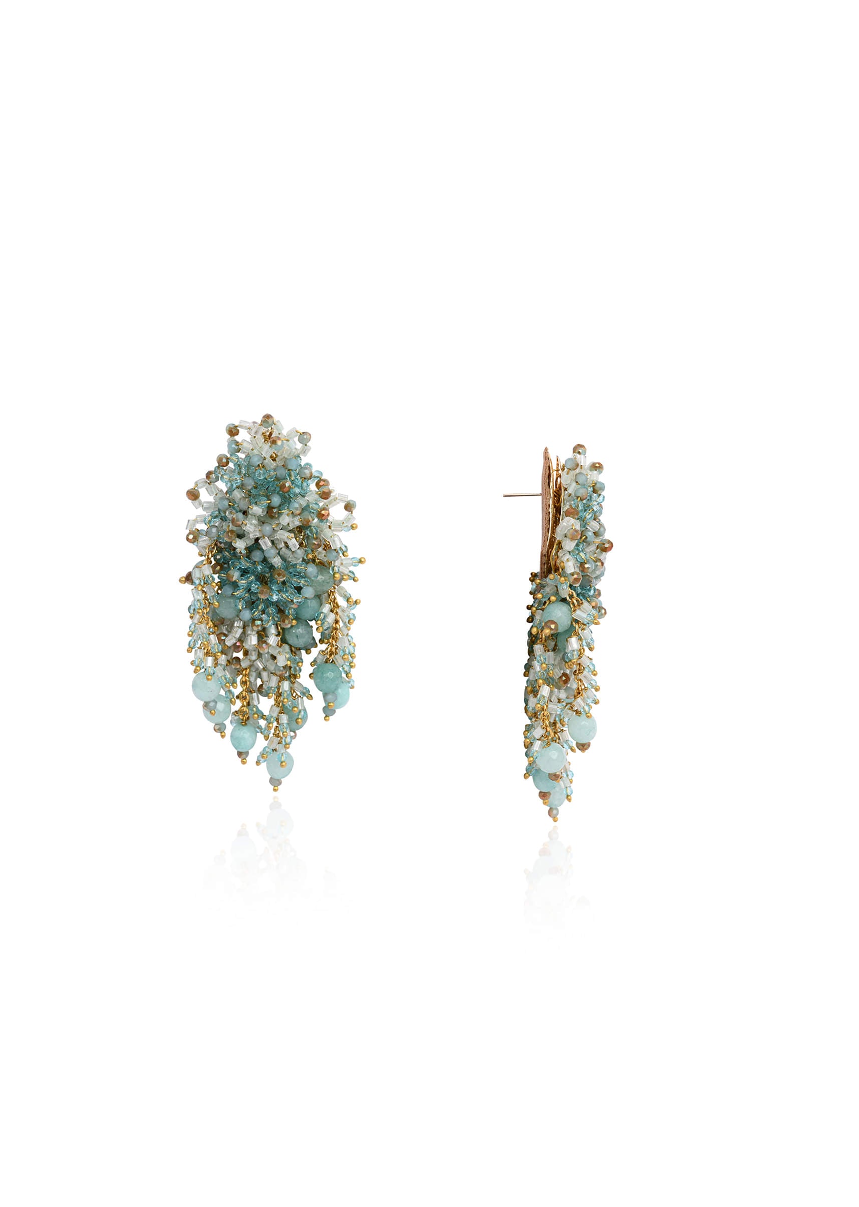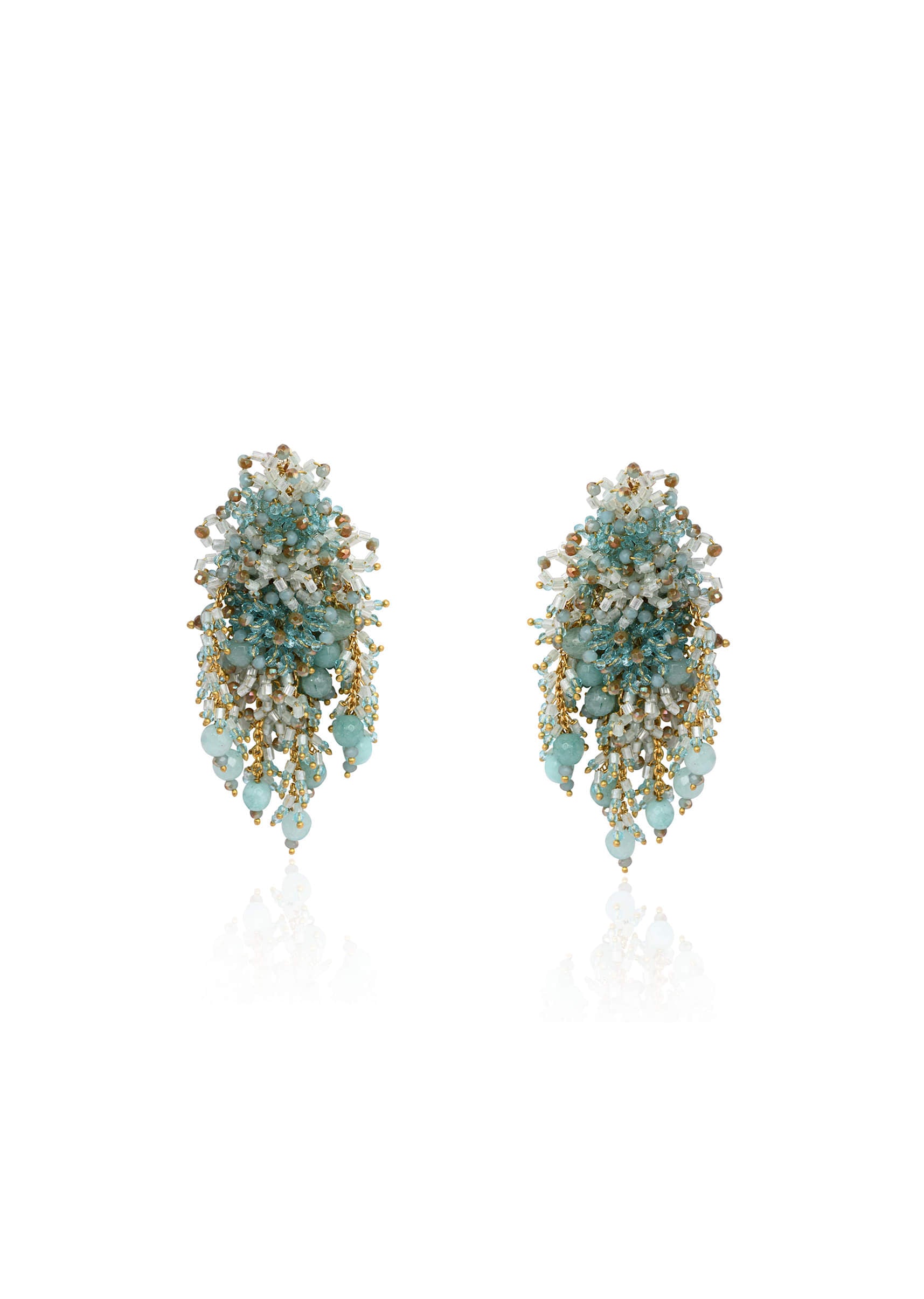 Handcrafted turquoise long earrings featuring cascading beads, crystals, and golden accents. Lightweight yet statement-making, they add a touch of elegance to festive, wedding, and party looks. Perfect to style with... More Product Details