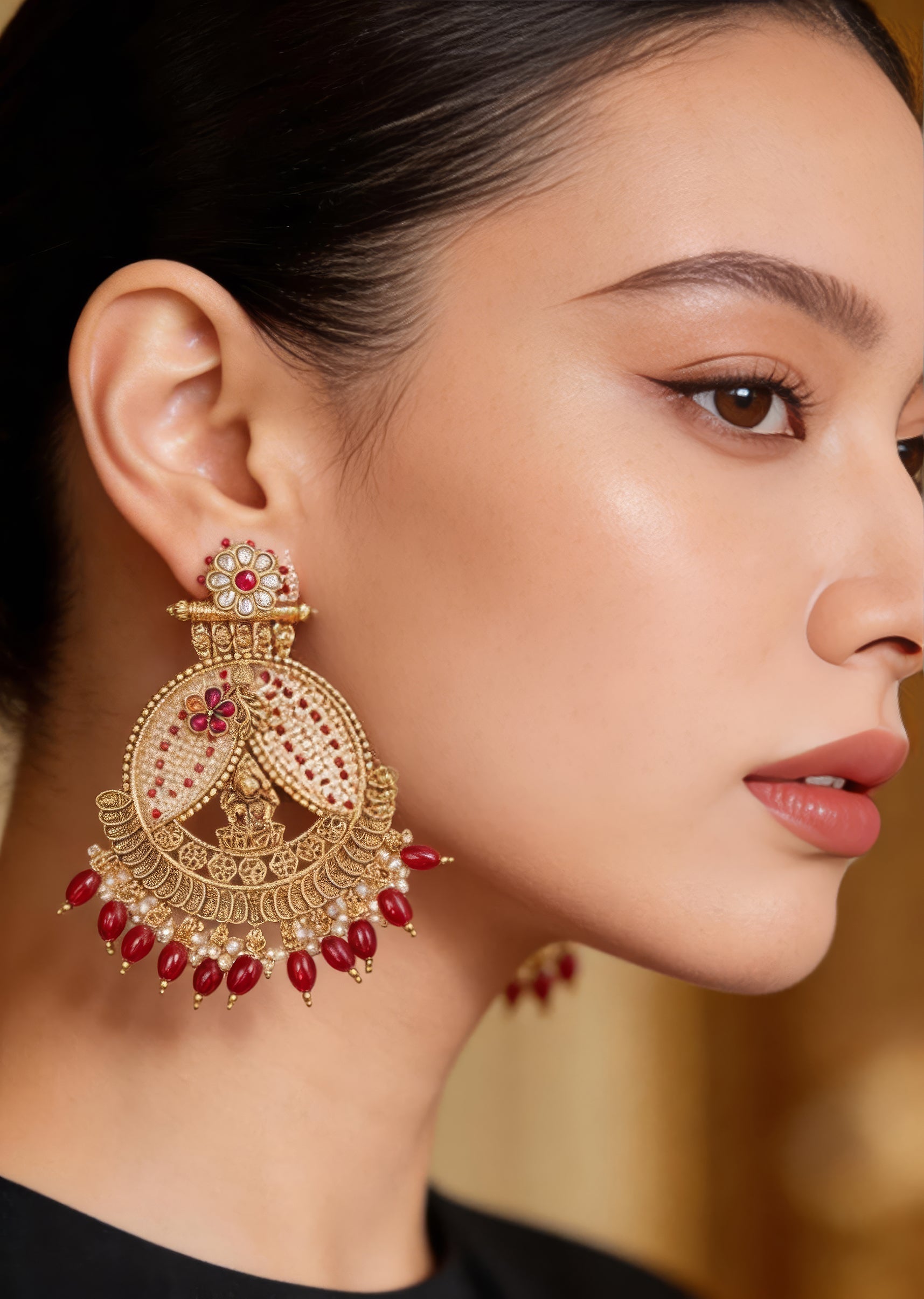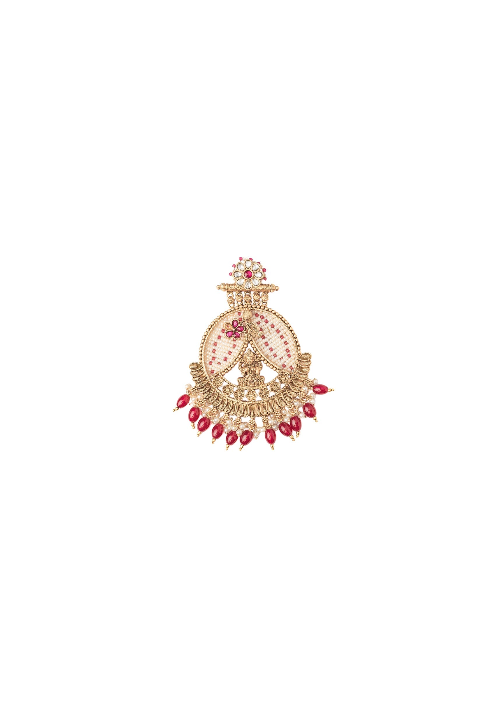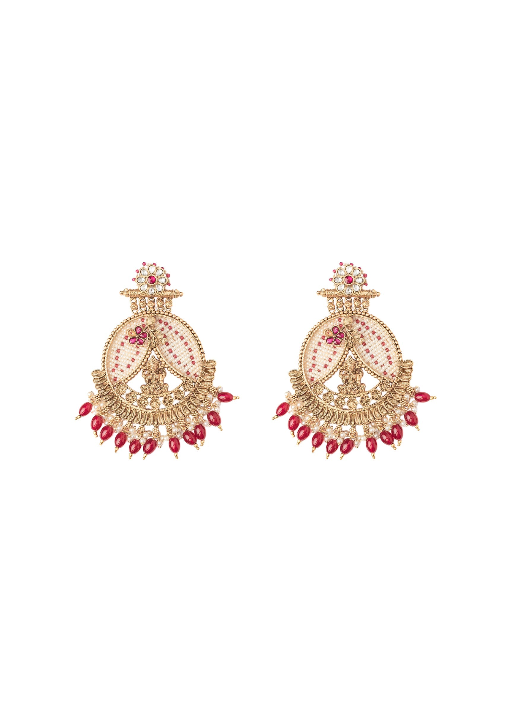 Grand gold-tone chandbali earrings featuring intricate detailing, pink gemstone embellishments, and maroon bead danglers. A stunning accessory to complement traditional and festive outfits. Product dimensions may vary slightly. Awarded as... More Product Details