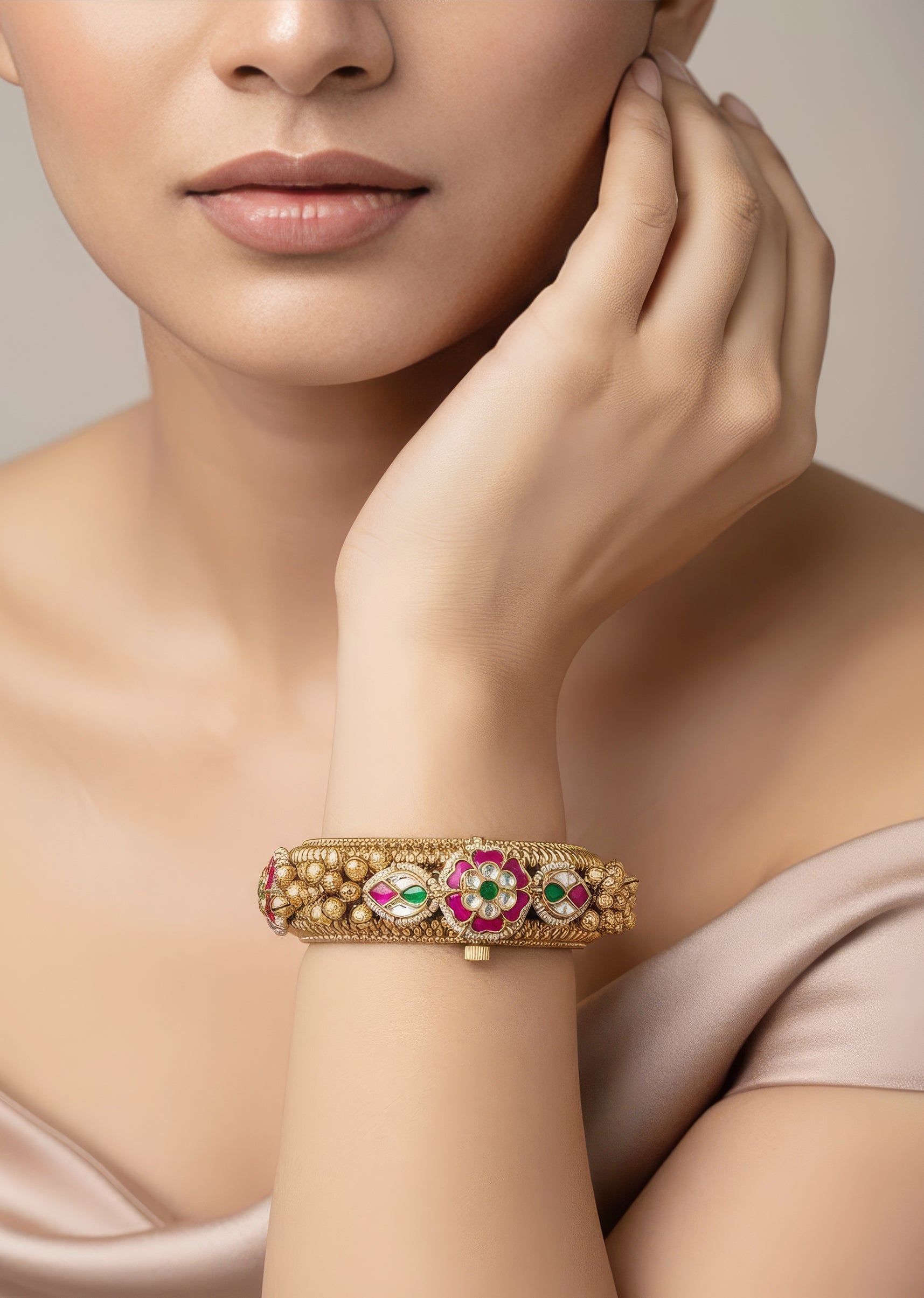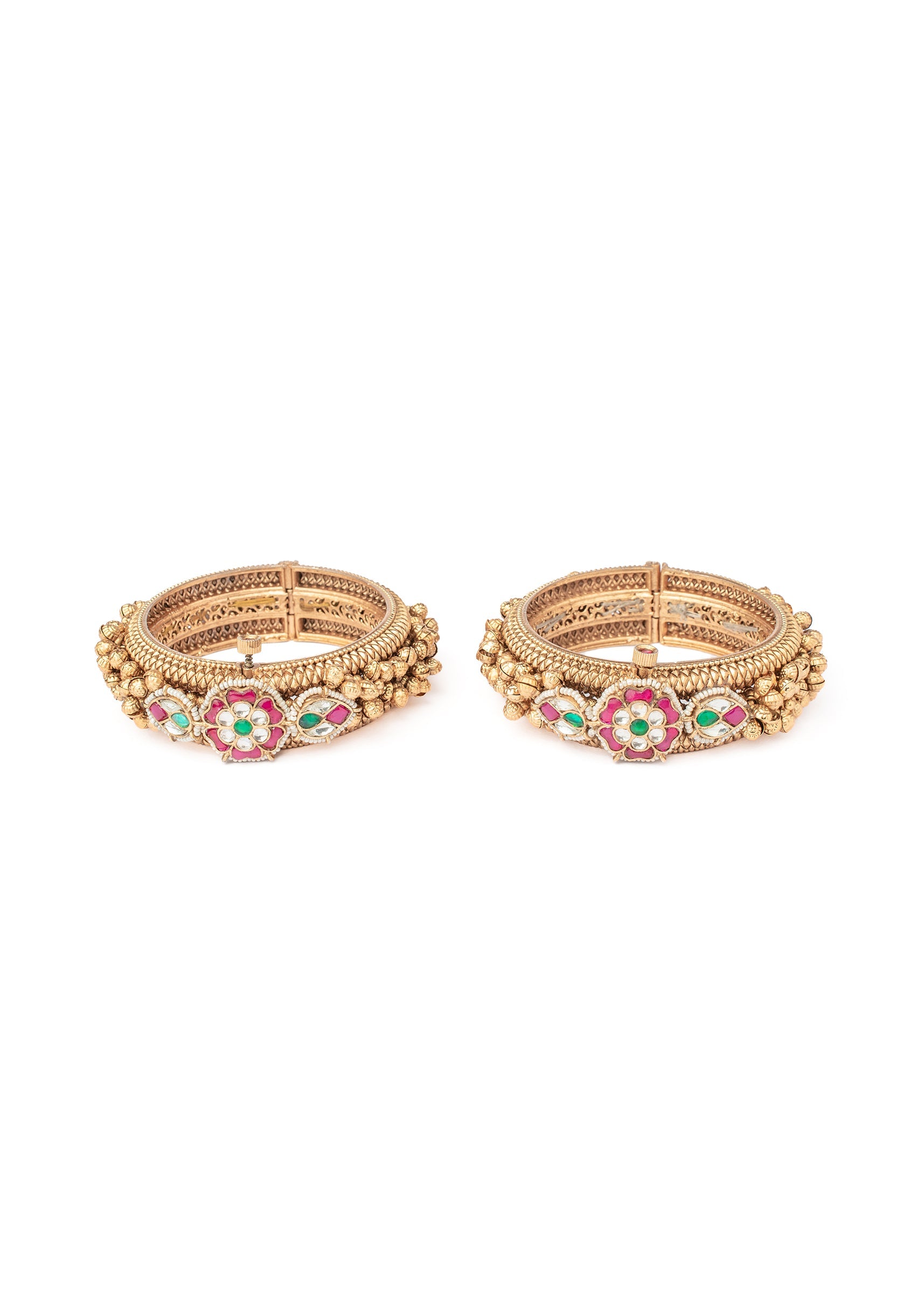 Elegant gold-toned bangles adorned with intricate floral designs, studded with vibrant green and pink stones. A perfect blend of tradition and charm, ideal for weddings and festive wear. Product dimensions... More Product Details