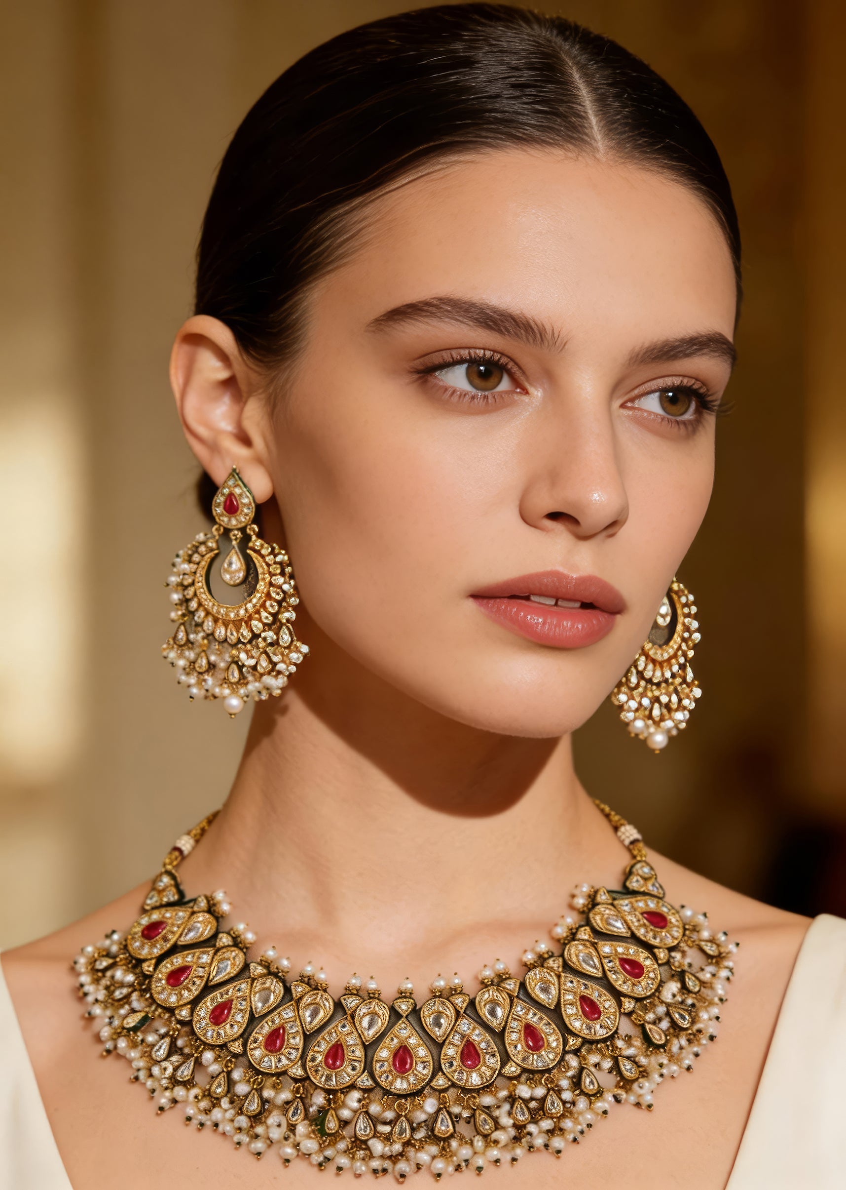 Luxurious statement jewelry set featuring intricately crafted earrings & a choker with vibrant teardrop motifs, pearls & gold accents. Perfect for wedding or festive occasions to elevate any ensemble. Product... More Product Details