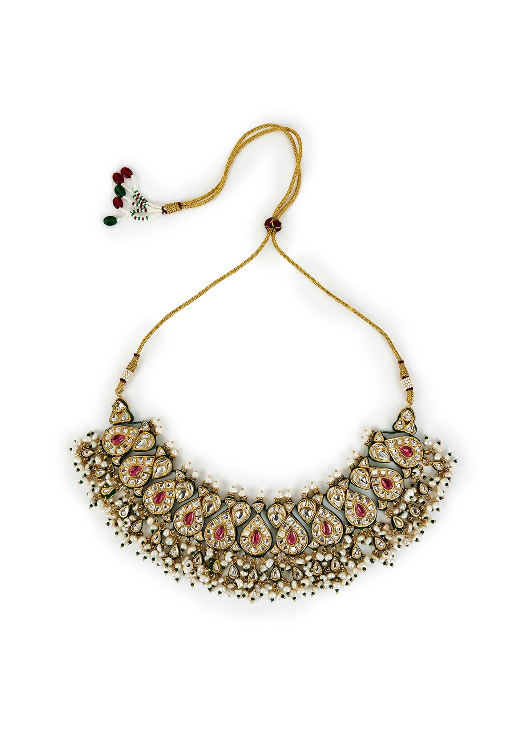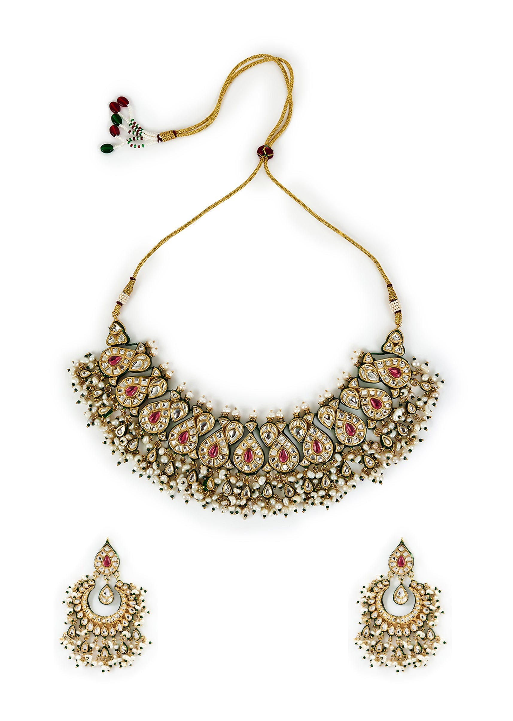 Luxurious statement jewelry set featuring intricately crafted earrings & a choker with vibrant teardrop motifs, pearls & gold accents. Perfect for wedding or festive occasions to elevate any ensemble. Product dimensions may vary slightly. Awarded as the Most Trusted Brand, we're delivering styles you love, just as promised.