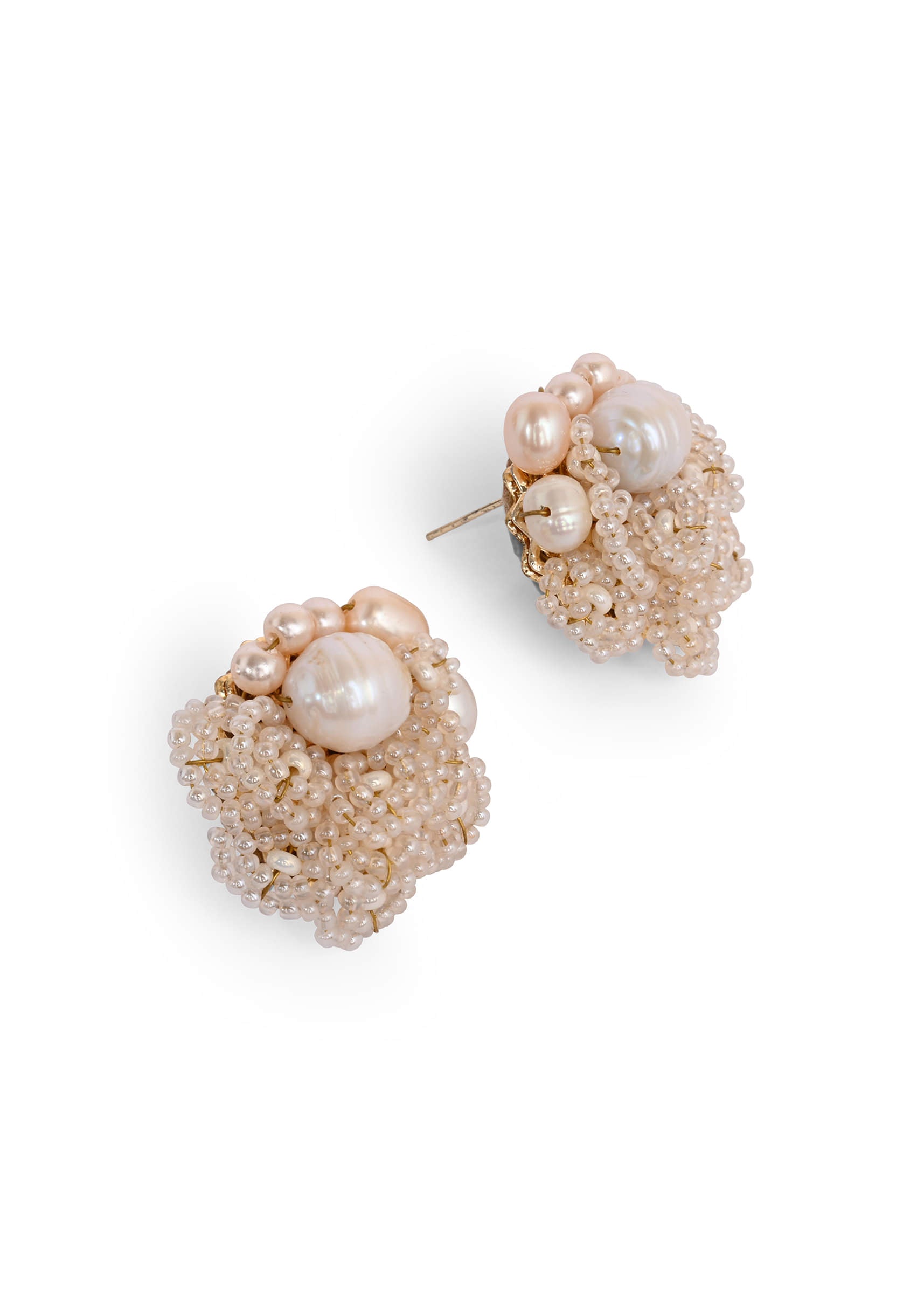 Gold Plated Round Flower Pearl Earrings Peach Crystal