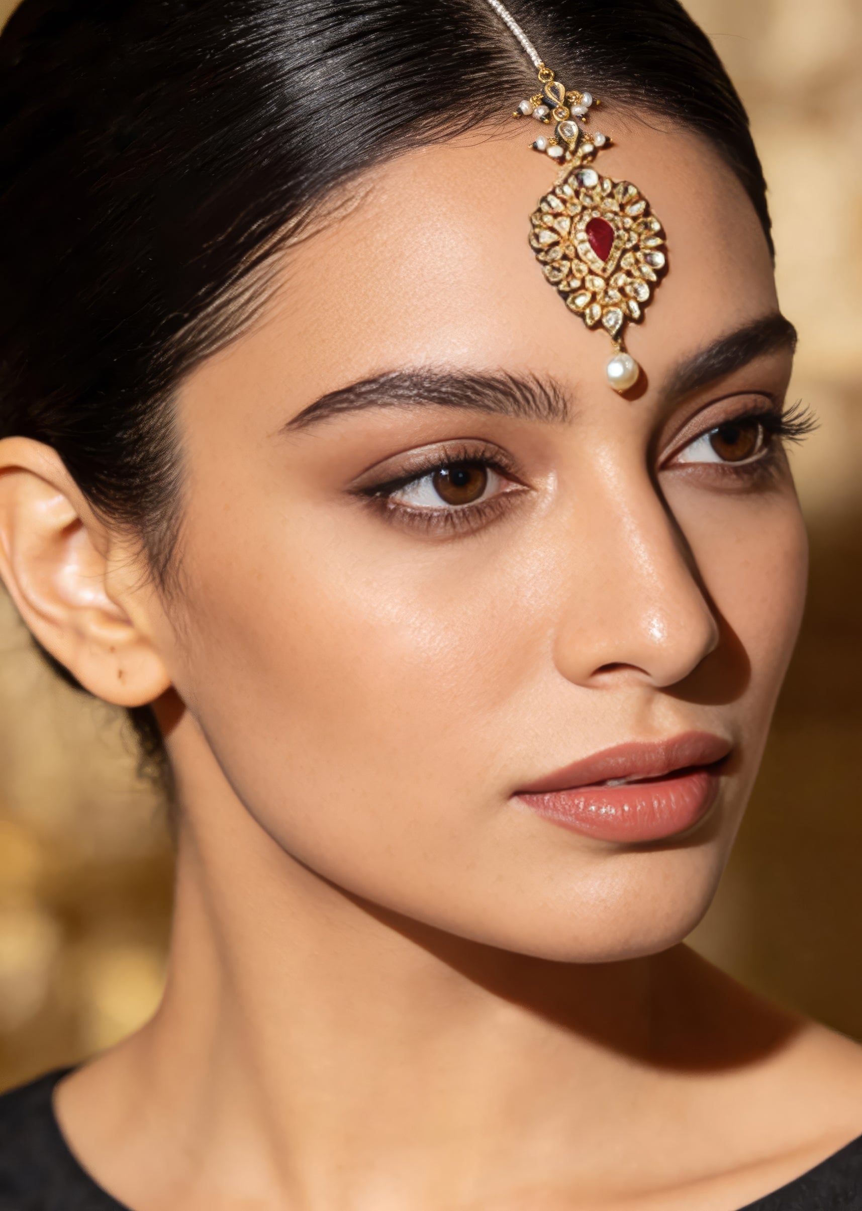 Stunning kundan maang tikka with a teardrop red stone centerpiece, surrounded by intricate white stones. A pearl drop adds grace, perfect for weddings or traditional occasions. Product dimensions may vary... More Product Details