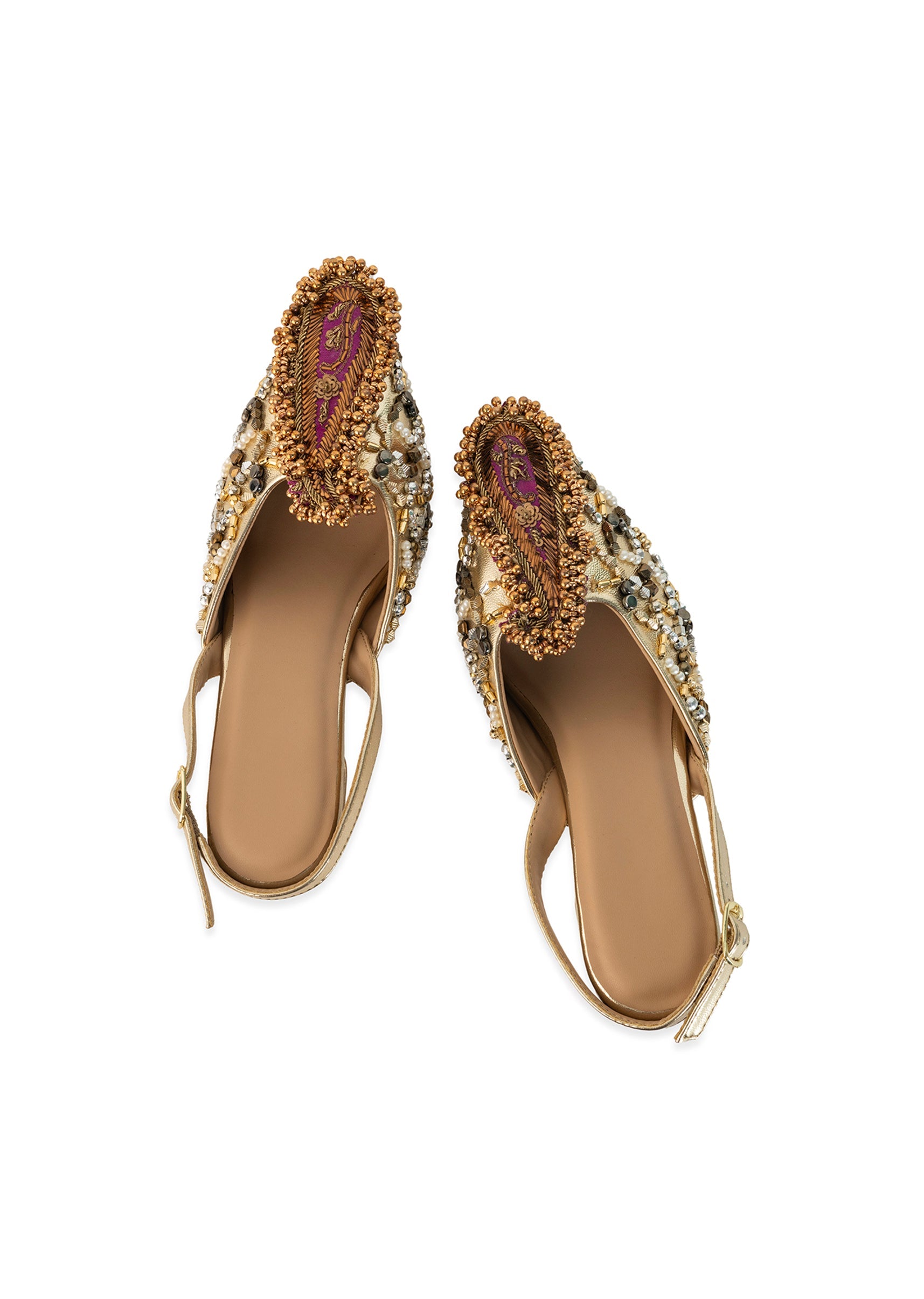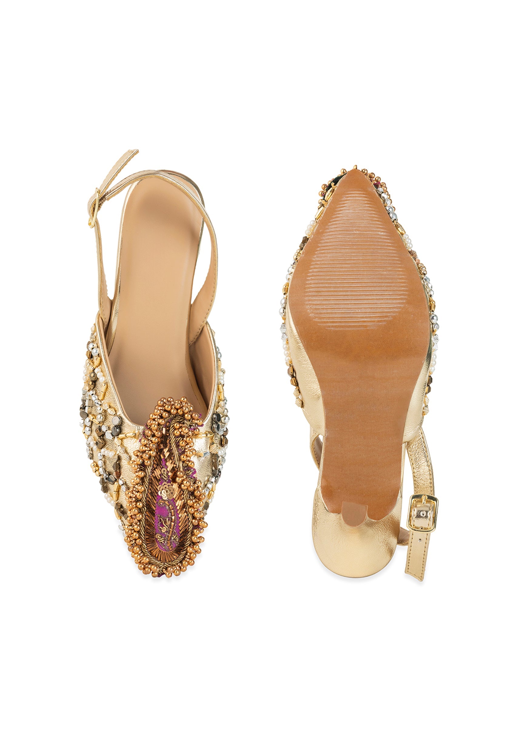 Illuminate your festive look with gold kitten heels glowing in a radiant gold tone and adorned with intricate beadwork, sequins, and metallic accents that exude regal charm. Crafted on smooth... More Product Details