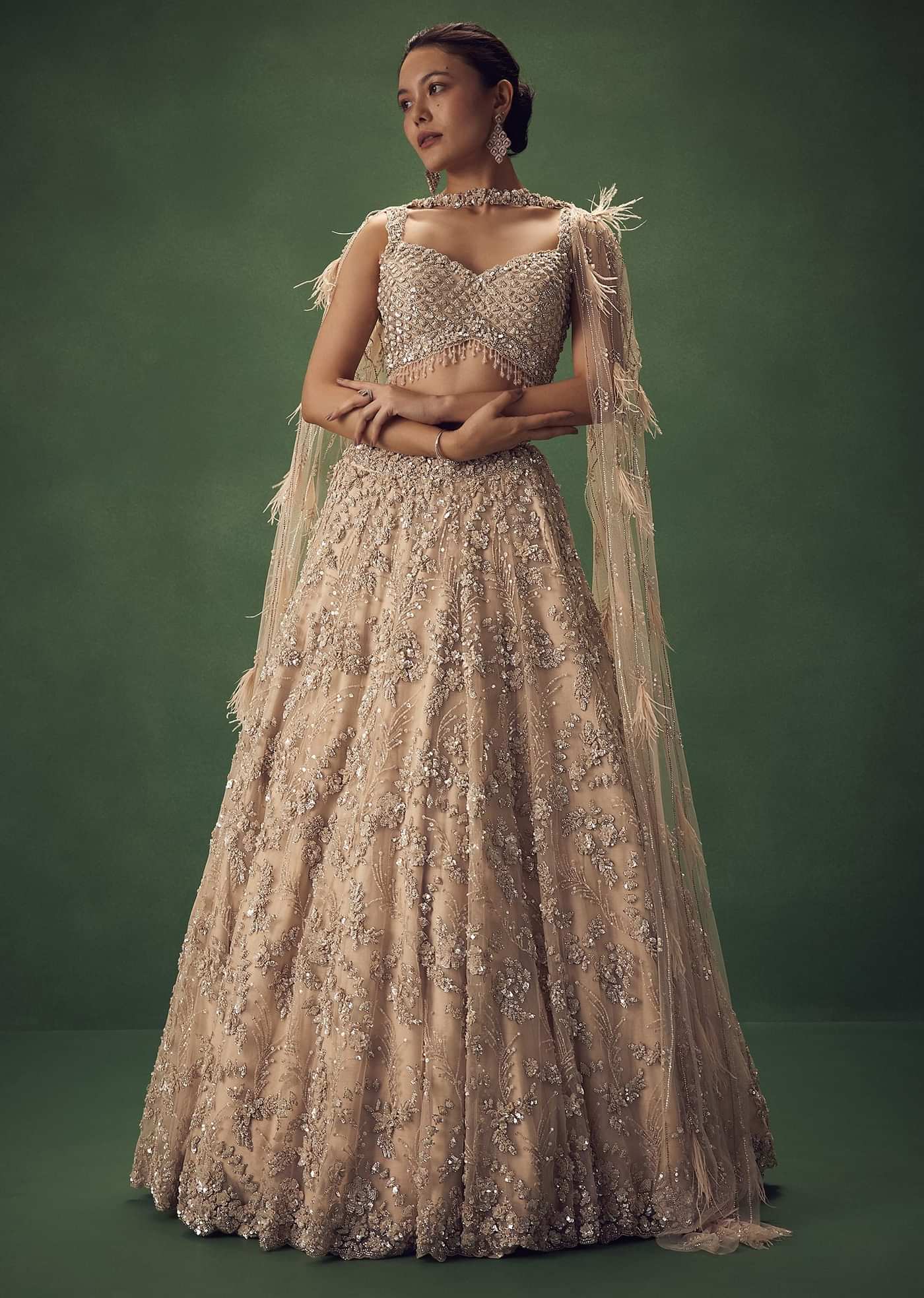 Turn heads with this opulent gold lehenga set a dazzling creation featuring intricate hand-embroidered sequin work that sparkles like molten gold. The unique choker-style dupatta with feather detailing adds a... More Product Details