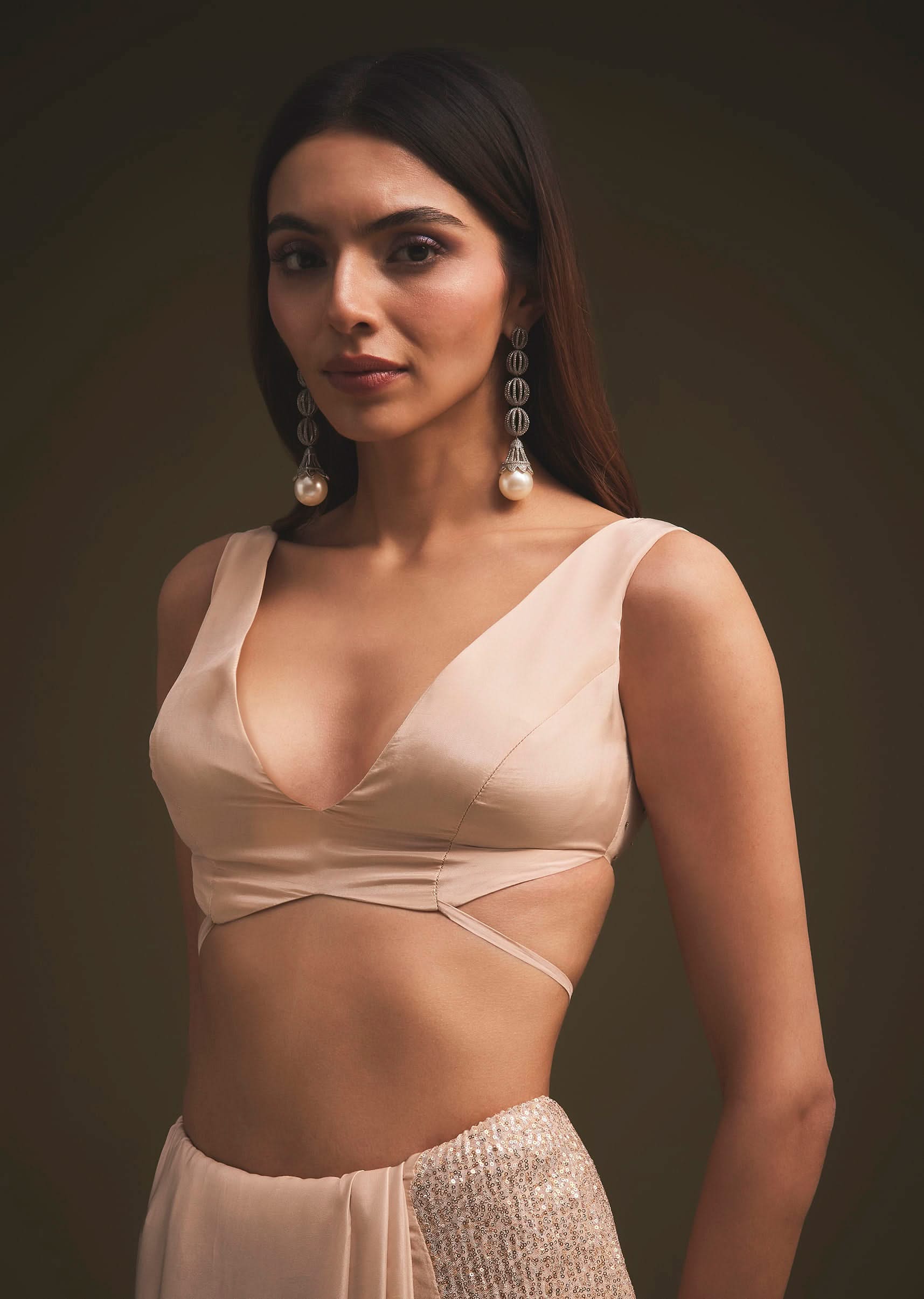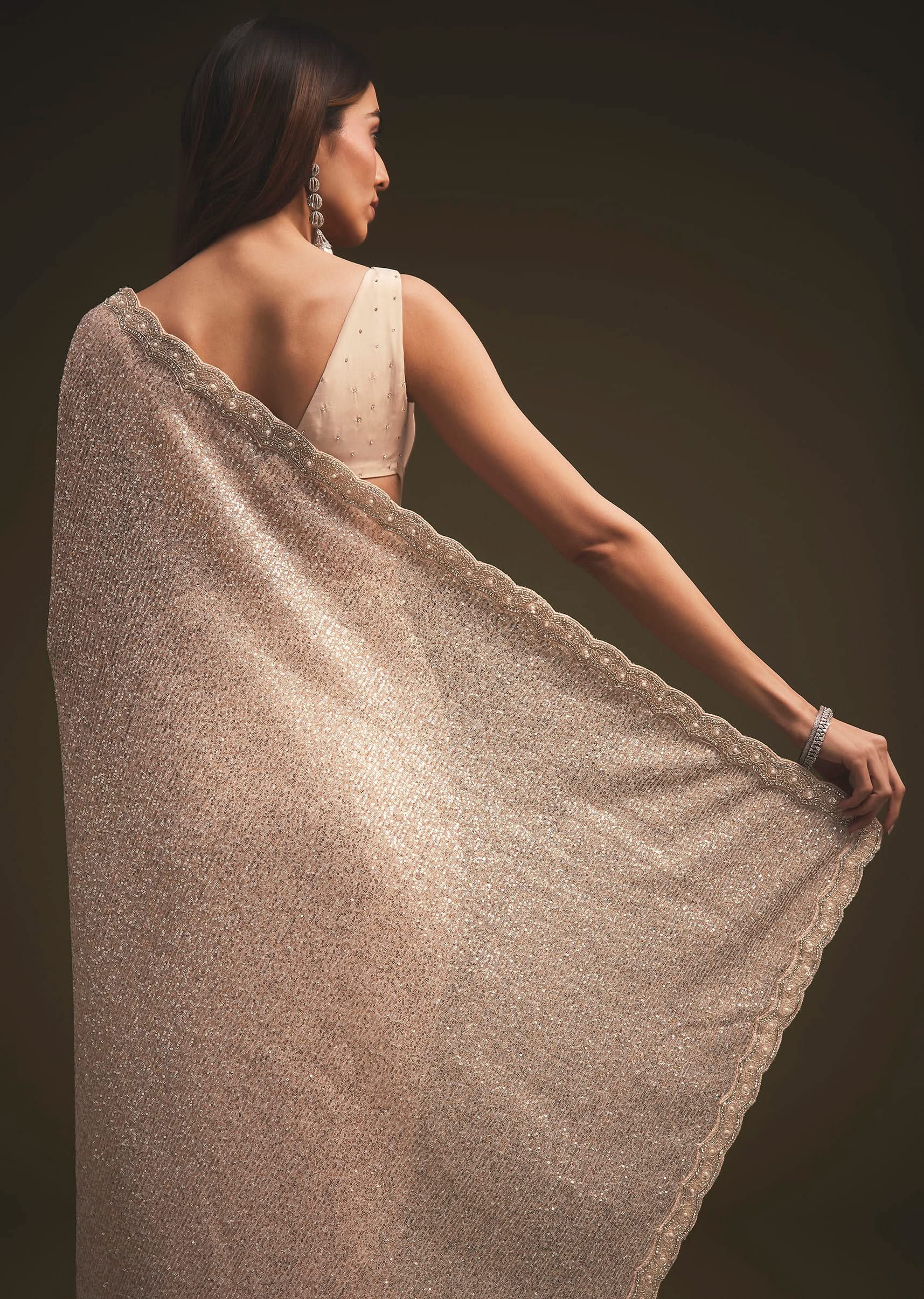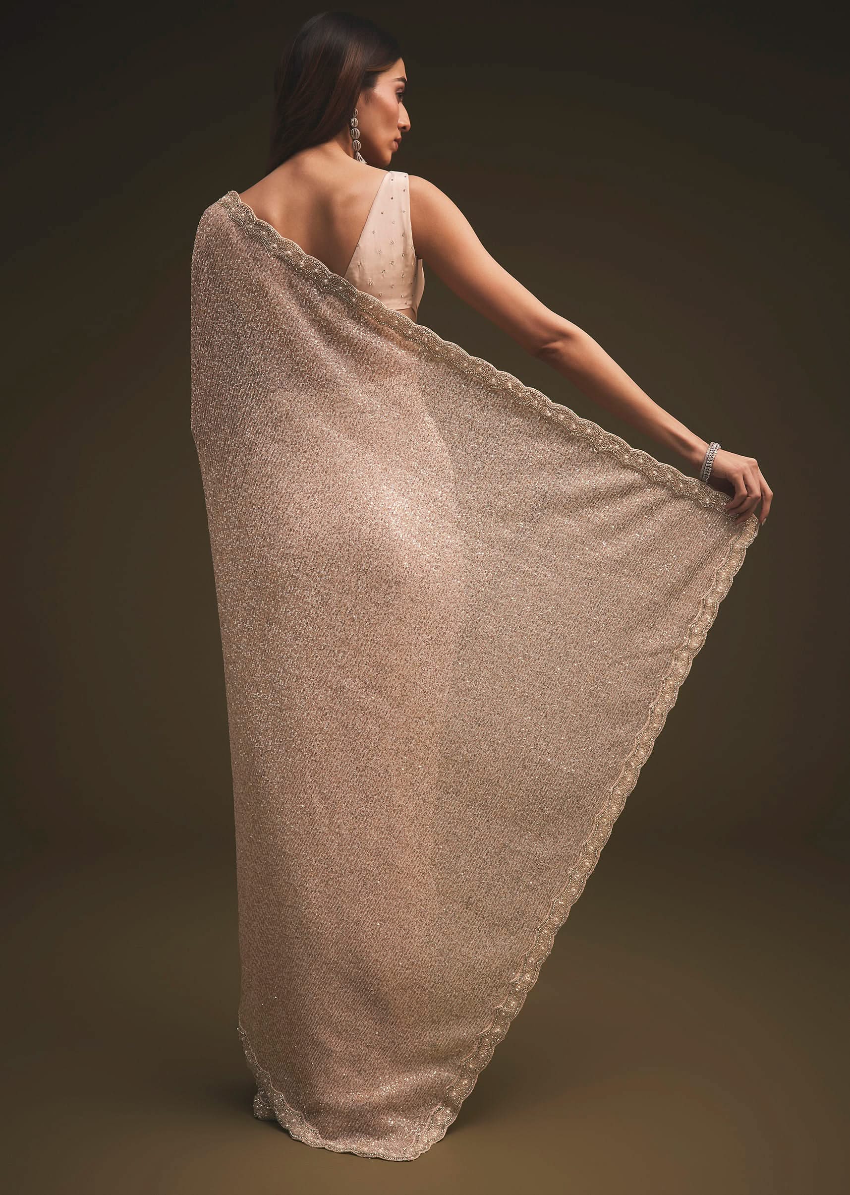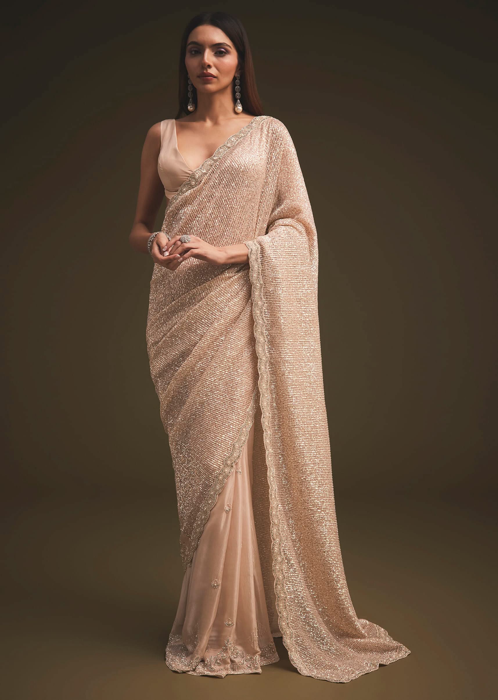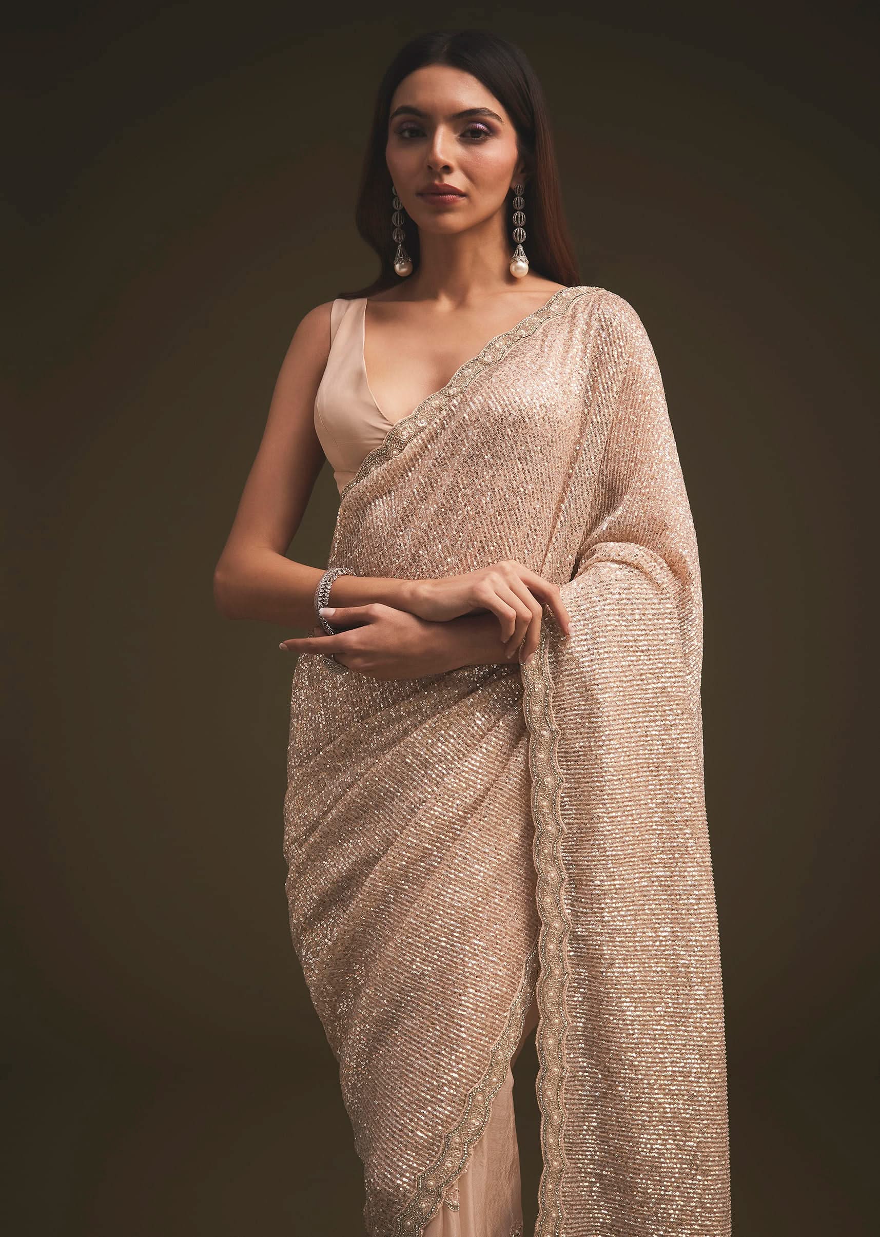 Presenting to you a sparkling sequin saree straight from the house of Ka lki fashion.The saree is set in a gold tone.The saree is fabricated in sequin fabric.The saree has a rich border, with pearls, sequins, cut-dana, and stone intricate detailing all over.It comes with a matching unstitched blouse.NOTE - The blouse worn by the model is designed by our team for styling purposes.You can get your hands on designer blouses by clicking on the blouse link.You can also get matching shapewear as our stylists suggested for the perfect look. Awarded as the Most Trusted Brand, we're delivering styles you love, just as promised.