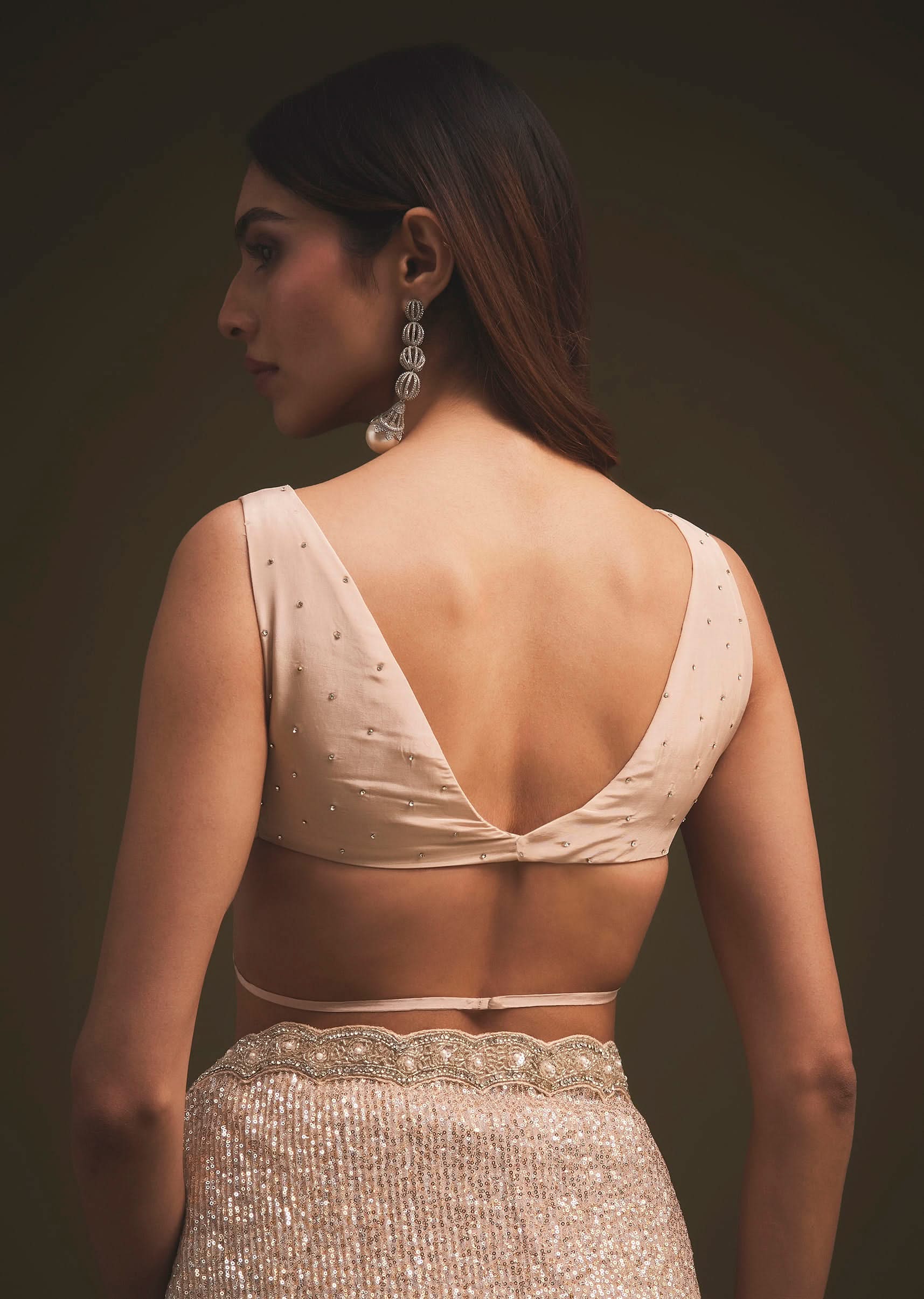 A mesmerizing glam look is promised with this beautiful sequins saree from Kalki. Wear it for the next cocktail or reception with some statement earrings and an arm candy for the perfect look.