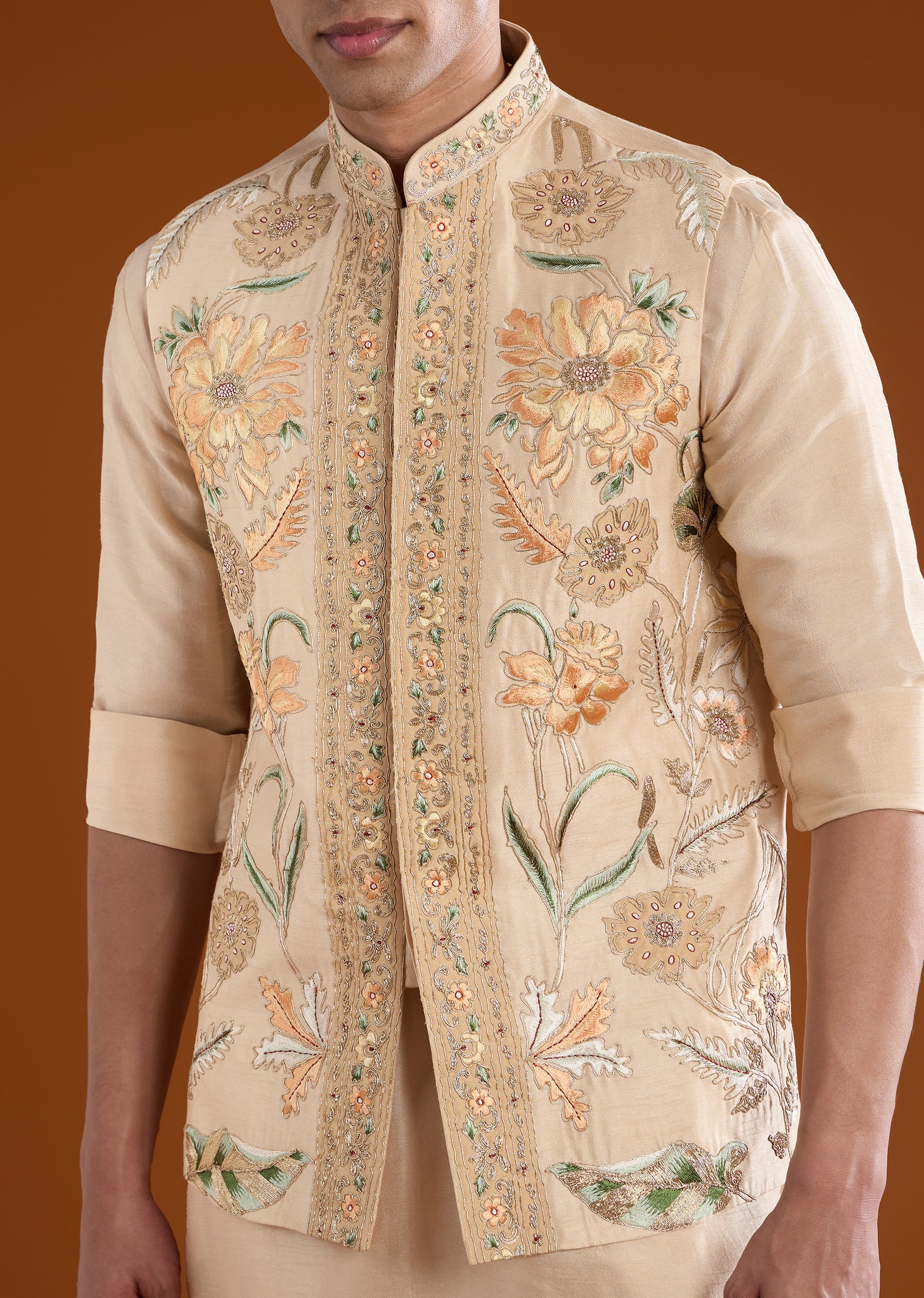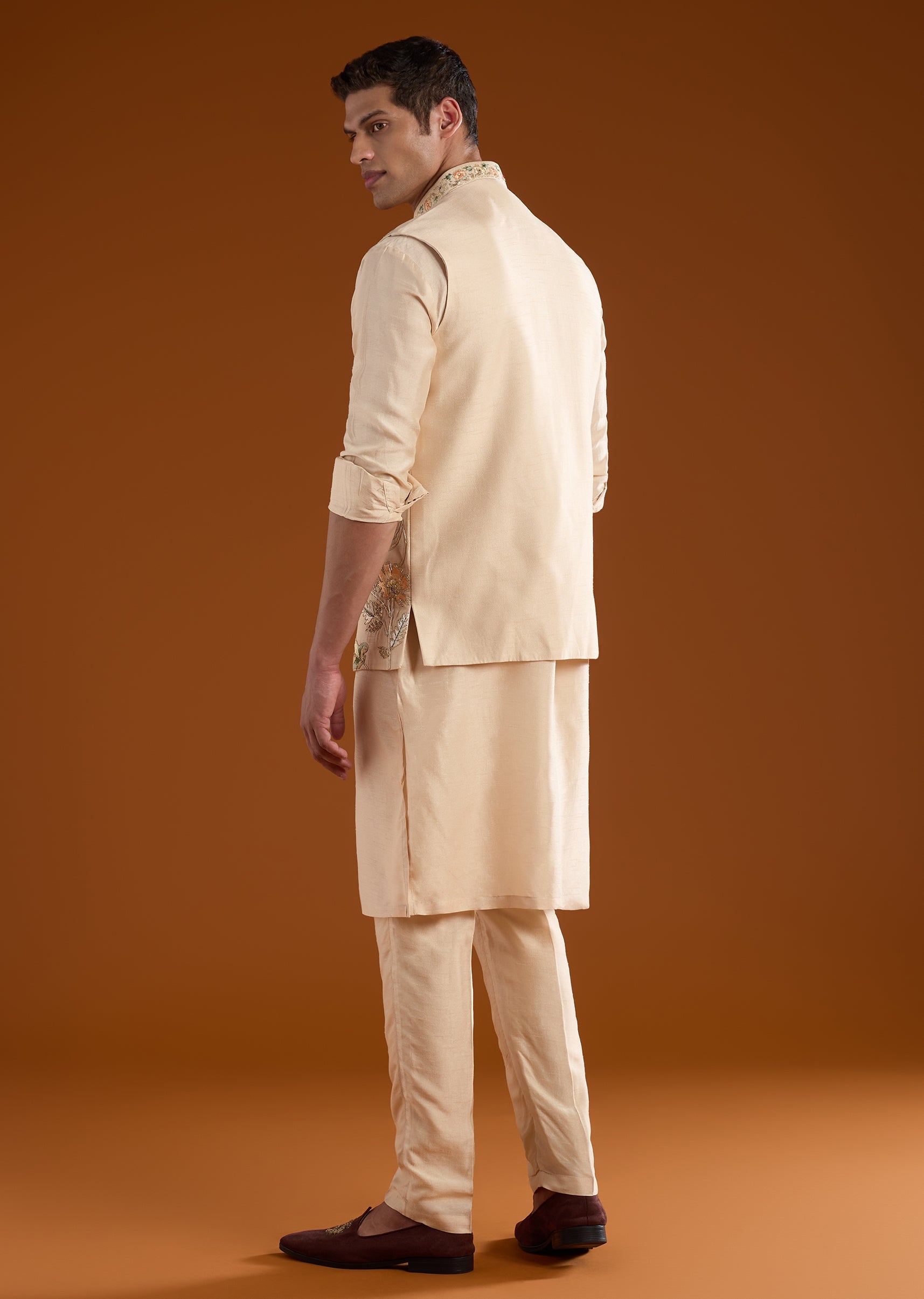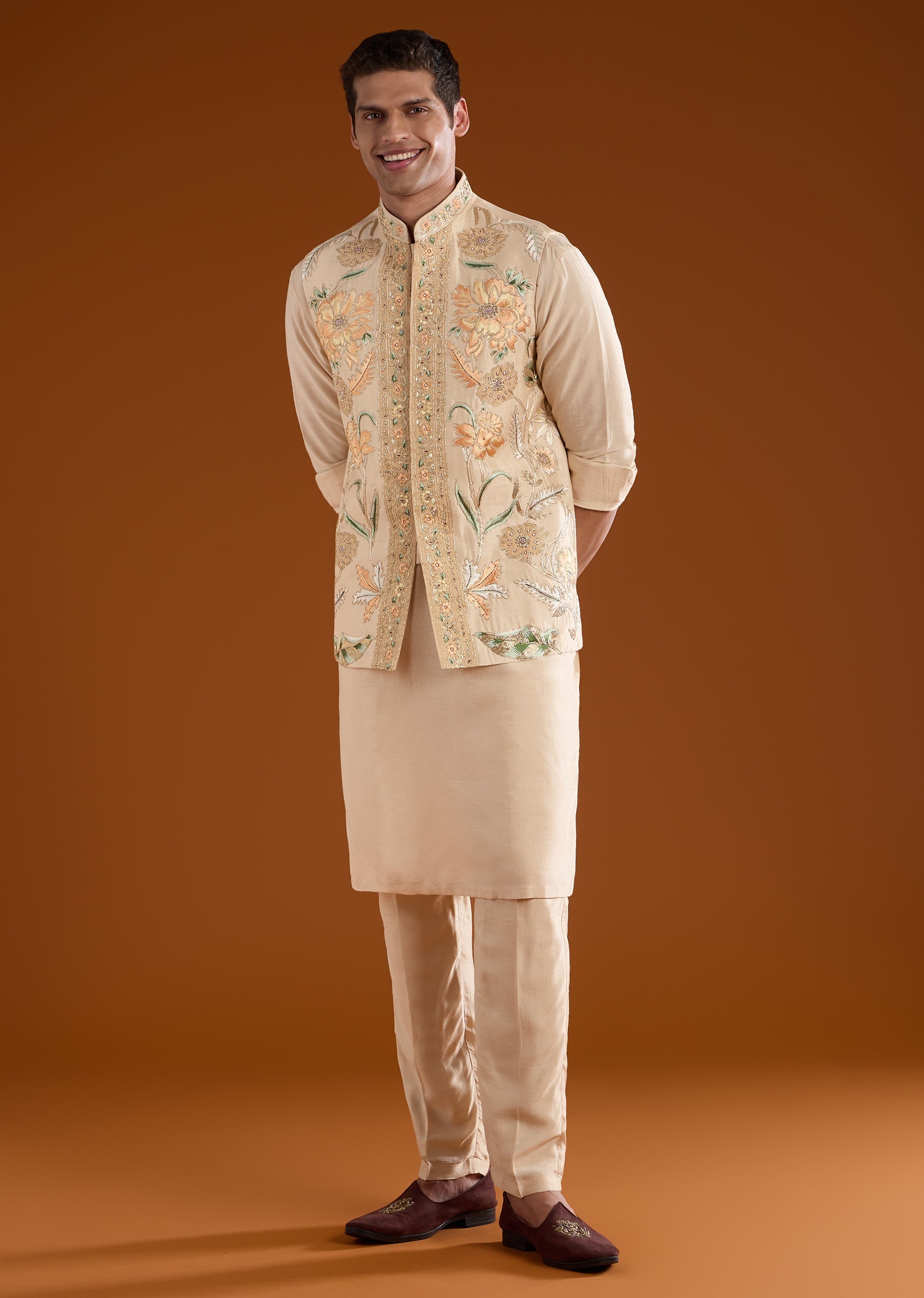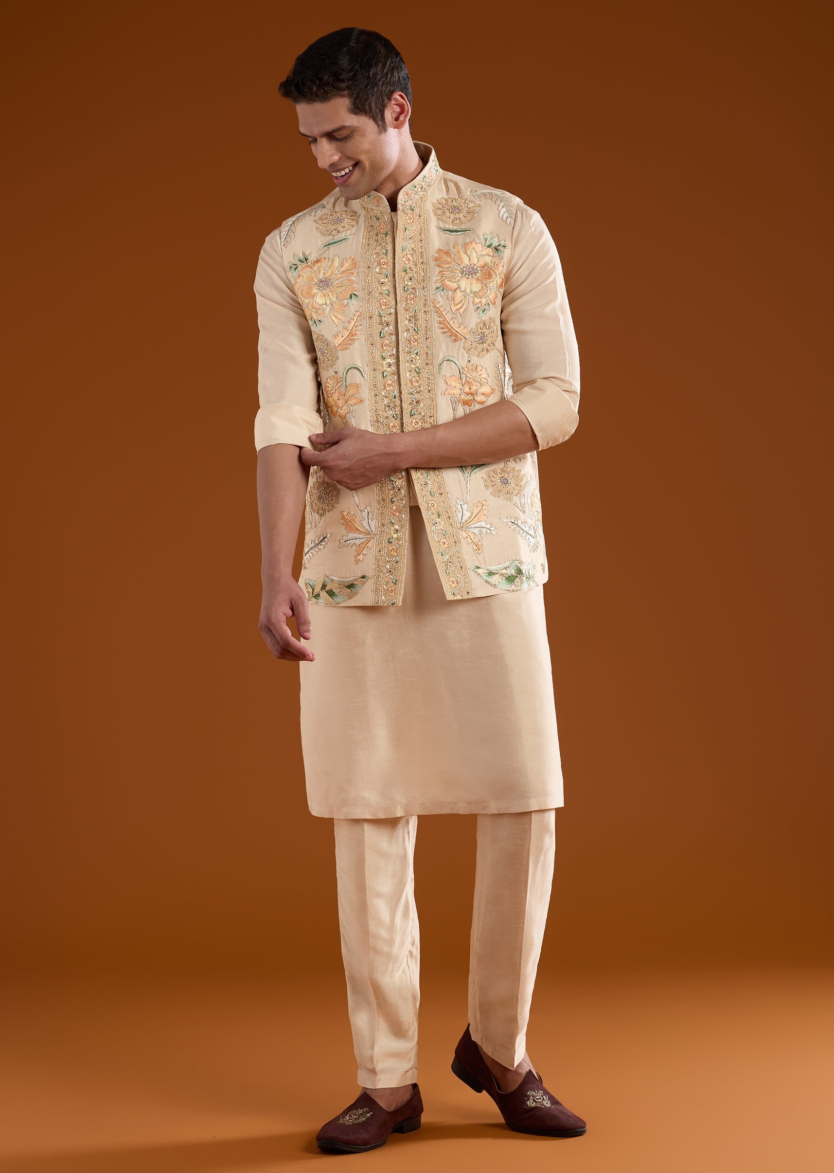 Elegant detailing and classic structure come together in this silk and art silk jacket kurta set. The ensemble is enhanced with intricate thread and resham embroidery, complemented by refined motifs and beadwork for a subtle festive sheen. Full sleeves and a mandarin collar lend a sharp, composed silhouette, while the layered jacket adds depth and sophistication. Paired with a coordinated kurta and pants, this set is ideal for weddings, festive occasions, and formal celebrations.Awarded as the Most Trusted Brand, we're delivering styles you love, just as promised.