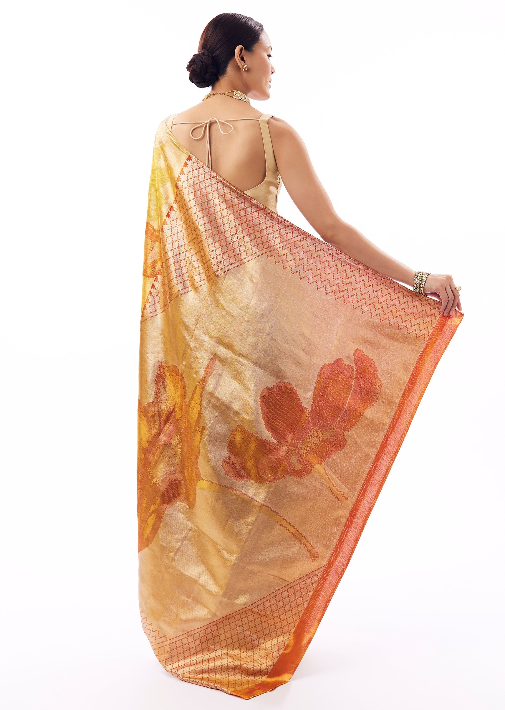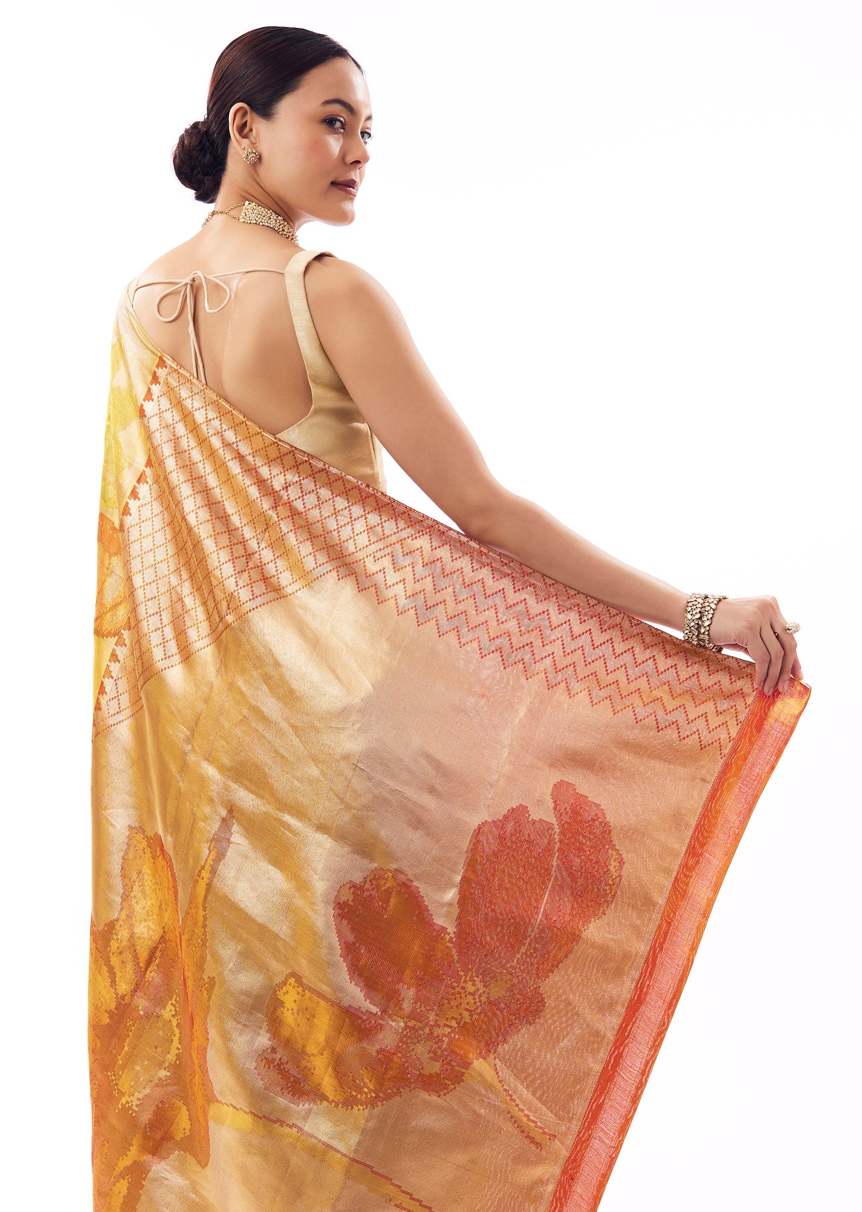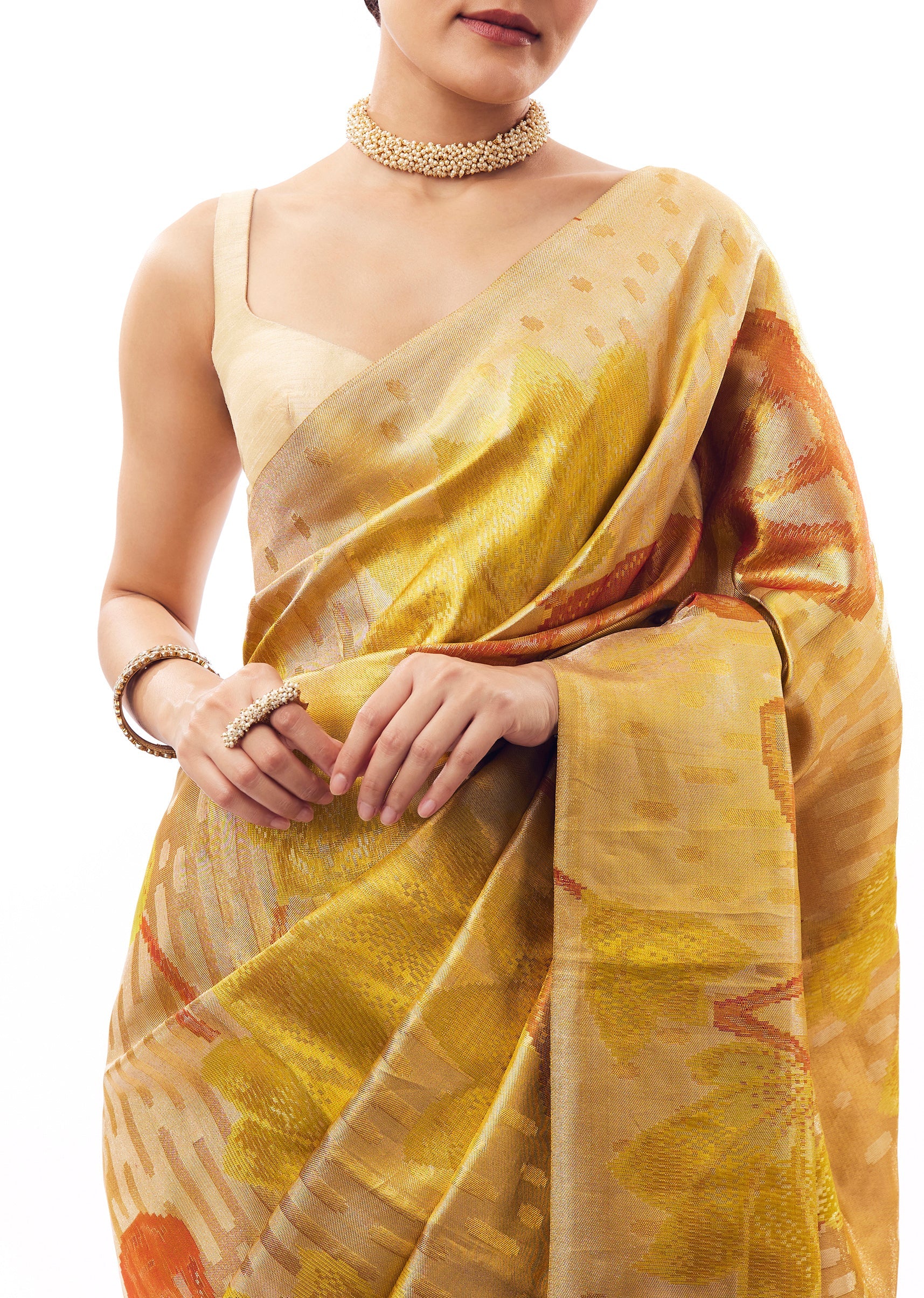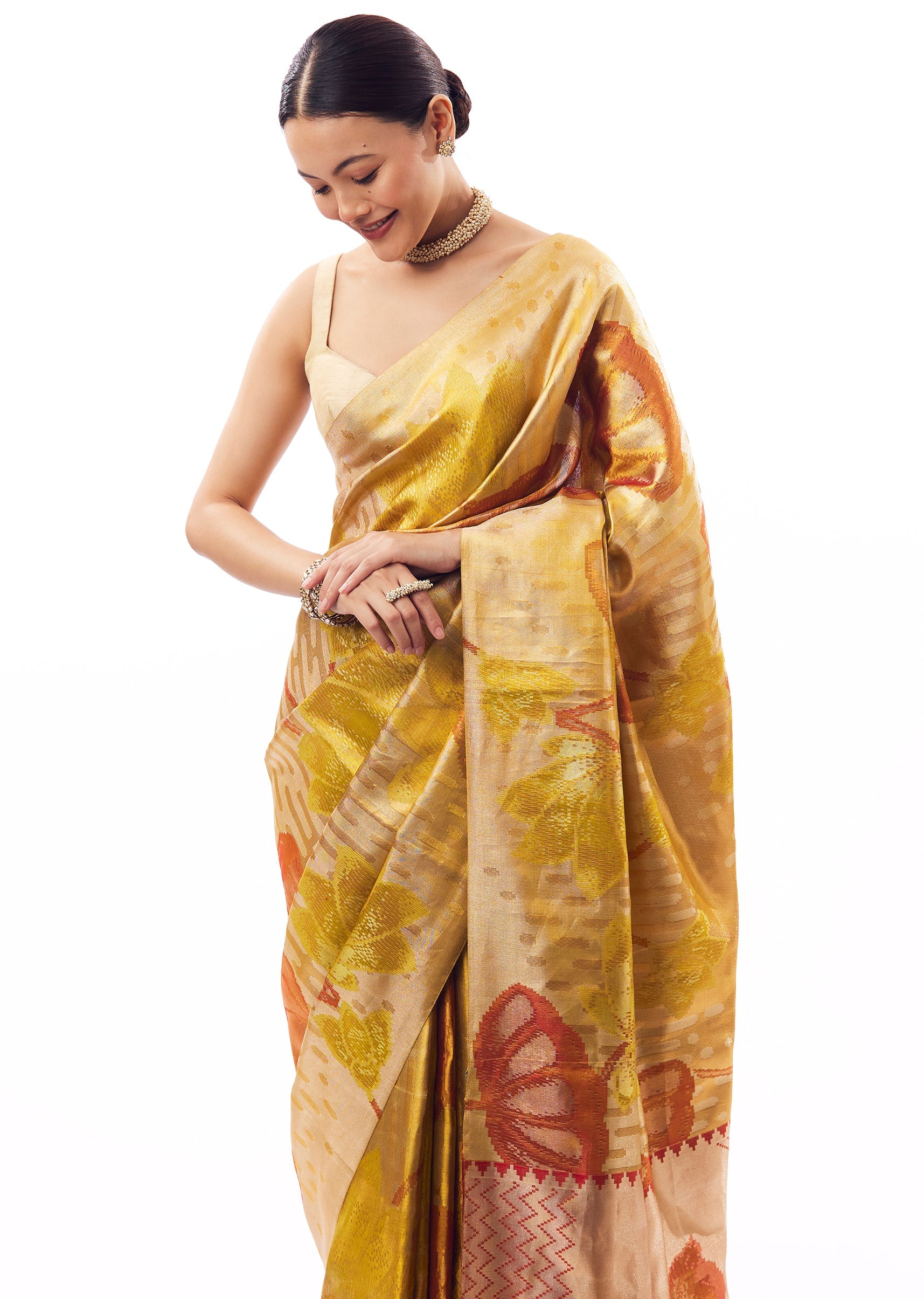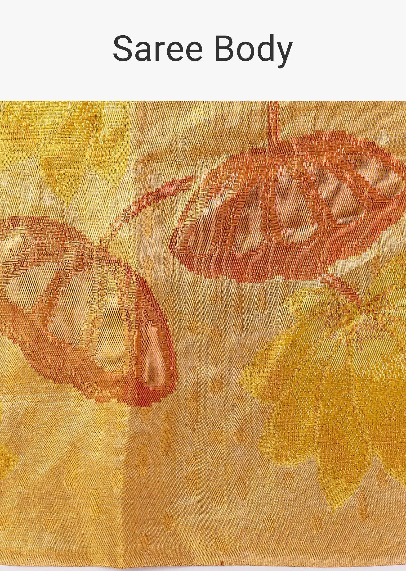 Yellow-golden South silk saree with floral weaving highlighted in coral red, designed with a clean, borderless finish. Comes with unstitched blouse fabric. ,Awarded as the Most Trusted Brand, we're delivering styles you love, just as promised.