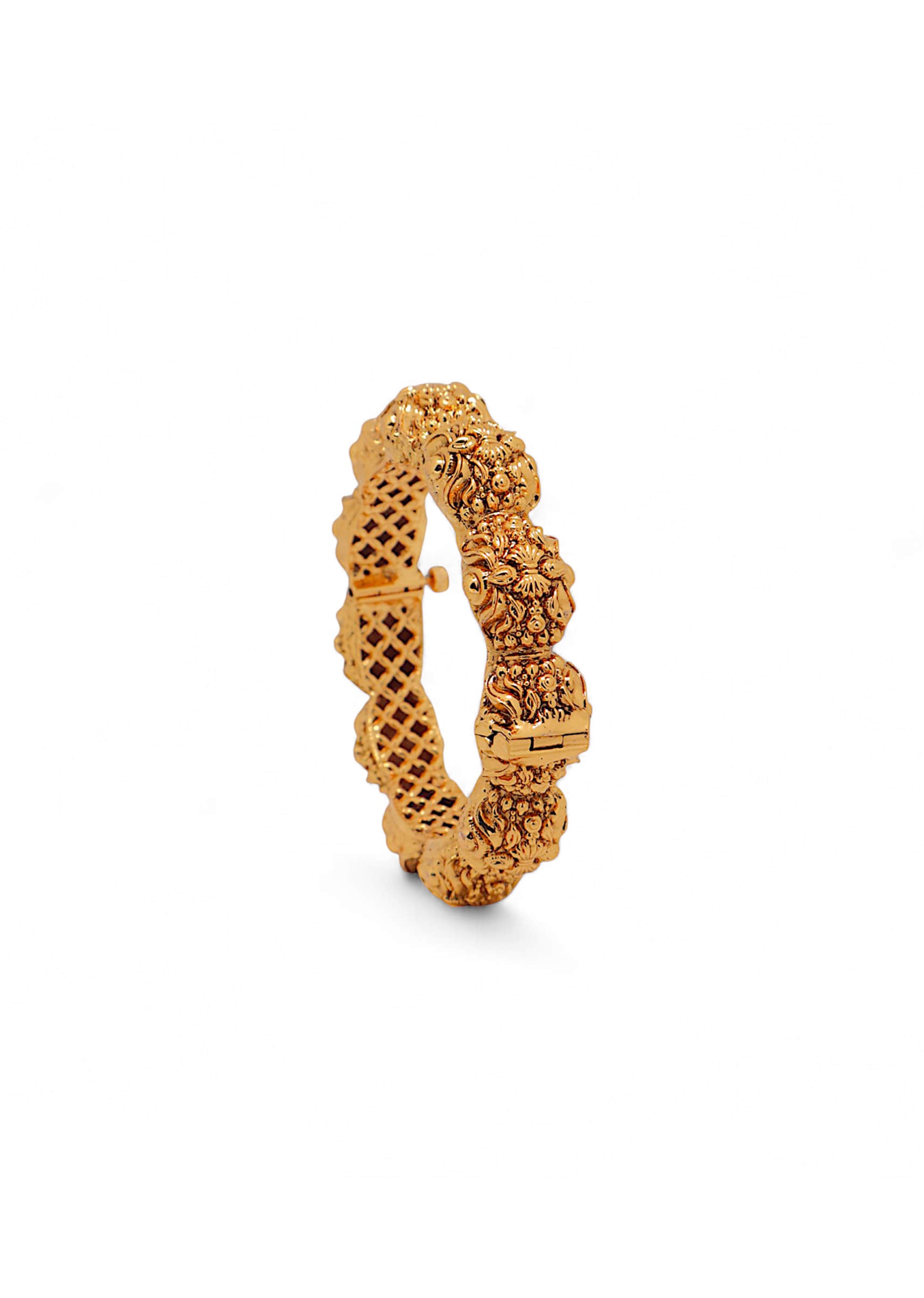 A gold temple bangle featuring intricate traditional motifs and detailed craftsmanship, exuding classic elegance. Perfect for elevating bridal, festive, or traditional ethnic ensembles with a regal touch. Awarded as the... More Product Details