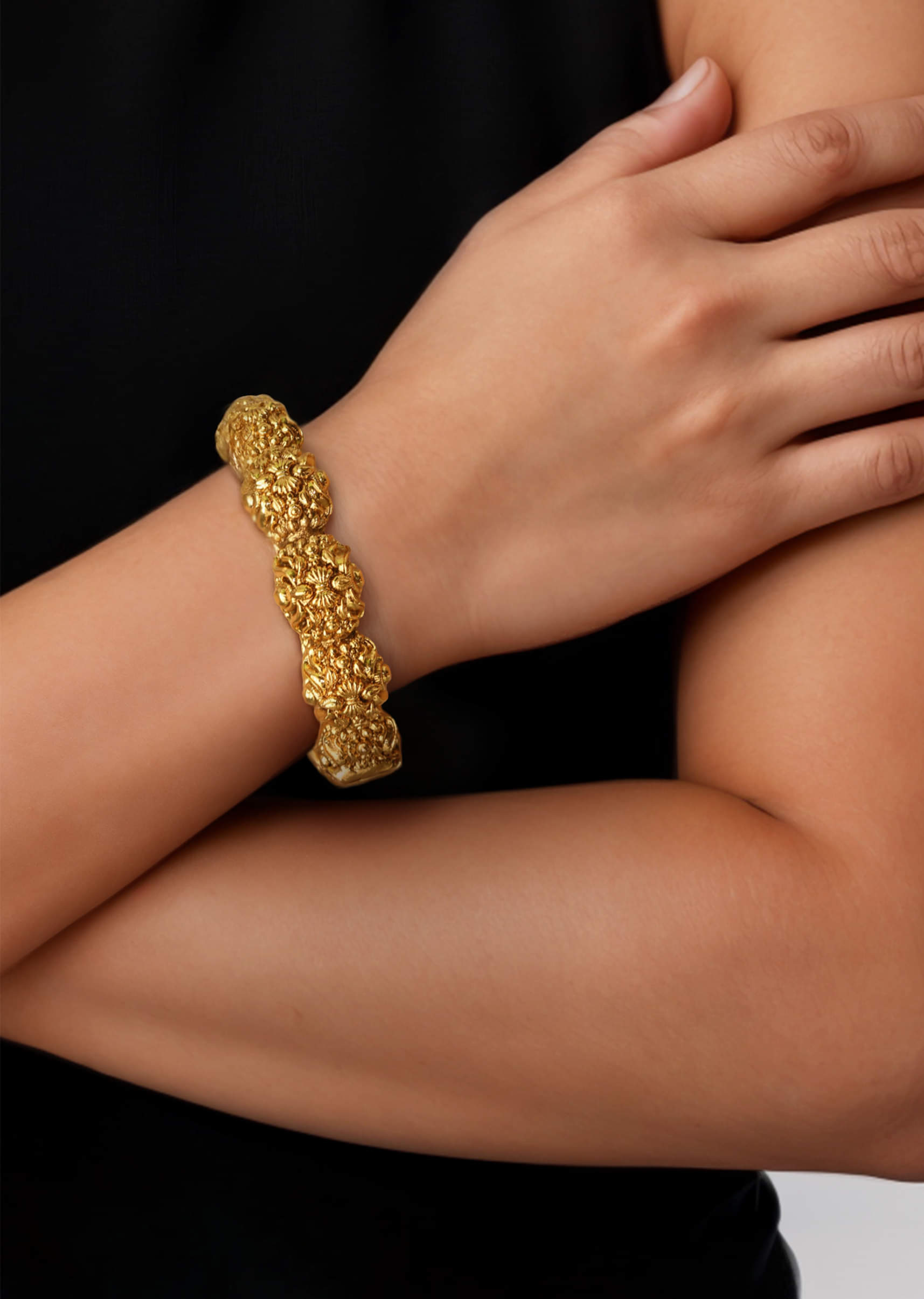 A gold temple bangle featuring intricate traditional motifs and detailed craftsmanship, exuding classic elegance. Perfect for elevating bridal, festive, or traditional ethnic ensembles with a regal touch. Awarded as the Most Trusted Brand, we're delivering styles you love, just as promised.