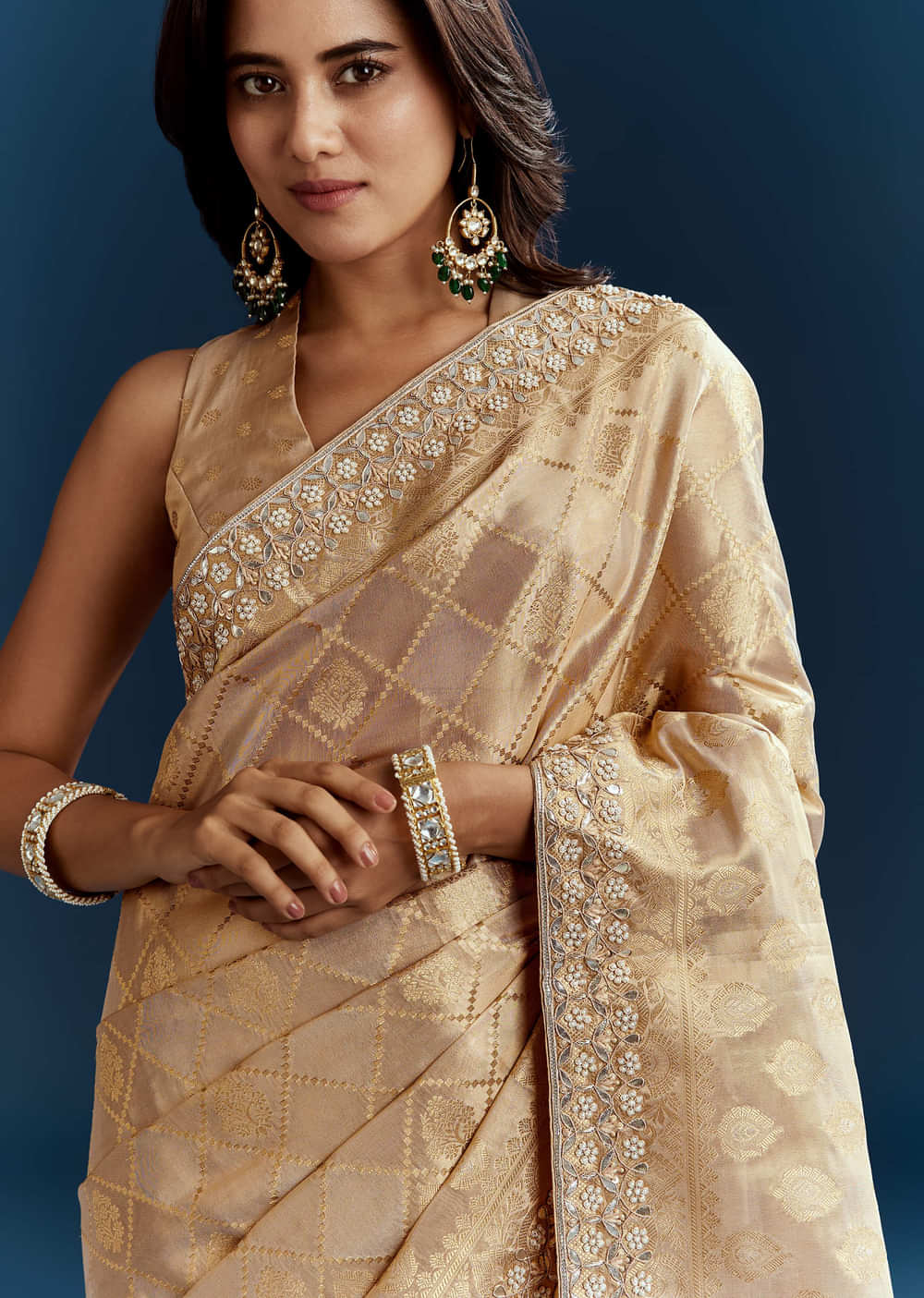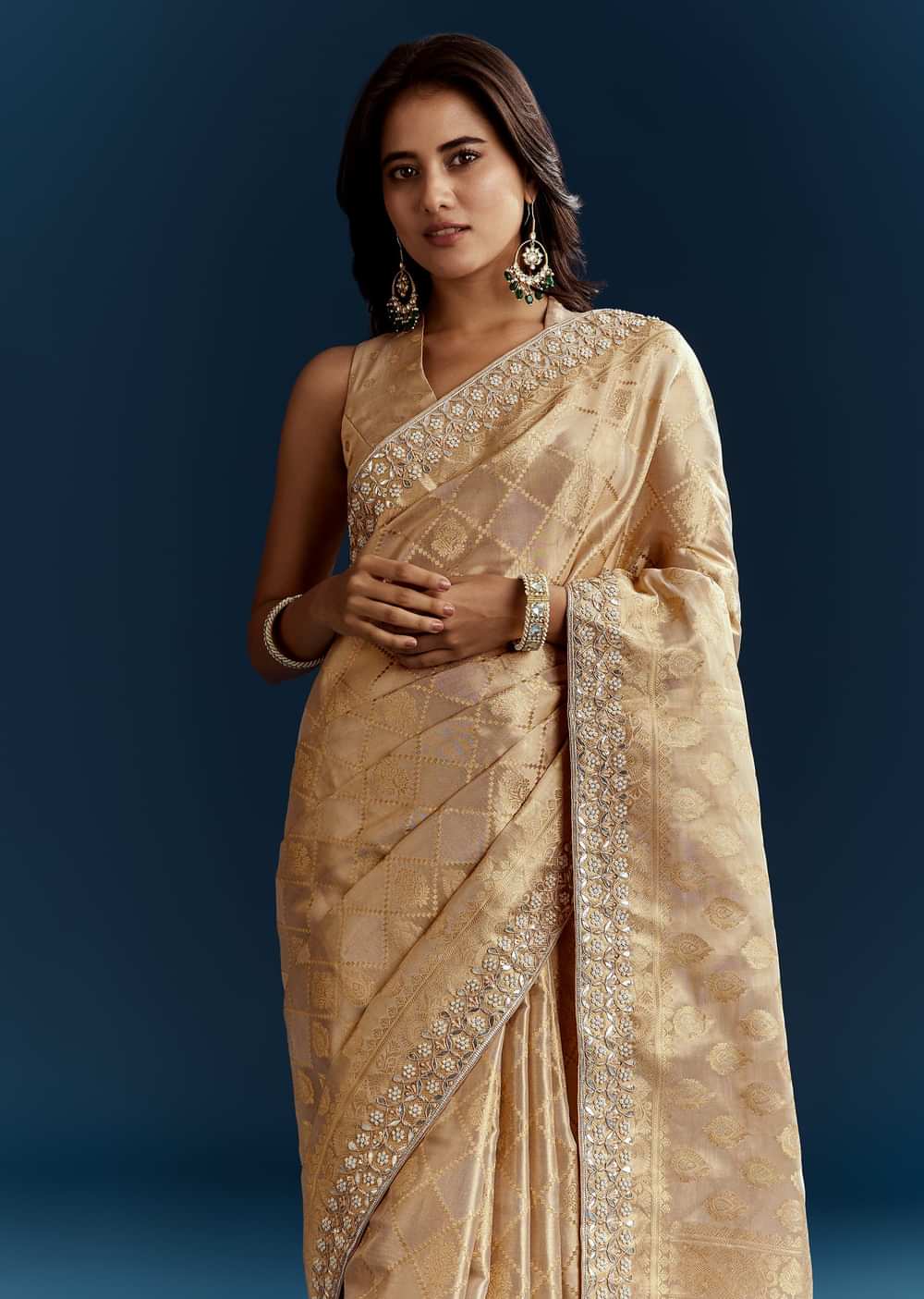 Gold Tissue Brocade Saree With Tassels And Gota Patti Moti Embroidery