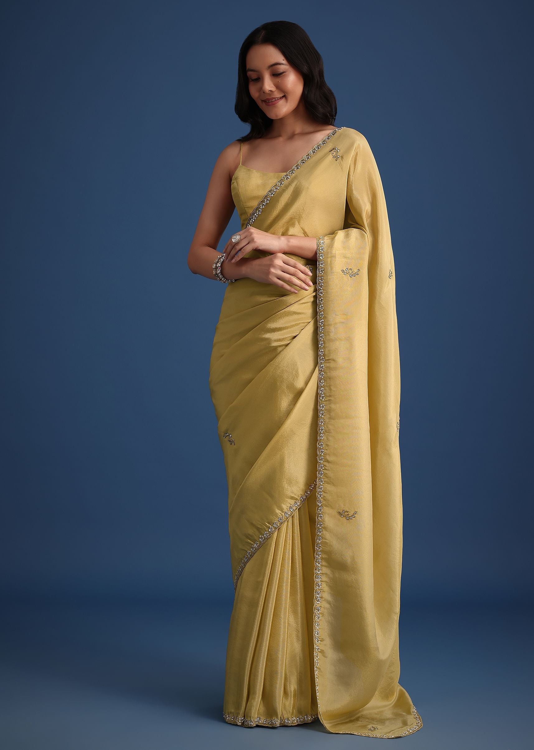 Gold Tissue Saree With Cutdana Embellished Border