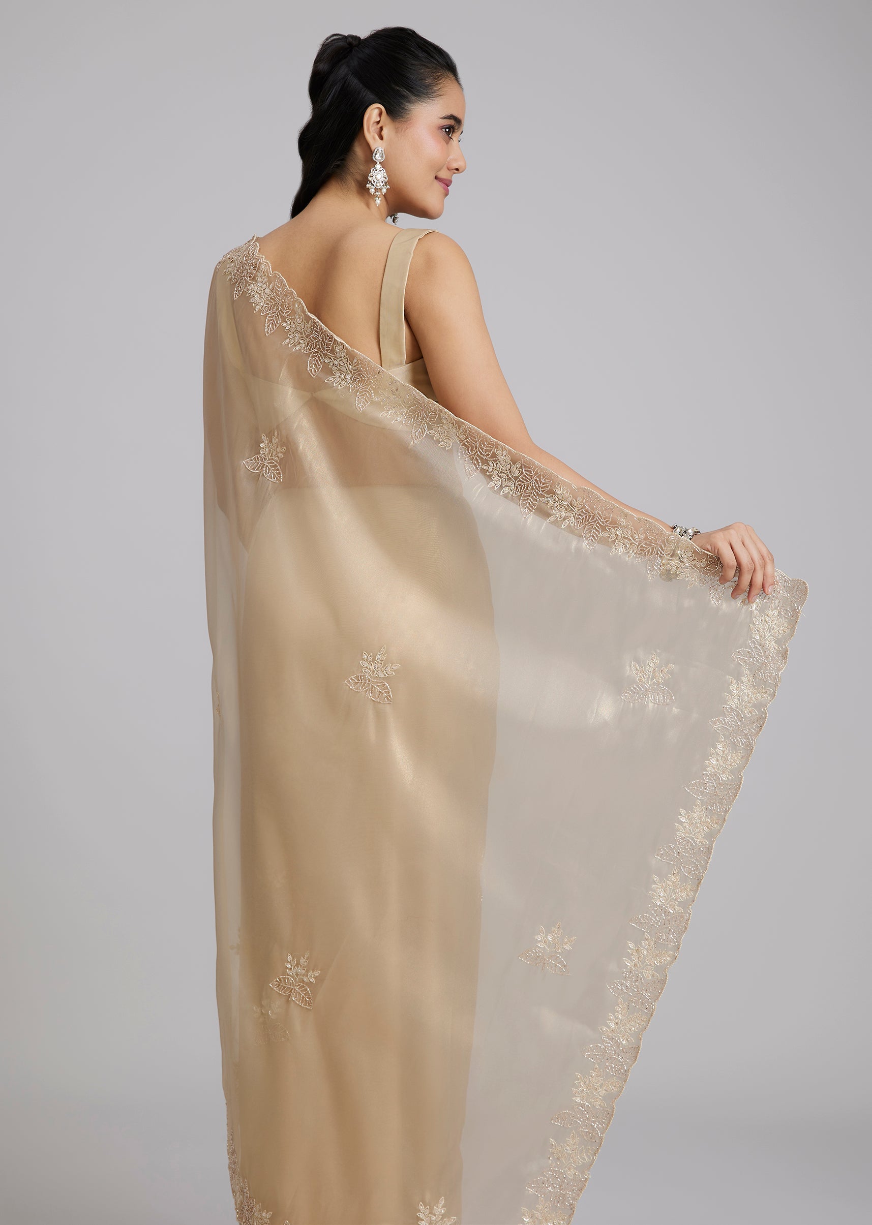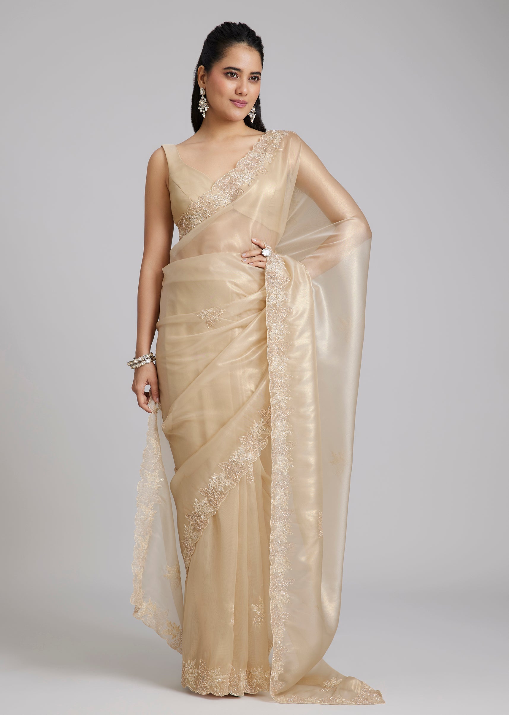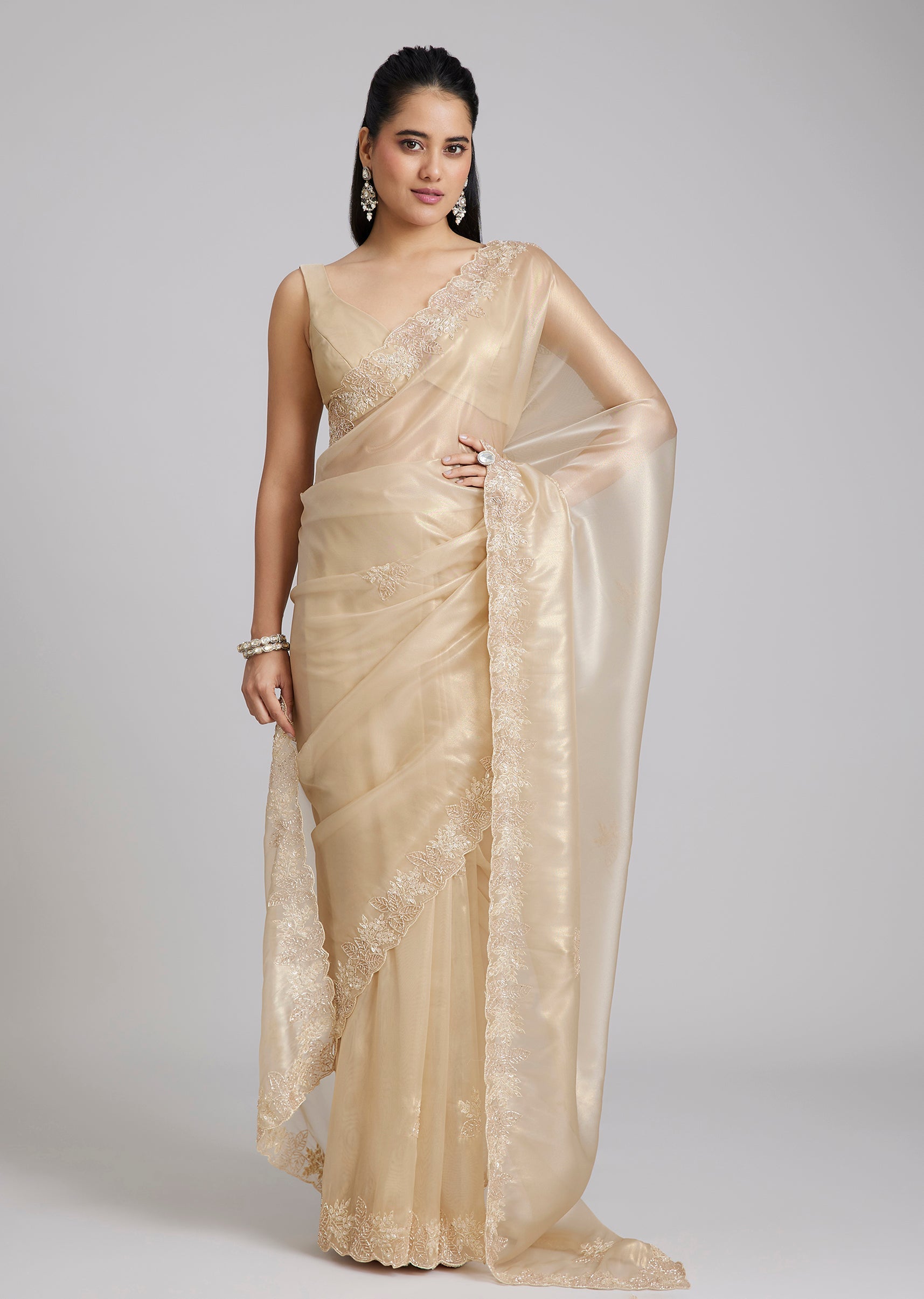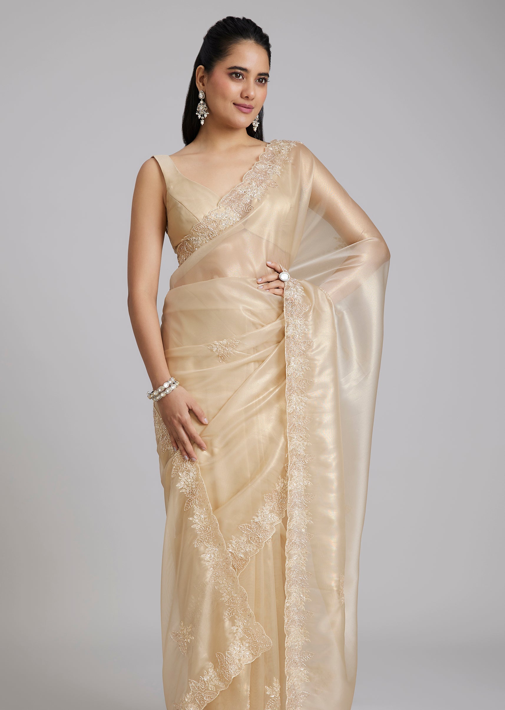 A festive gold tissue saree featuring a floral cutwork border and embroidered buttis highlighted with cut dana, sequins and beads. Rich yet wearable, it’s perfect for poojas and celebratory gatherings. Awarded as the Most Trusted Brand, we're delivering styles you love, just as promised.