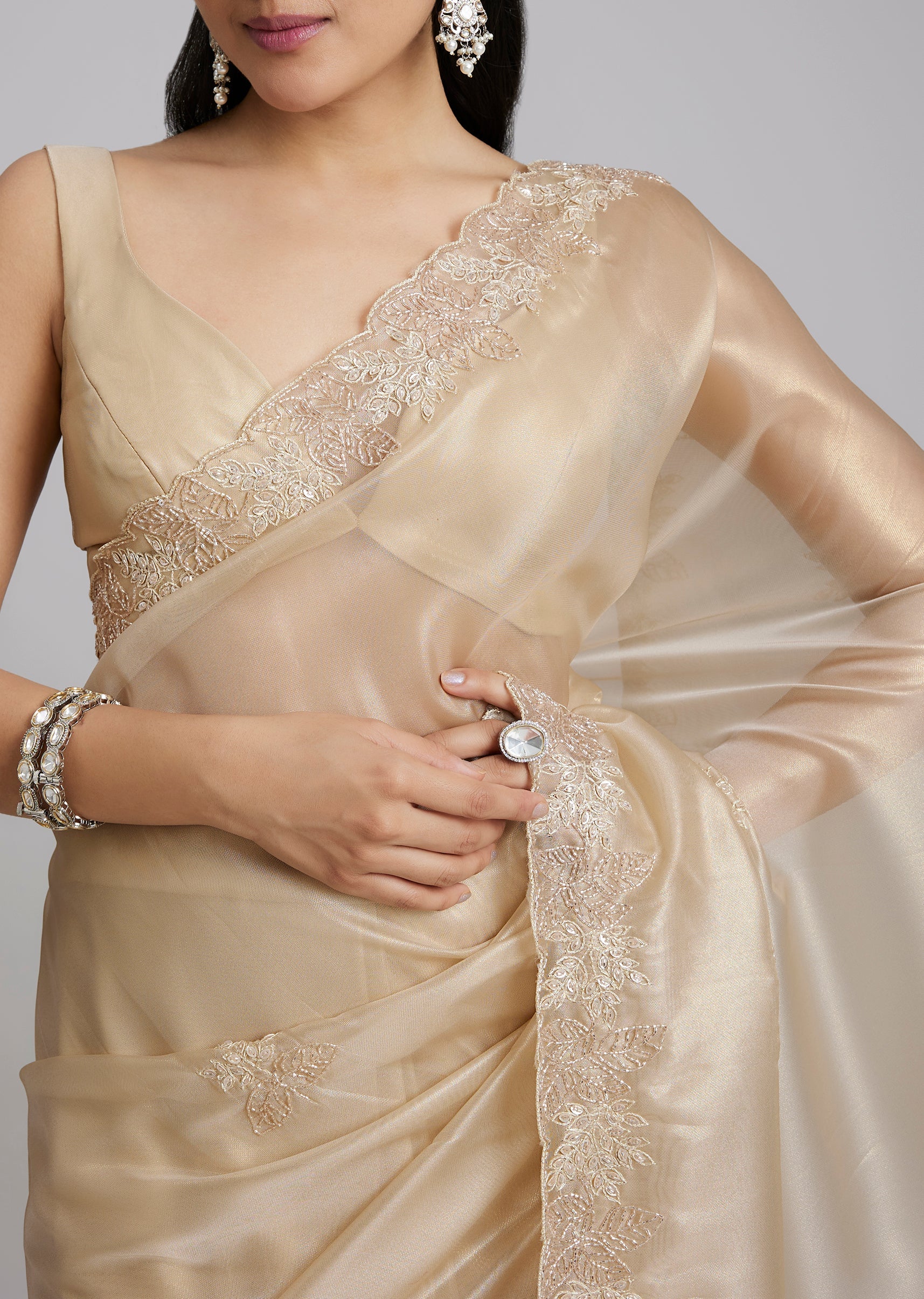 A festive gold tissue saree featuring a floral cutwork border and embroidered buttis highlighted with cut dana, sequins and beads. Rich yet wearable, it’s perfect for poojas and celebratory gatherings.... More Product Details