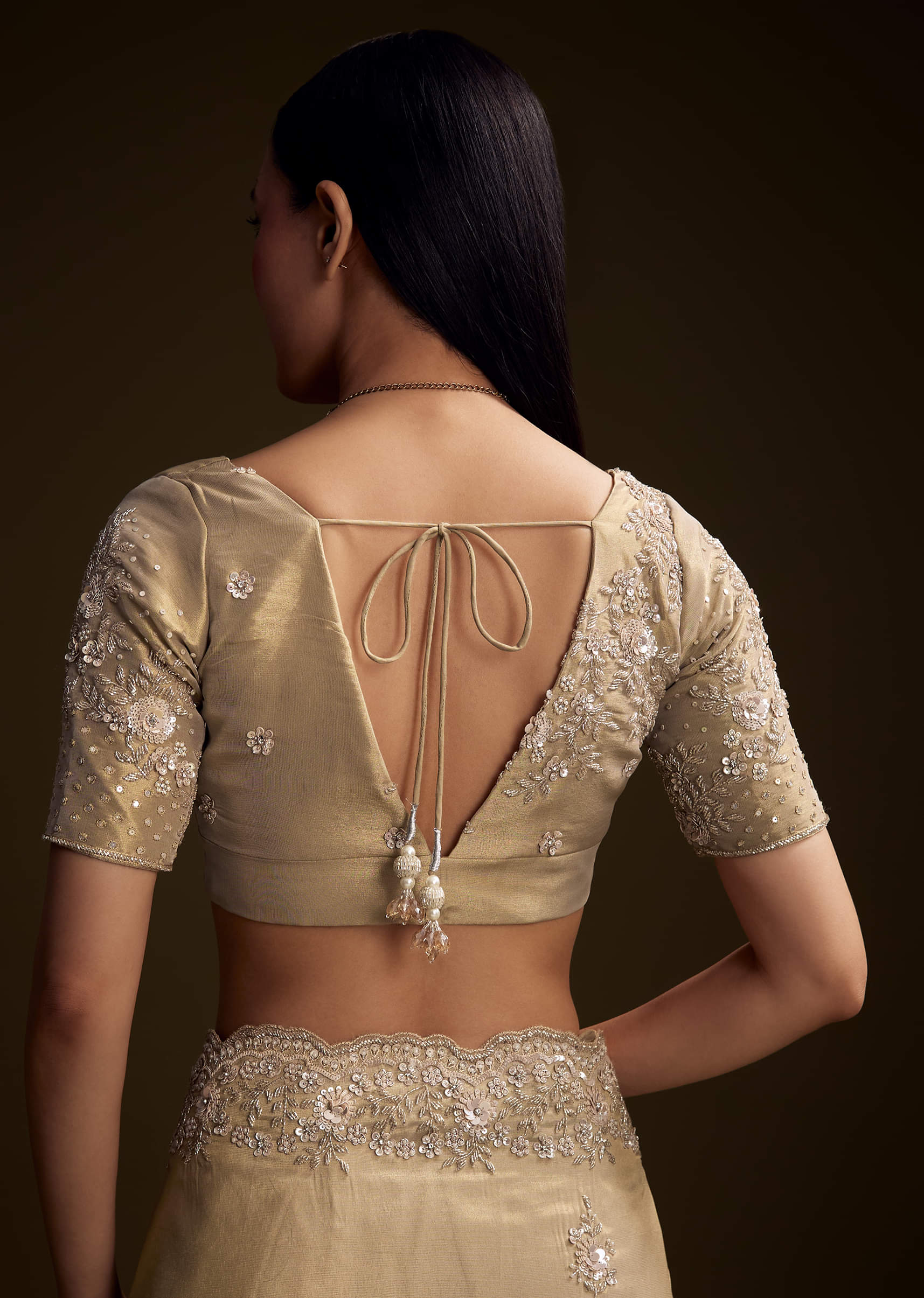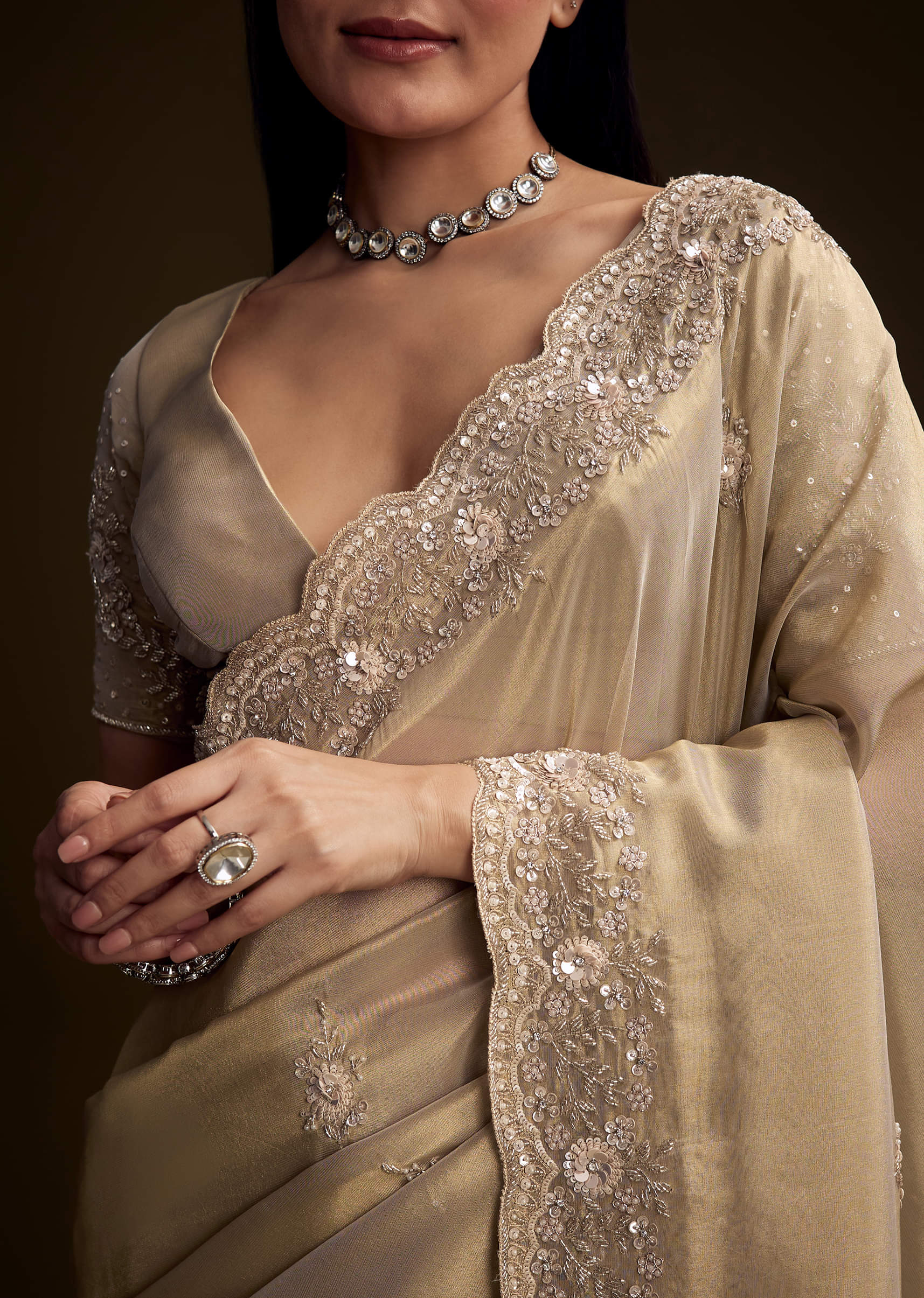 Golden tones bring a regal glow to this tissue saree. The scallop border and blouse are richly embroidered with cutdana, sequins, beads, stones, and buttis. It is made for engagements... More Product Details