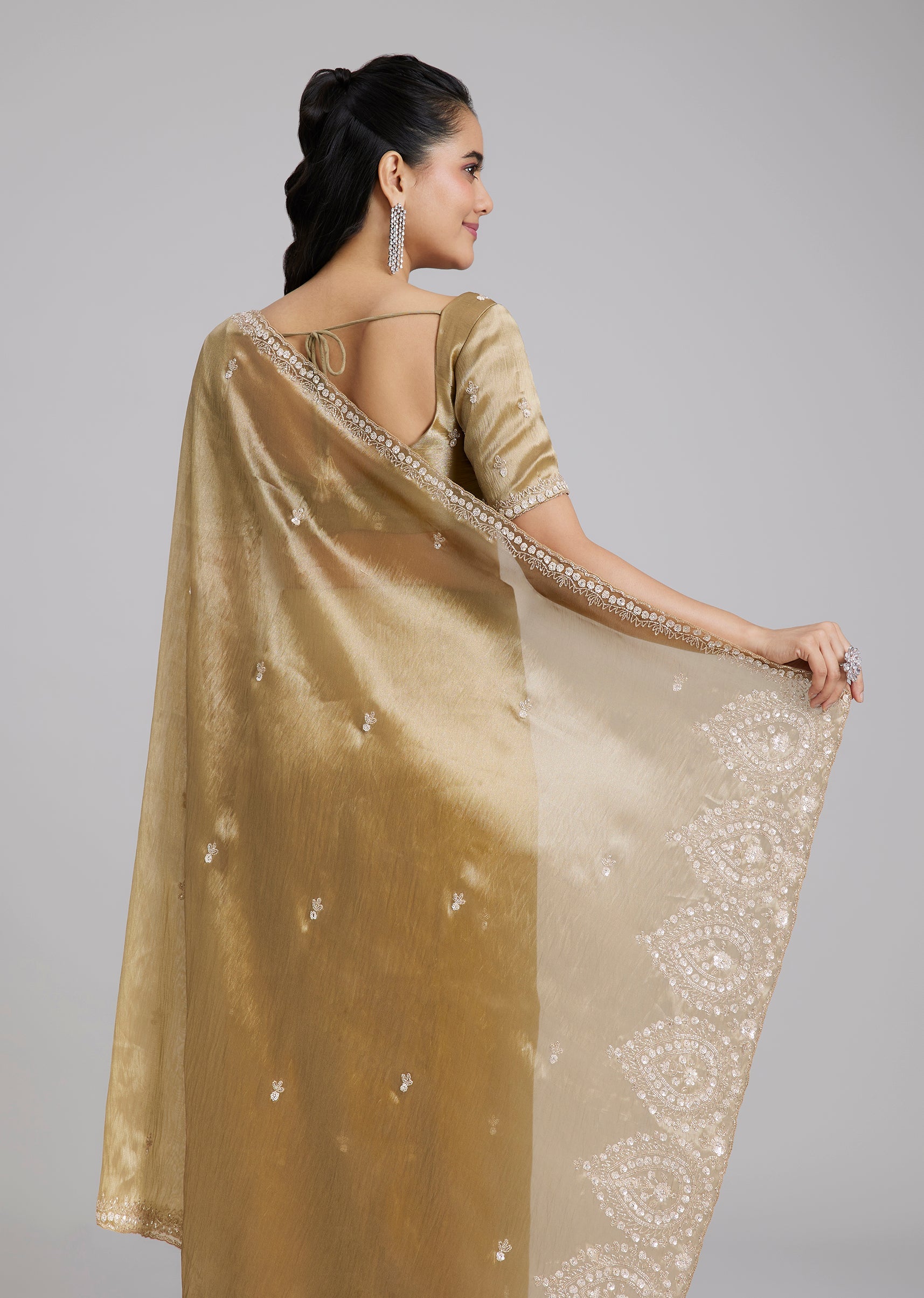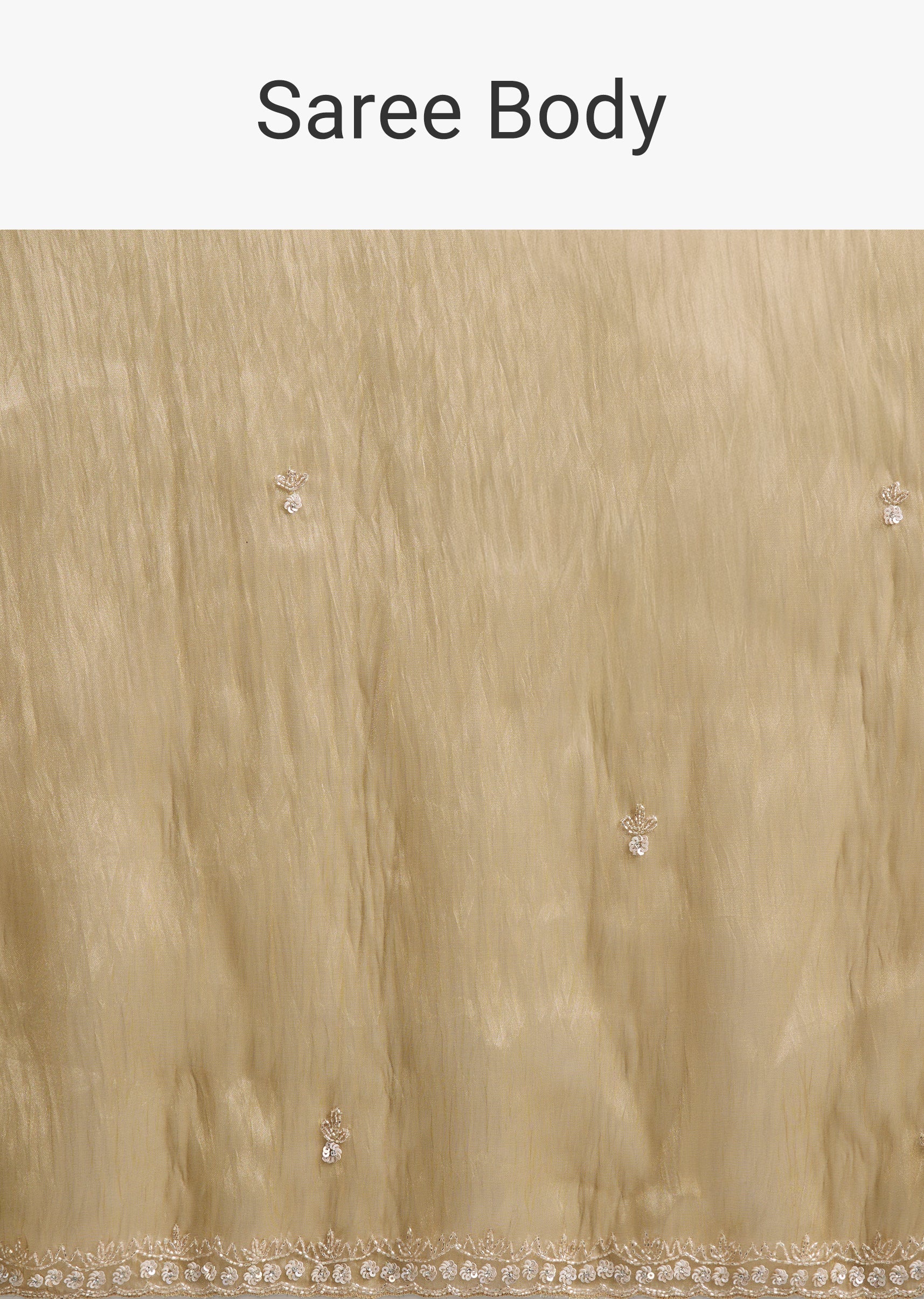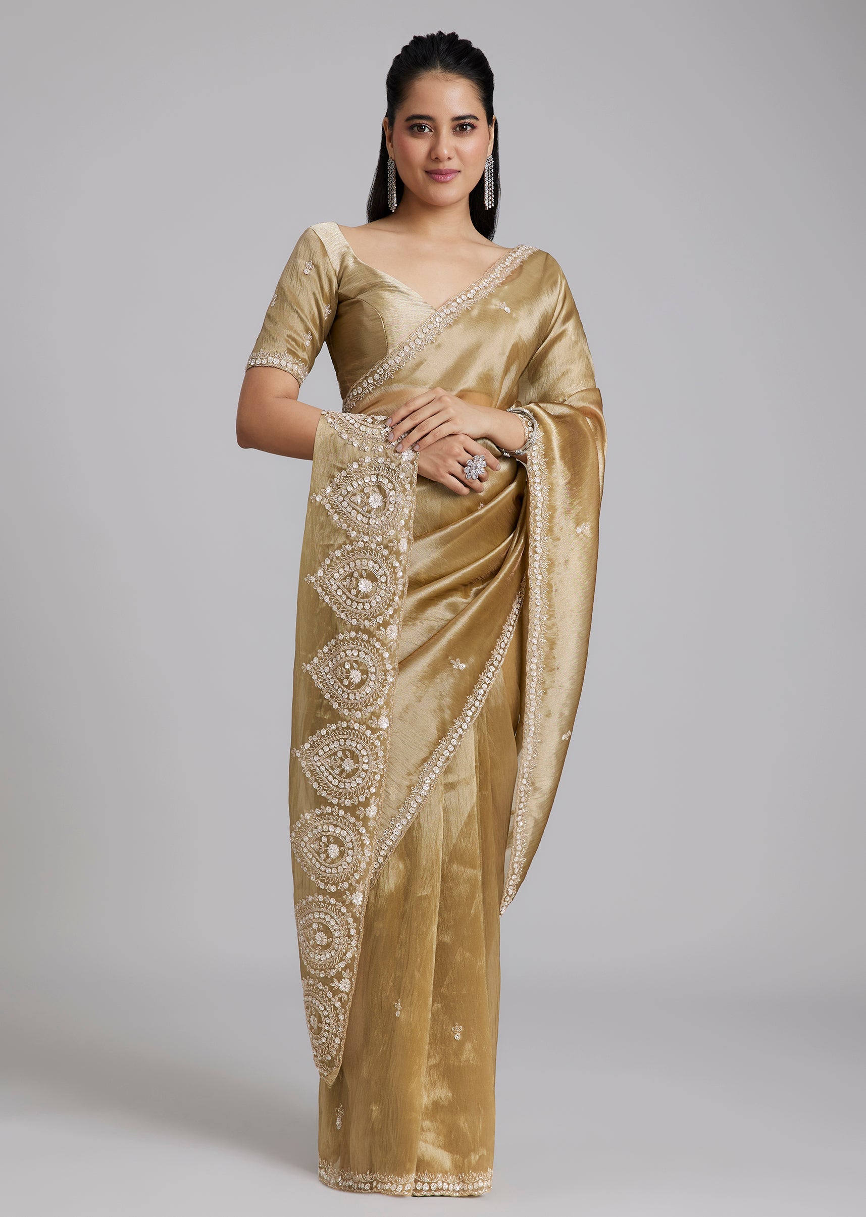 A classic gold tissue silk saree with minimal border and buttis, finished with a heavily embroidered border at the end of the pallu for a statement highlight. Cut dana, sequins... More Product Details
