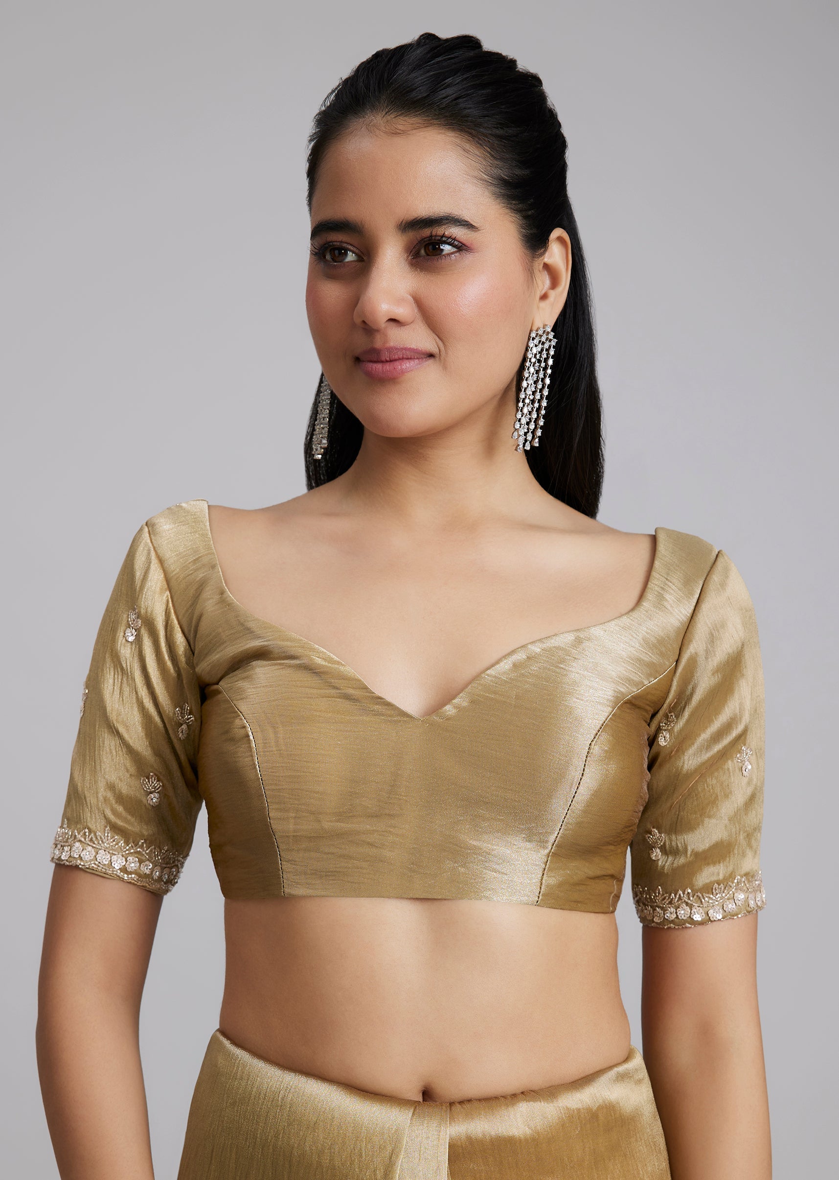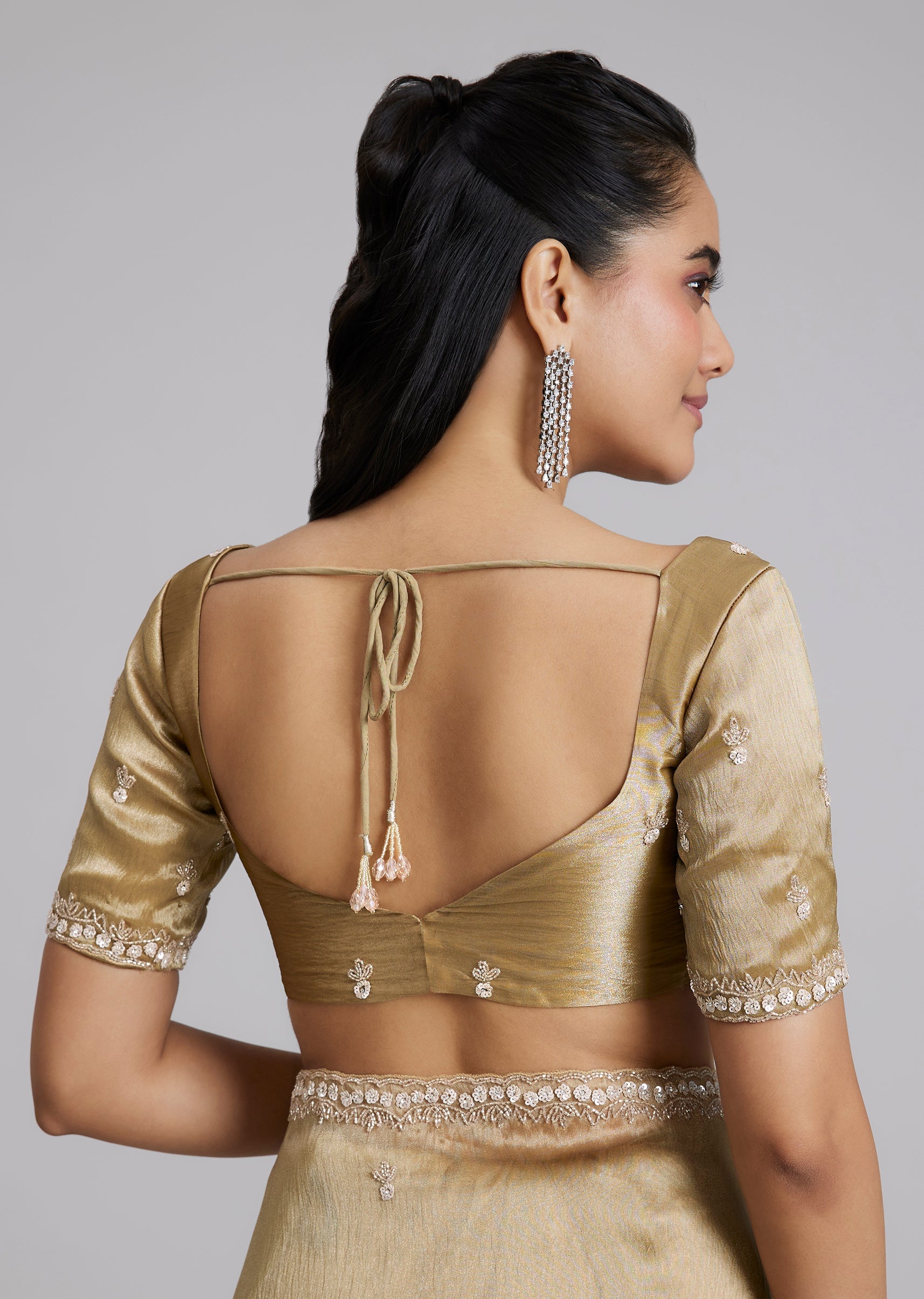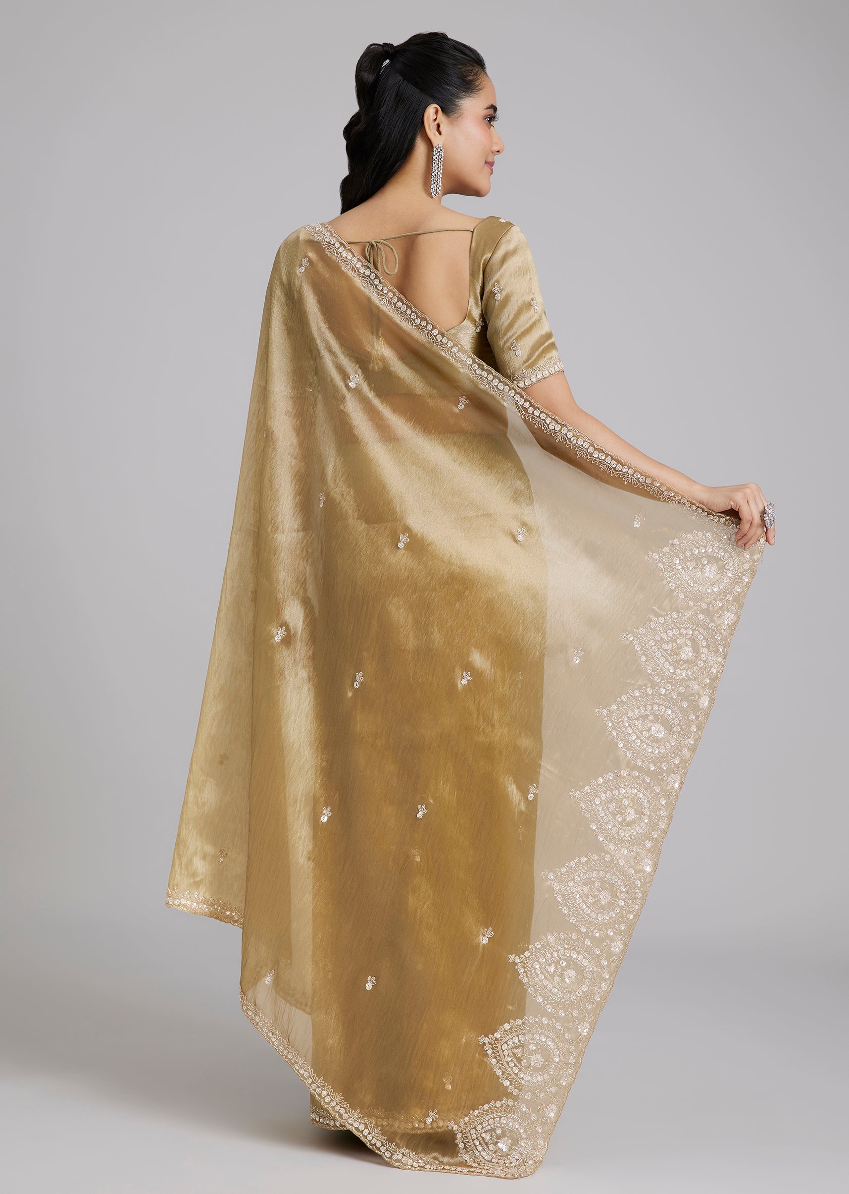 A classic gold tissue silk saree with minimal border and buttis, finished with a heavily embroidered border at the end of the pallu for a statement highlight. Cut dana, sequins... More Product Details