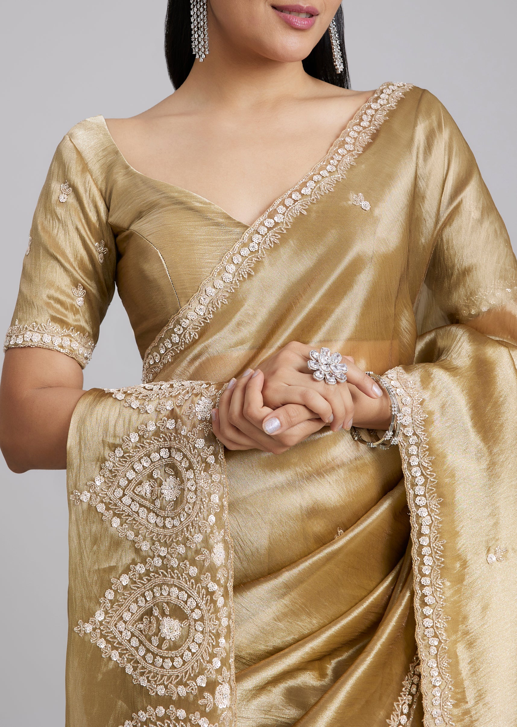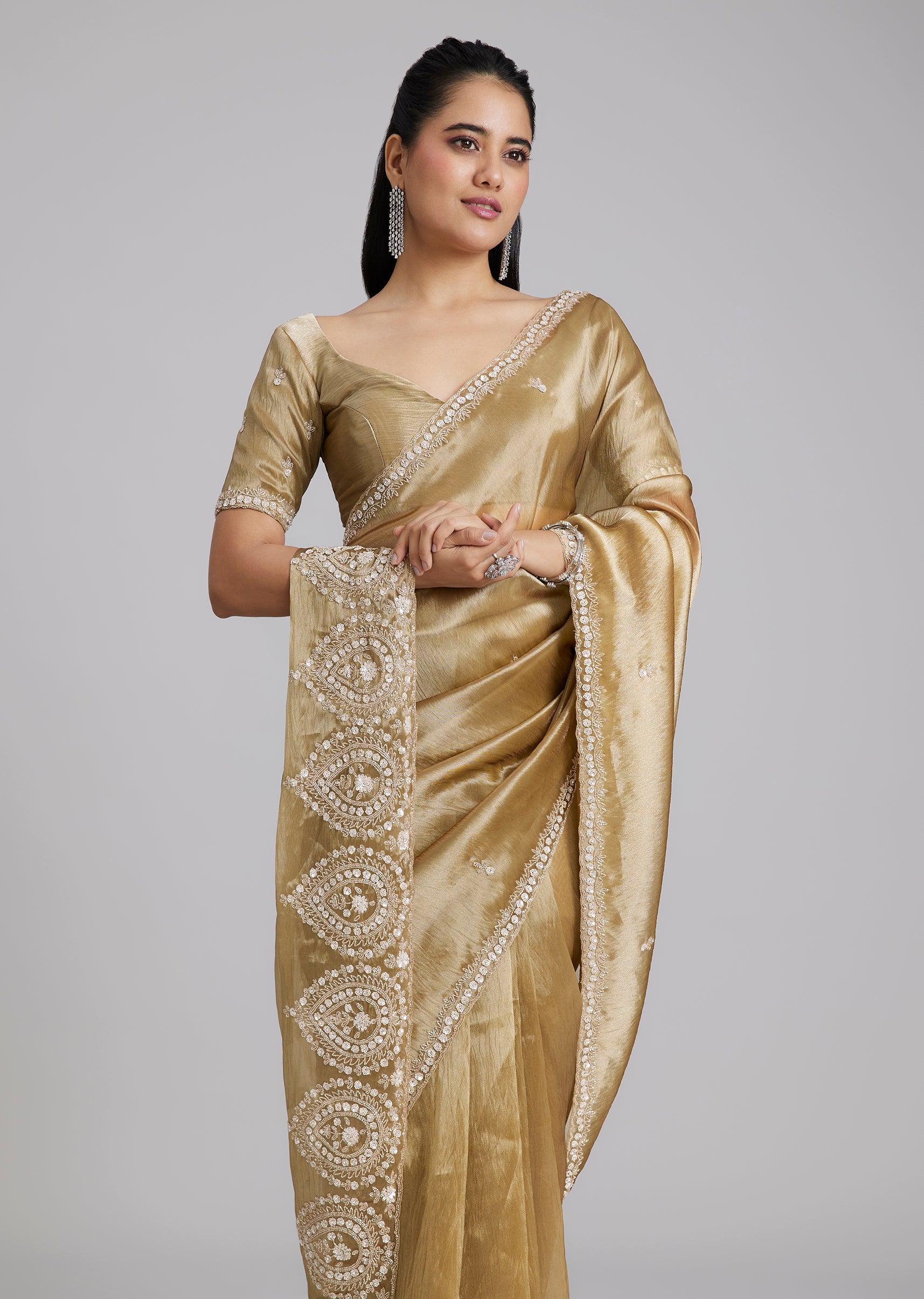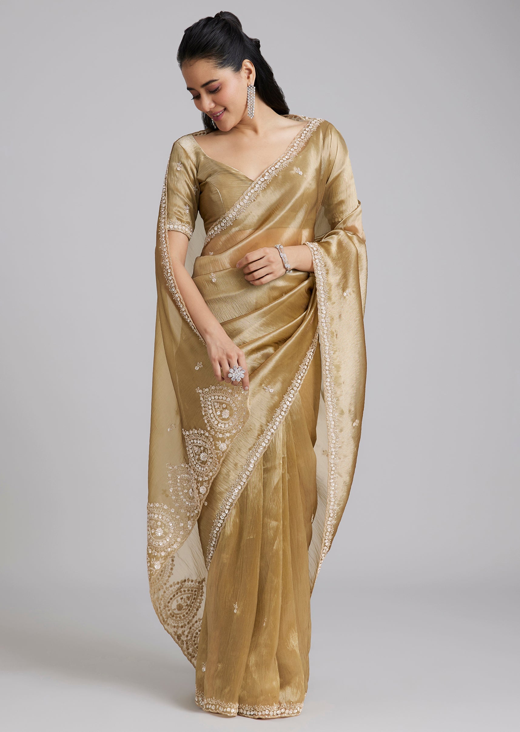 A classic gold tissue silk saree with minimal border and buttis, finished with a heavily embroidered border at the end of the pallu for a statement highlight. Cut dana, sequins and beads add just the right festive shine. Awarded as the Most Trusted Brand, we're delivering styles you love, just as promised.
