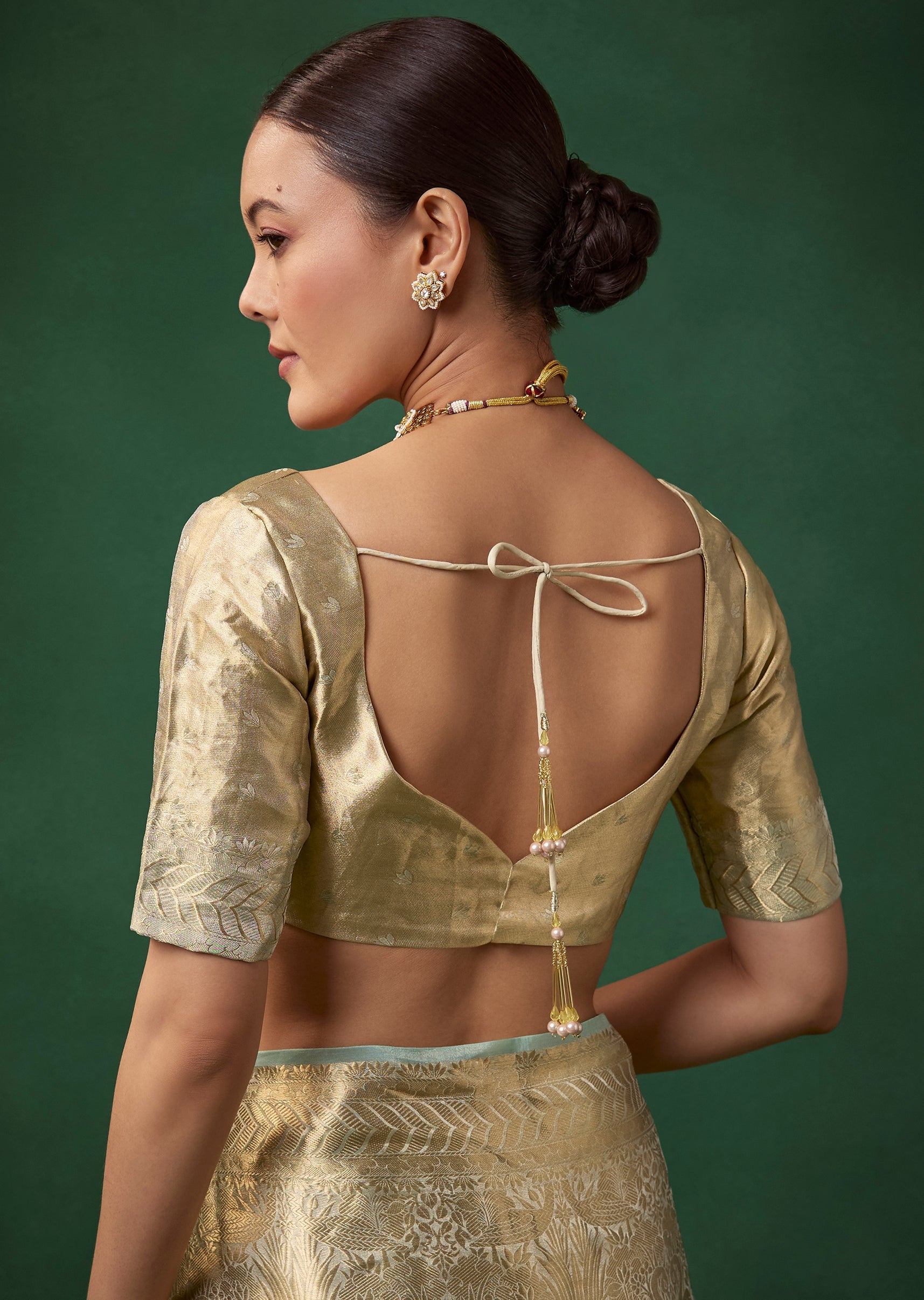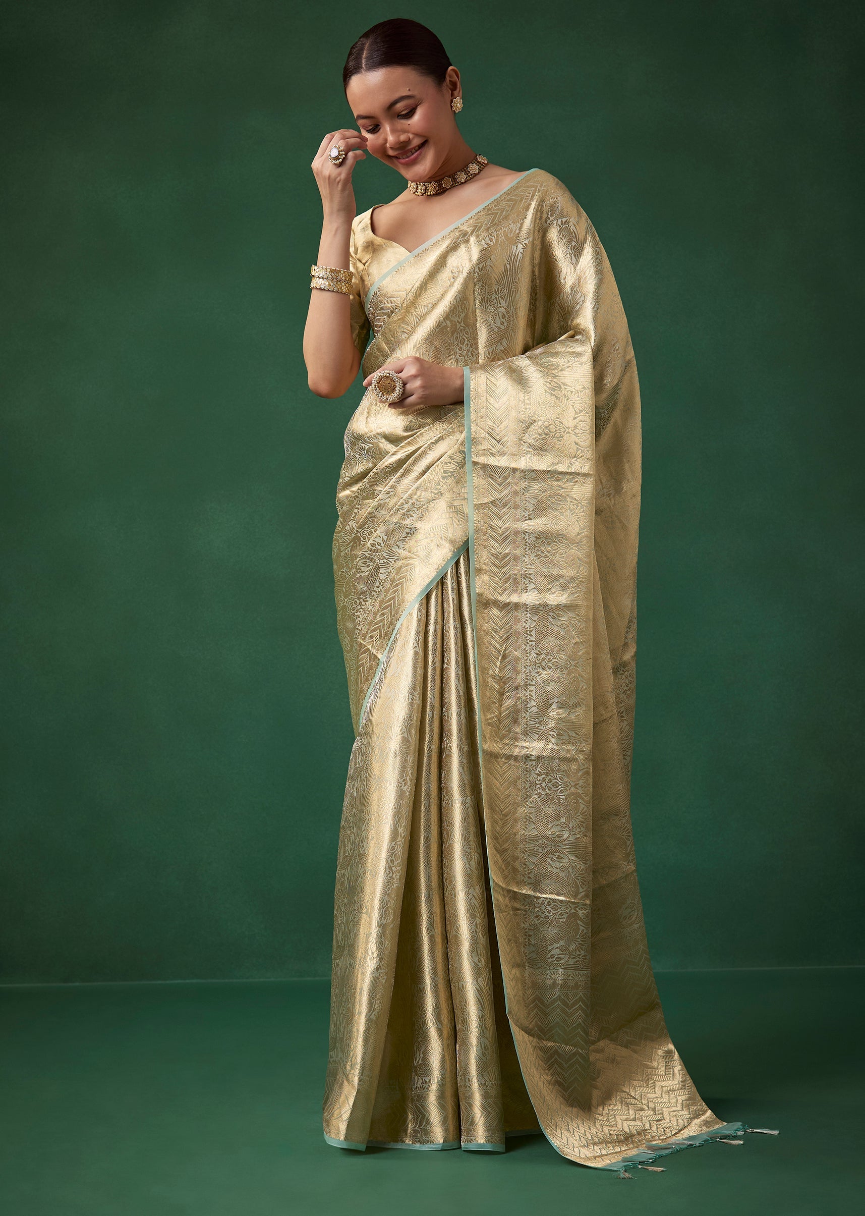 A radiant blend of tradition and contemporary charm, this tissue silk saree shines in gold with a soft touch of seafoam green woven through its delicate jaal and floral jacquard... More Product Details