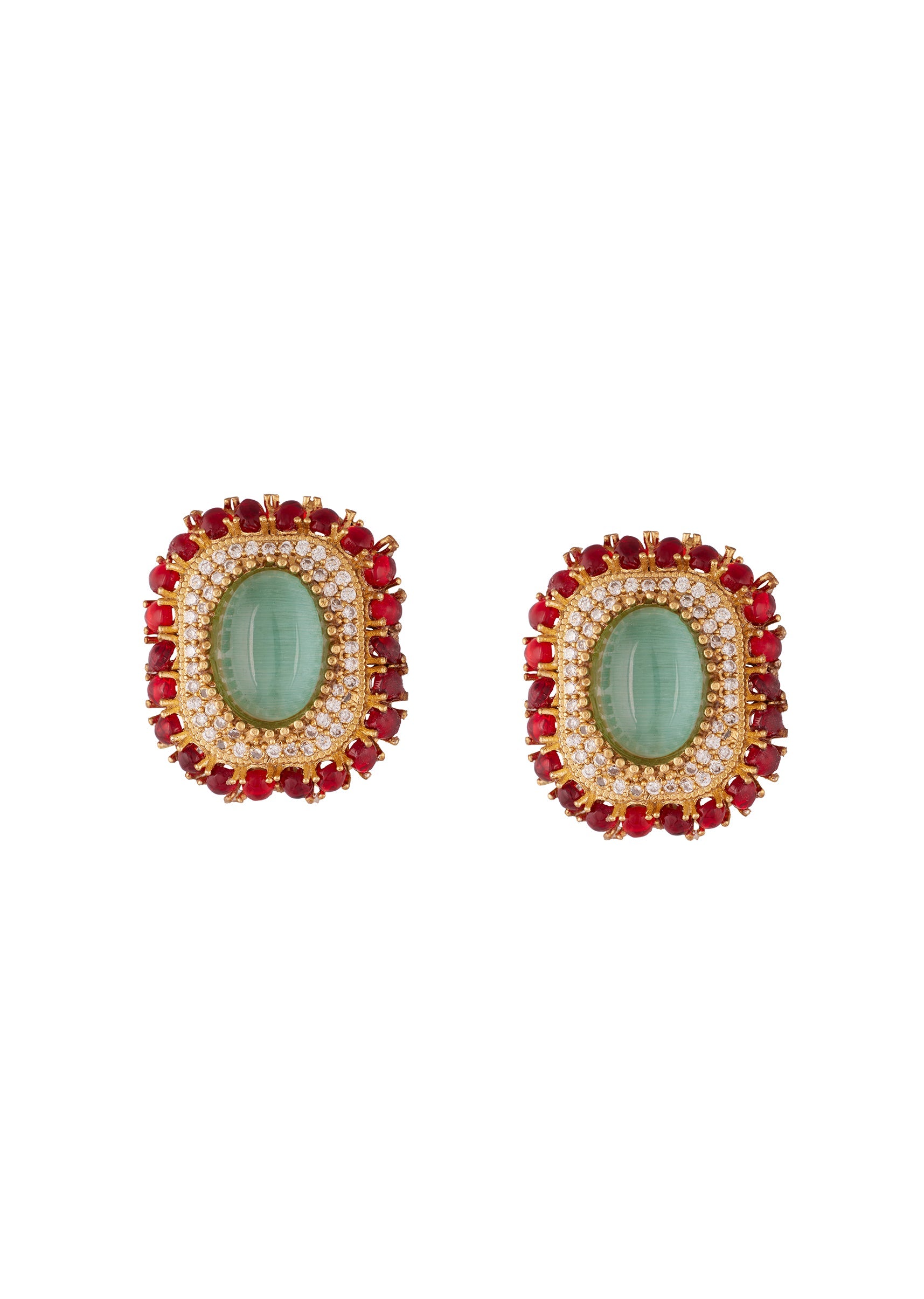 A gold toned square stud earring featuring deep red enamel highlighted with ornate border work. The centre is set with four clear stones arranged in a traditional Kundan style setting that gives the appearance of uncut polki inspired brilliance. Handcrafted with refined detailing this elegant pair brings a rich traditional charm perfect for festive functions wedding celebrations and cultural events.