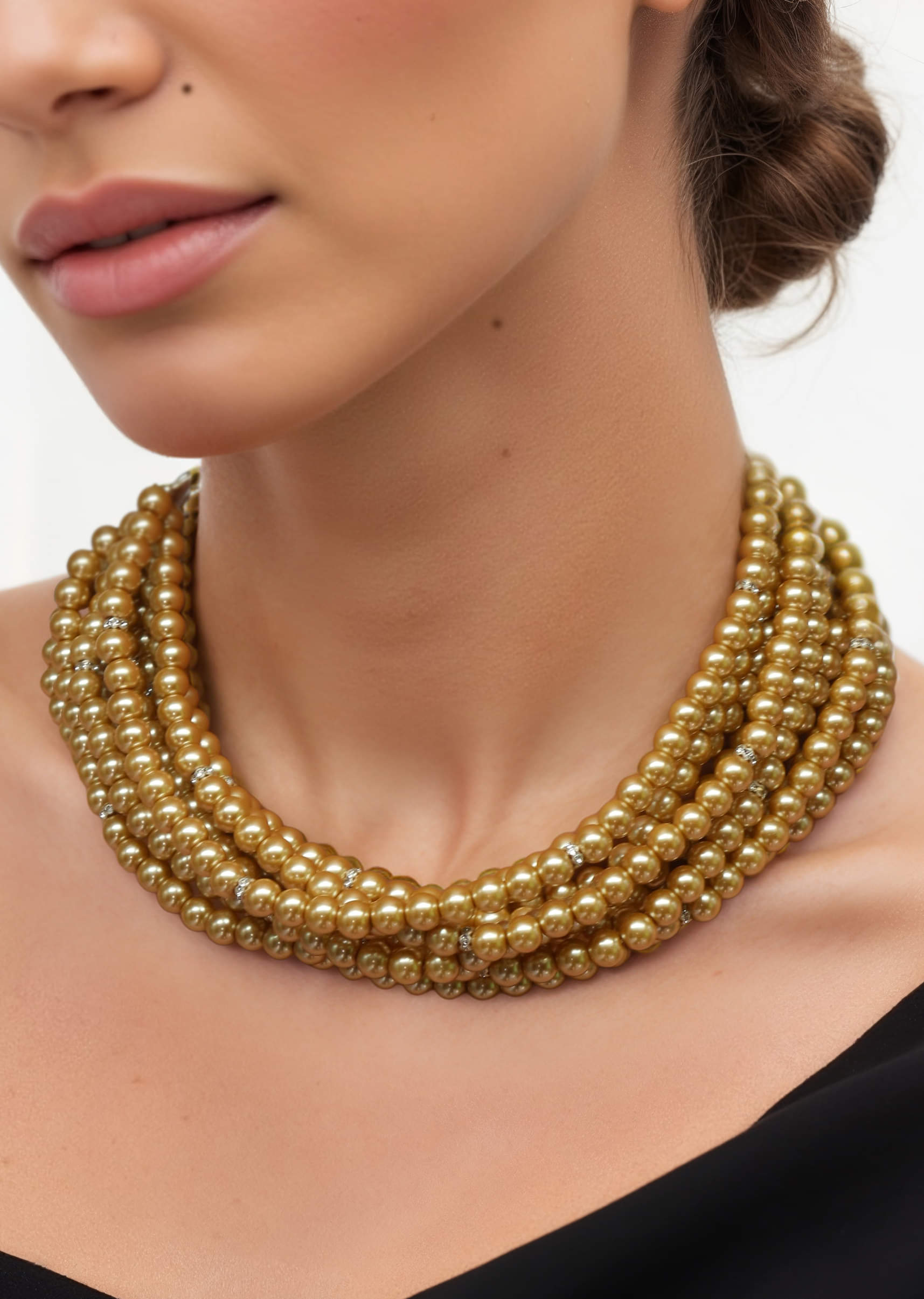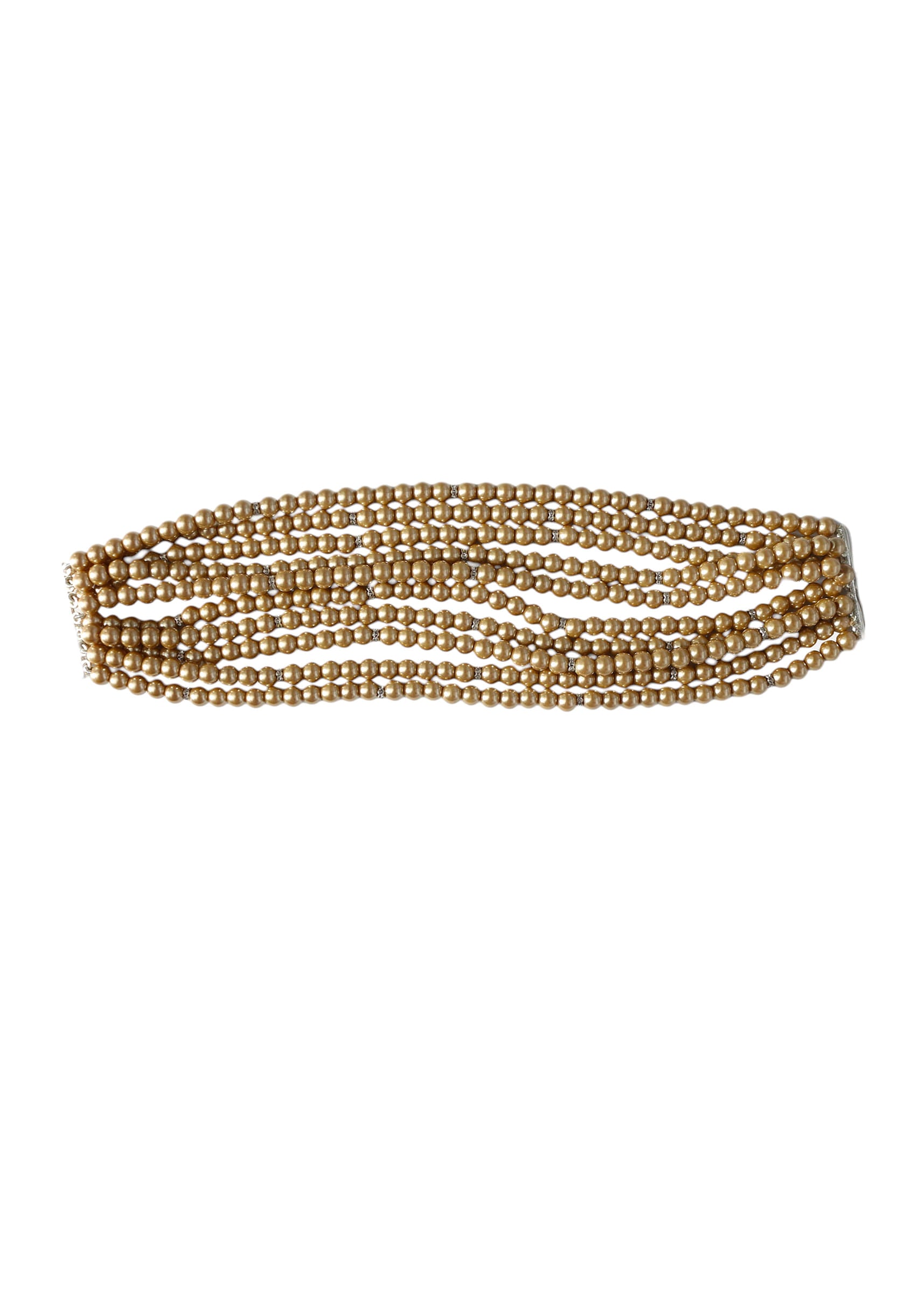 A gold tone layered pearl necklace featuring multiple strands of pearls accented with gold detailing, exuding classic elegance. Perfect for adding a sophisticated and regal touch to bridal, festive, or... More Product Details