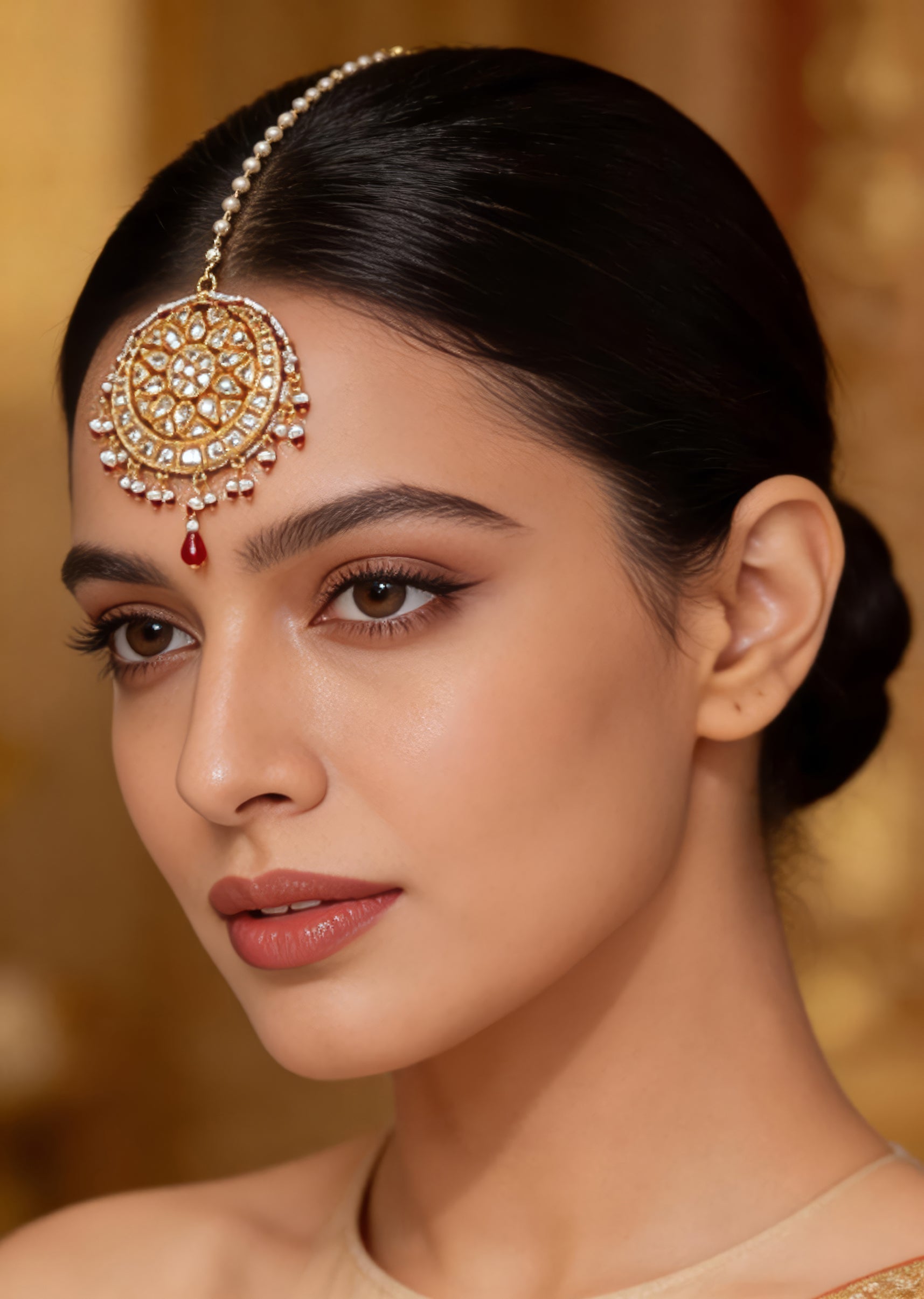 This stunning Maang Tikka features a grand crescent-shaped gold-toned design with uncut polki stones, delicate pearl accents, and intricate detailing, making it a perfect accessory for bridal and festive occasions.... More Product Details