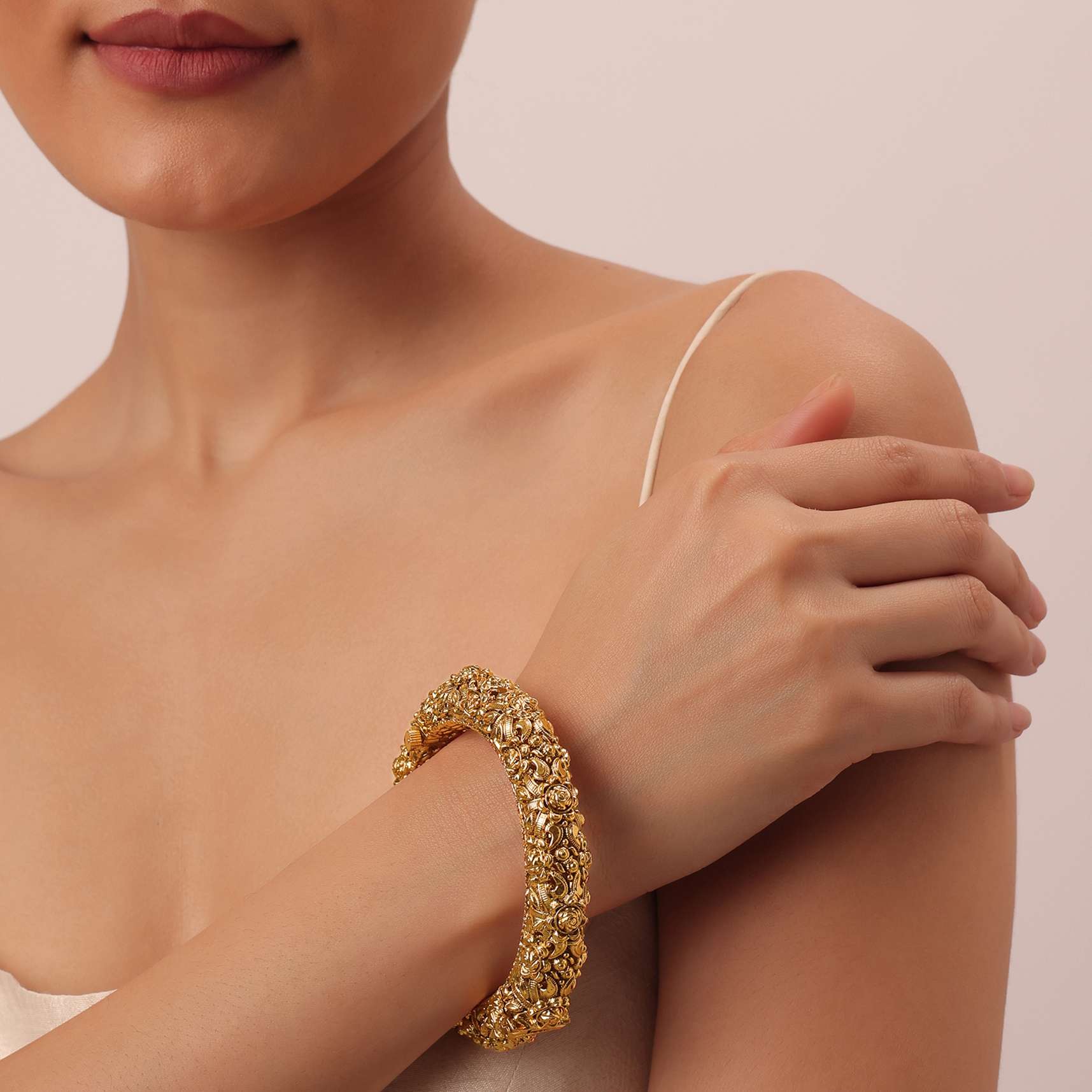 Indulge in timeless elegance with our traditional temple bangle. Featuring an exquisite design, this regal gold-tone addition displays meticulous craftsmanship. The intricate carved detailing will capture everyone's attention, while you sport an elegant look. Keep away from moisture, perfume, alcohol, and harsh chemicals.Spot clean only.Keep away from sharp objects. Awarded as the Most Trusted Brand, we're delivering styles you love, just as promised.