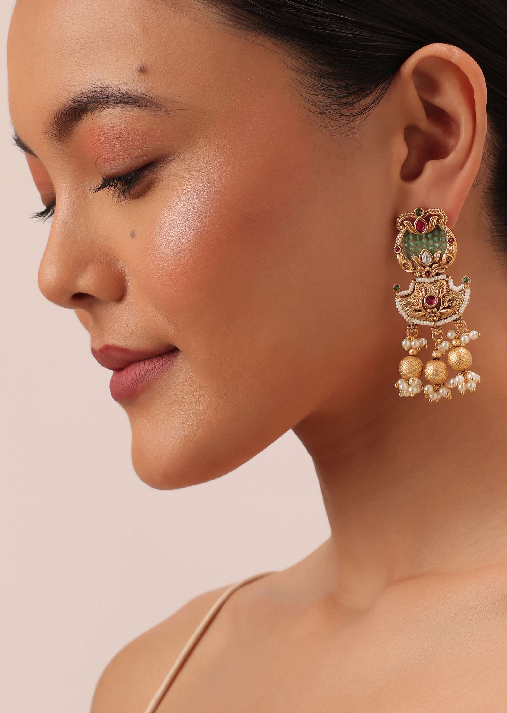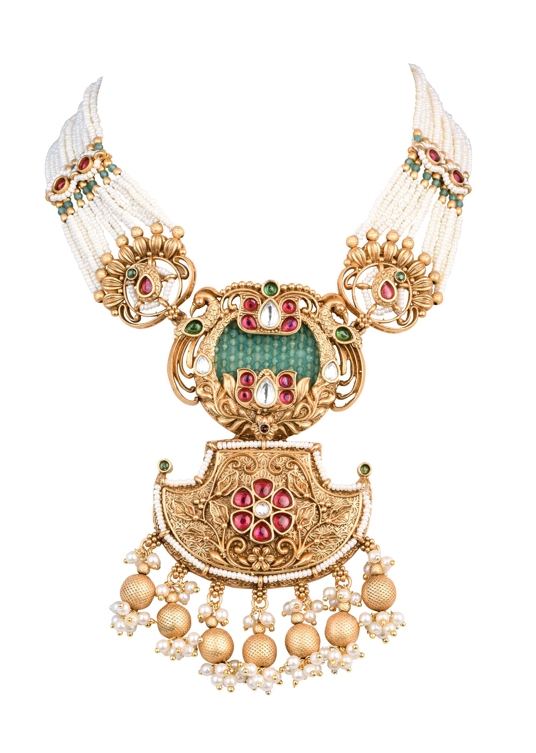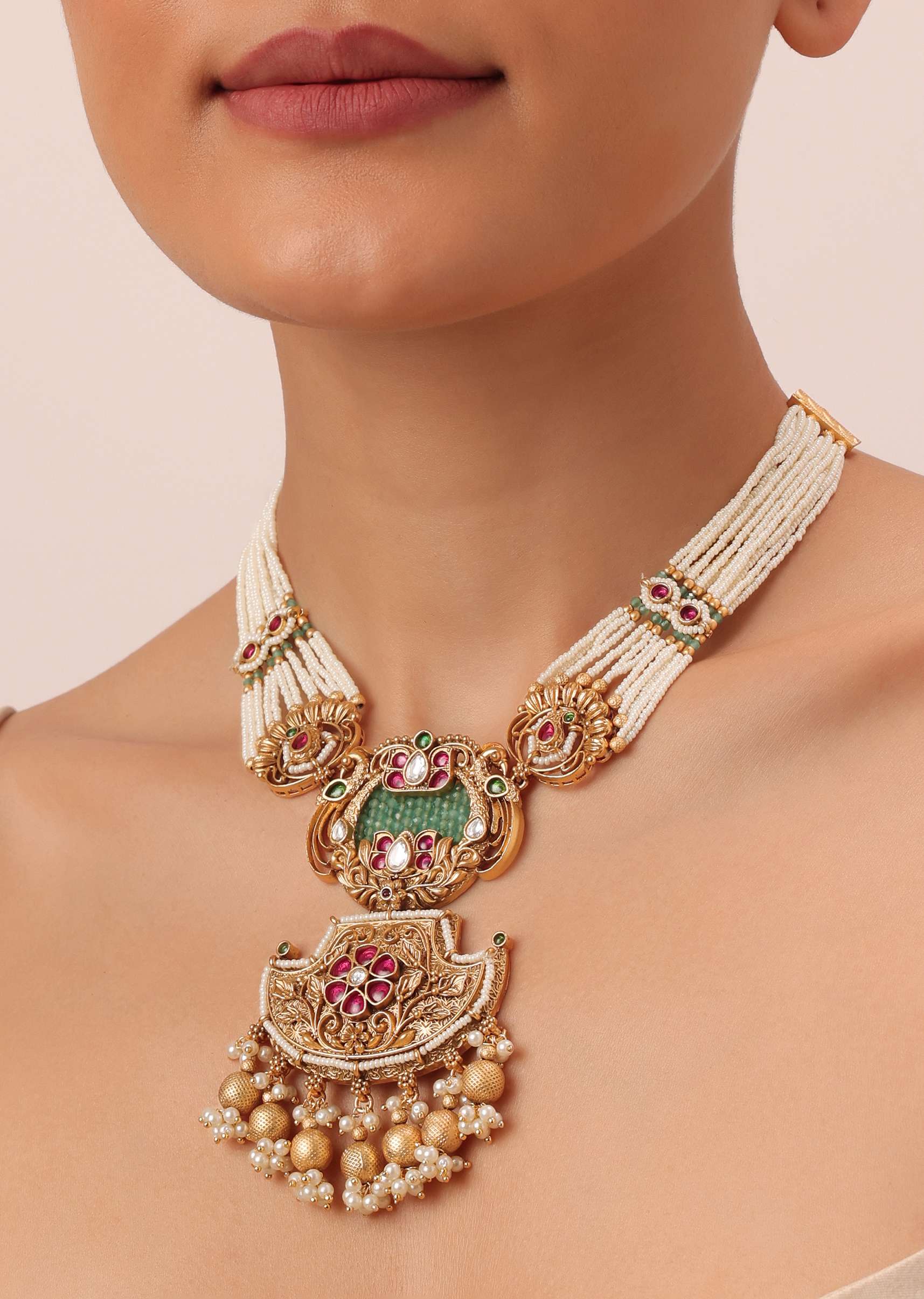 This divine necklace set is crafted with an exquisite pattern featuring glistening stones set in mixed metal. Displaying magnificent Meenakari work, it is supplemented by a cluster of pearl drops, creating a royal look. The unique pendant motifs and beaded strings elegantly adorns your neck. Boasts stunning artistry, this timeless piece of art is paired with long dangling earrings. Keep away from moisture, perfume, alcohol, and harsh chemicals.Spot clean only.Keep away from sharp objects. Awarded as the Most Trusted Brand, we're delivering styles you love, just as promised.