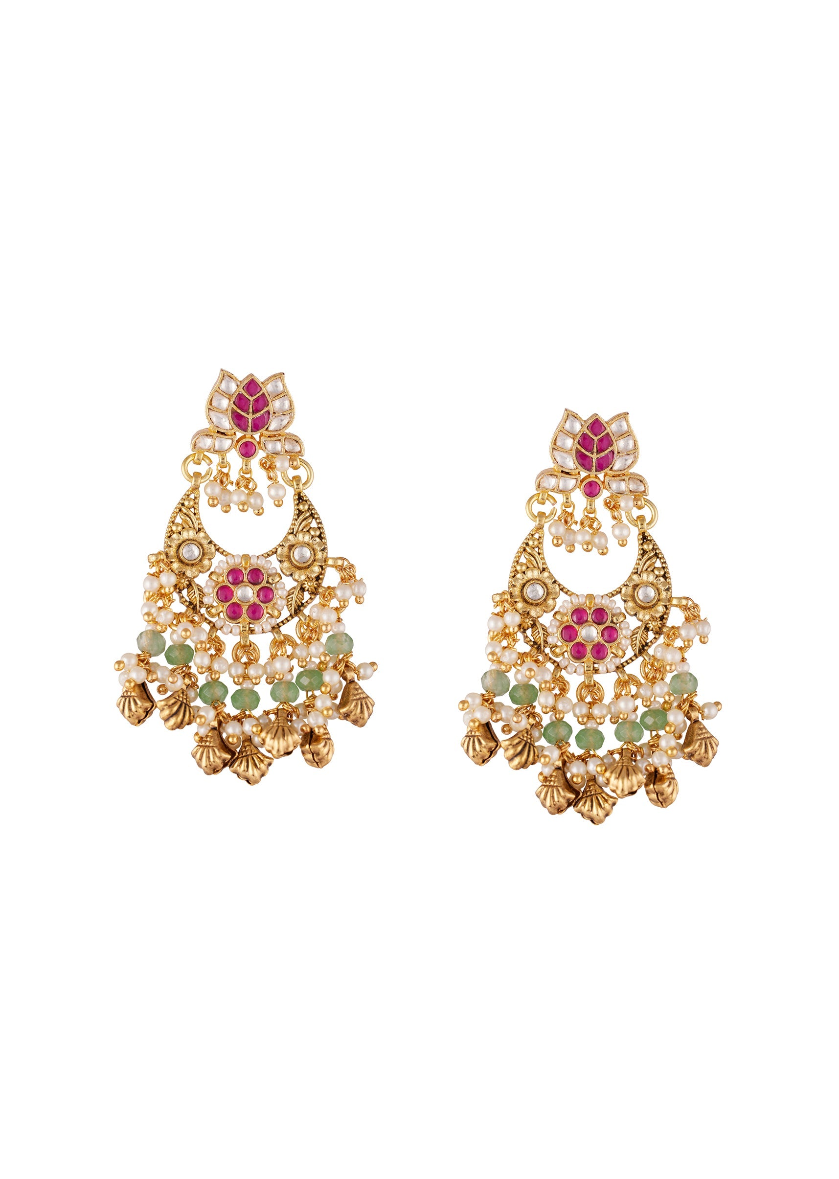 Gold Toned Chandbali Earrings With Kundan And Stone And Pearl Detailing