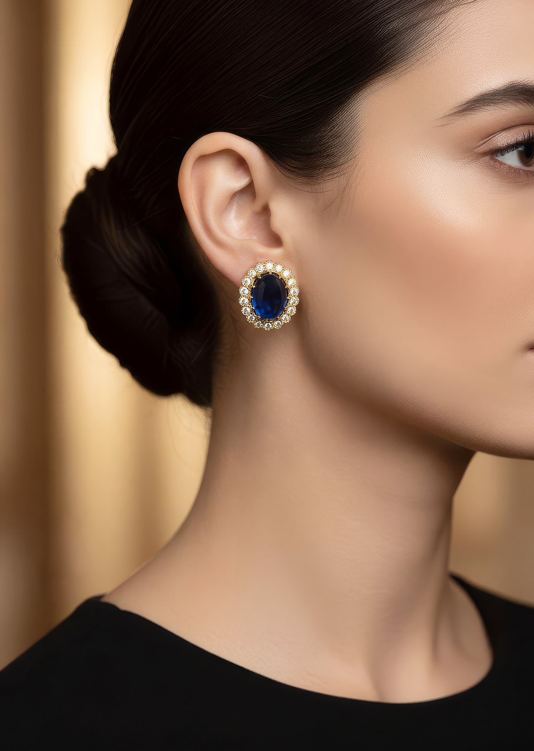 : Pair them with a navy blue black or gold outfit to highlight the deep blue centre stone.