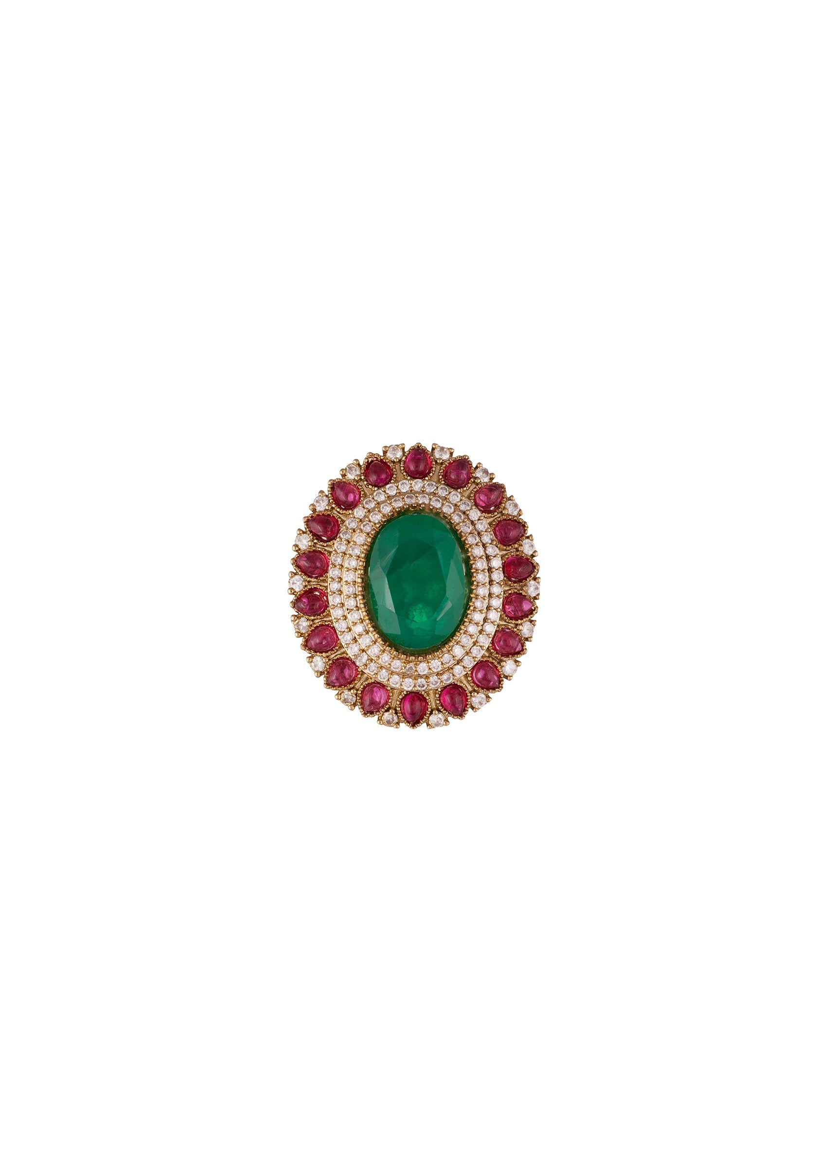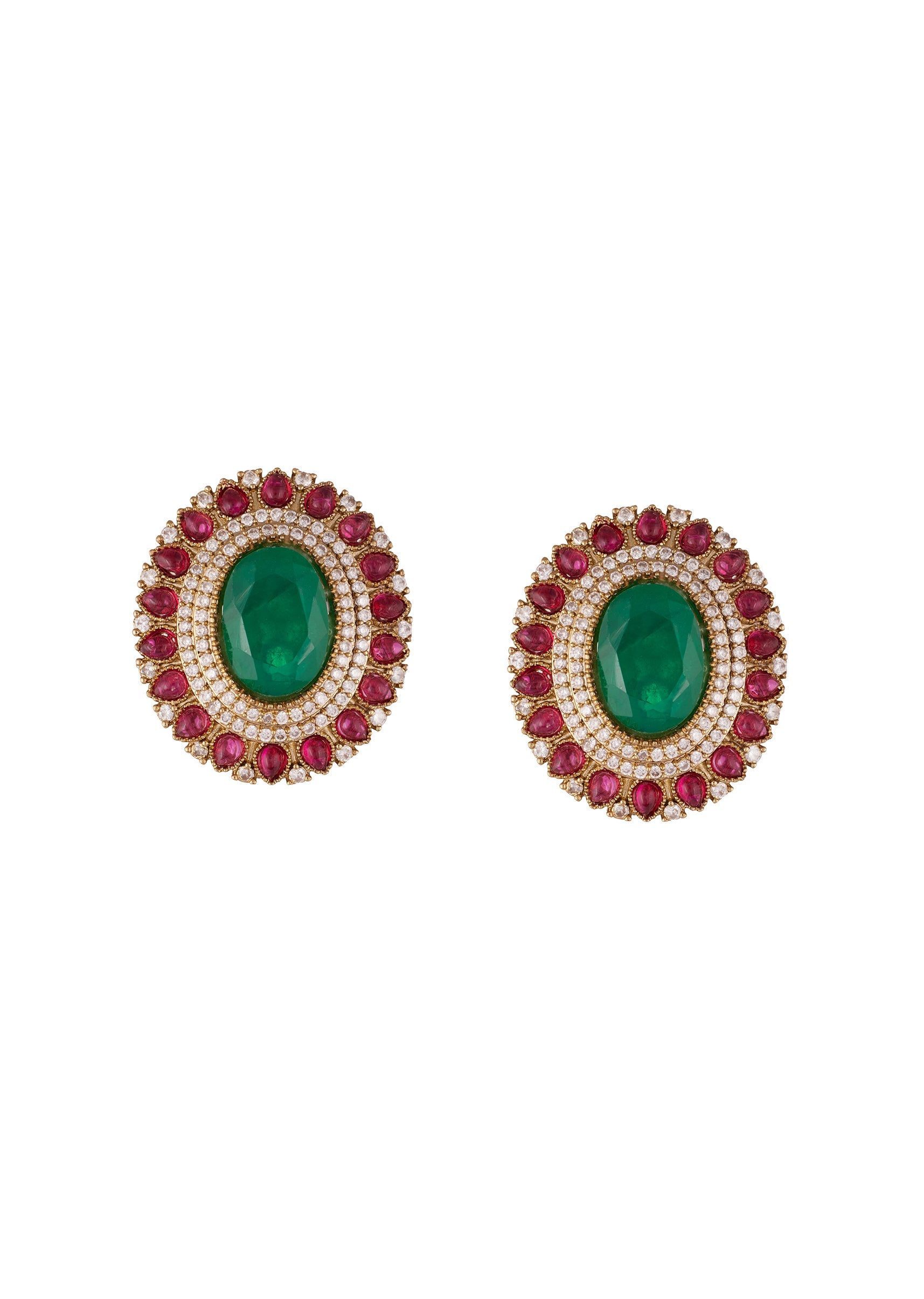 A gold toned statement earring featuring a central faceted emerald stone that forms the vibrant focal point of the design. It is framed with a double halo of brilliant white cubic zirconia stones and accented with outer teardrop pink stones that add colour depth and elegance. Handcrafted with meticulous detailing this striking pair is perfect for festive evenings weddings and special celebrations bringing a rich and regal finish to any look.
