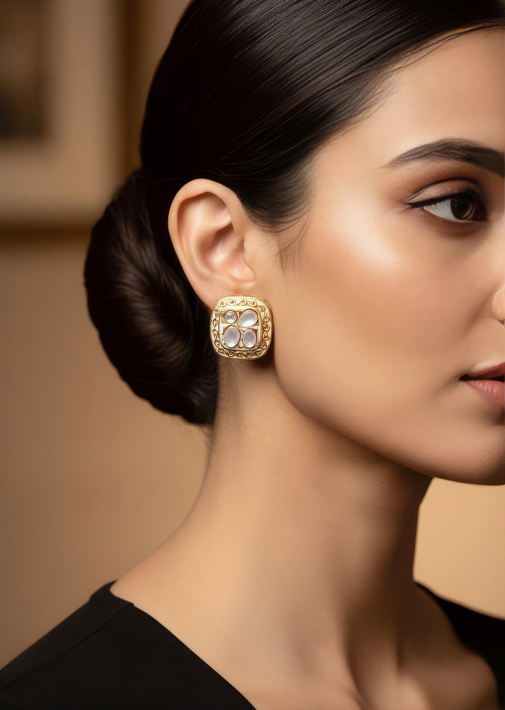 A gold toned square stud earring featuring white enamel paired with ornate gold filigree detailing. The centre is set with four clear stones in varied shapes arranged in a traditional Kundan style setting that gives the appearance of uncut polki inspired brilliance. Handcrafted with precision this elegant pair brings a classic yet modern appeal perfect for festive gatherings wedding celebrations and evening functions.
