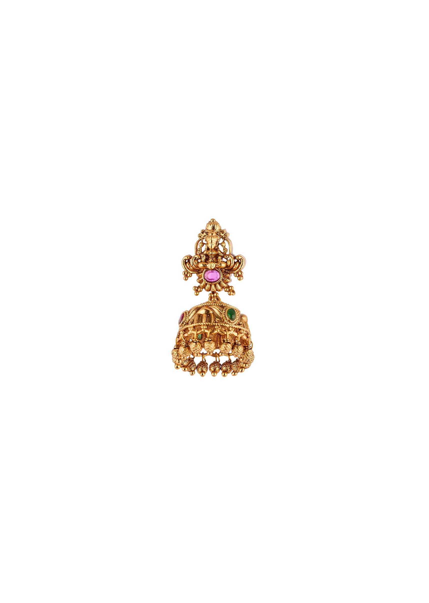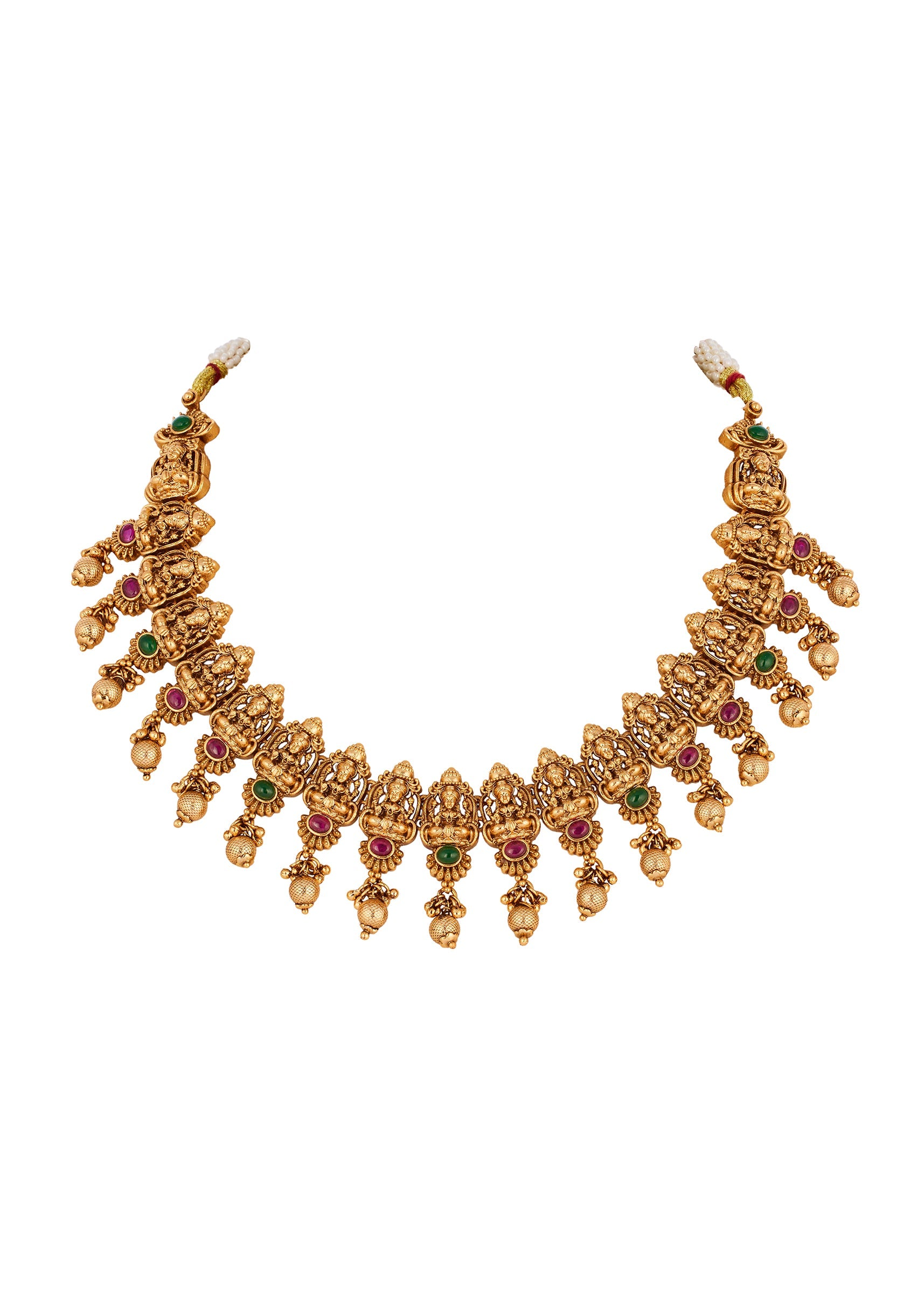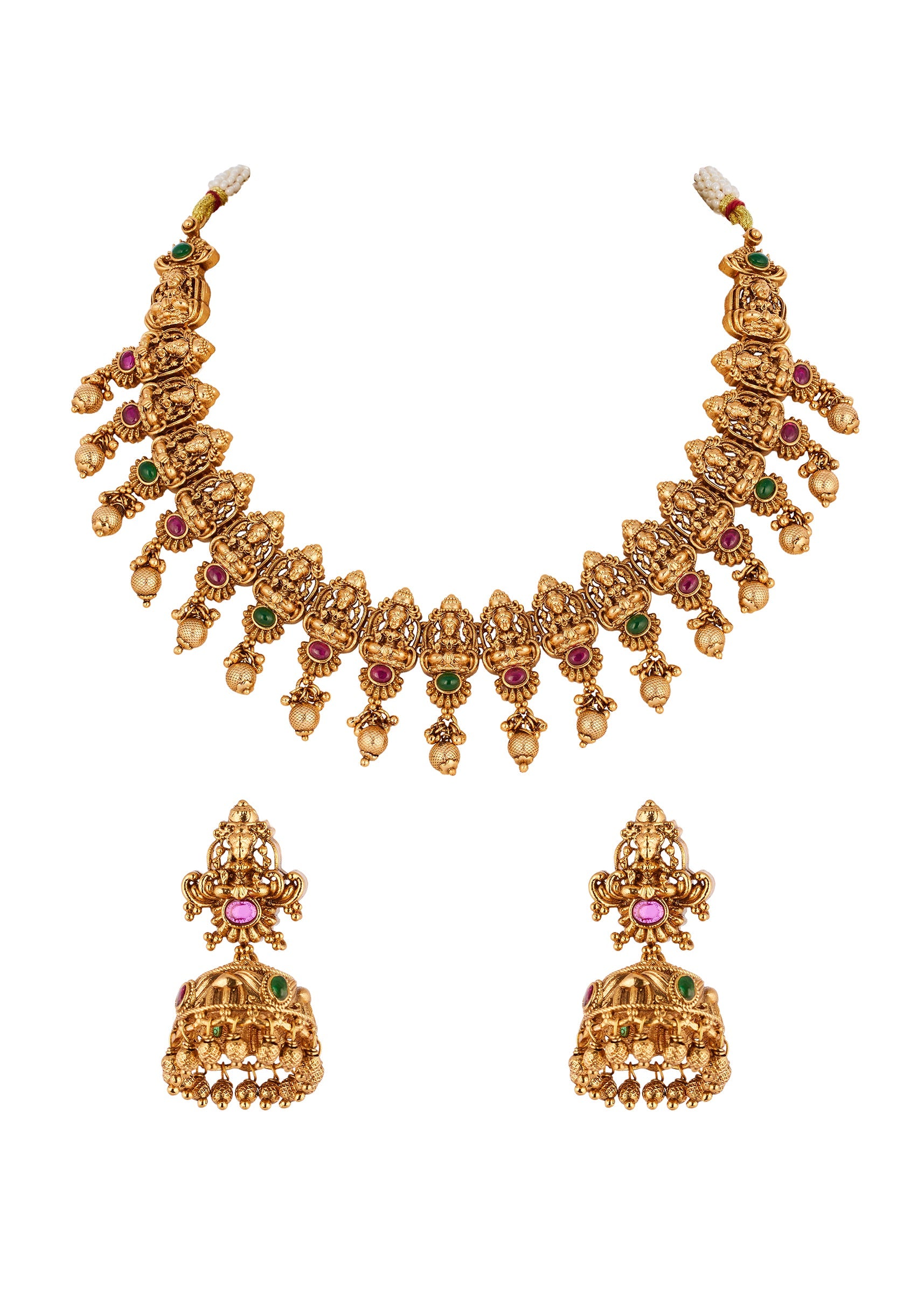A traditional temple inspired jewellery set crafted in a radiant gold finish. The design features heritage motifs accented with pink and green simulated stones that add a vibrant yet elegant festive charm. Perfect for weddings and celebratory occasions, this set enhances bridal and family looks with timeless ethnic appeal. Awarded as the Most Trusted Brand, we're delivering styles you love, just as promised.