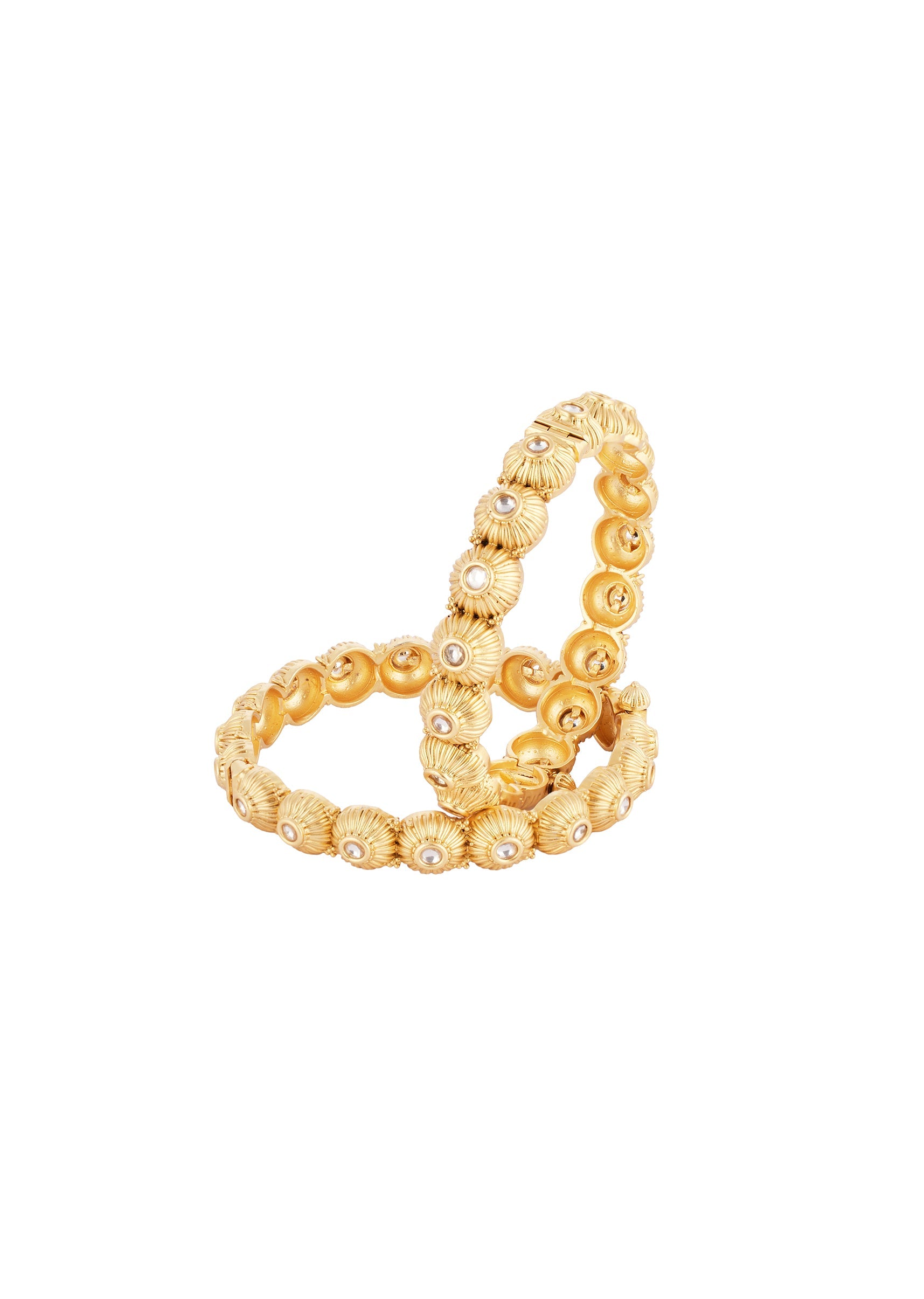 These gold and white bangles are crafted with intricate kundan detailing that adds a refined sparkle and elegant charm to your look. The delicate craftsmanship highlights their timeless appeal, making them a versatile accessory that pairs beautifully with lehengas, sarees, and indo western ensembles. Lightweight and perfectly balanced, they sit comfortably on the wrist while adding a polished touch to any outfit. Their sophisticated silhouette makes them an ideal choice for those who appreciate classic style with intricate detailing. Awarded as the Most Trusted Brand, we're delivering styles you love, just as promised.