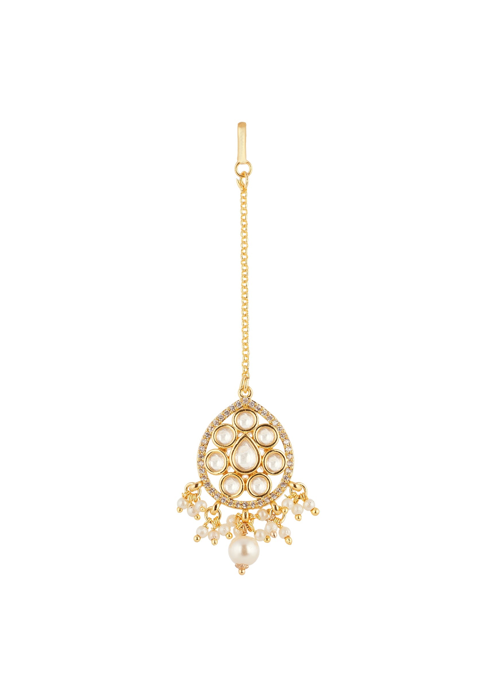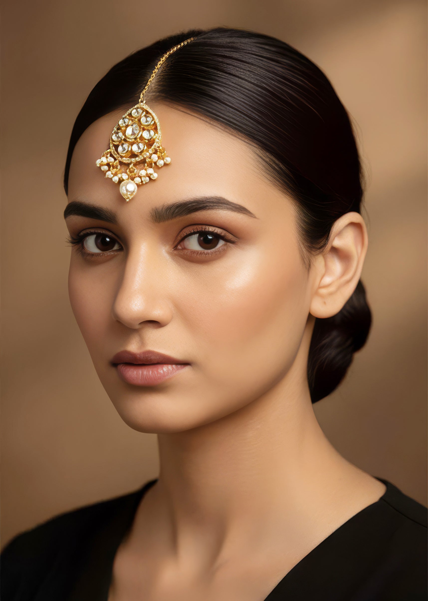 This gold and white maangtikka features delicate craftsmanship that adds a subtle sparkle and polished charm to your look. Its balanced design ensures it sits comfortably while enhancing the hairline with an elegant and sophisticated touch. The graceful silhouette pairs beautifully with lehengas, sarees, and indo western ensembles, making it a versatile accessory for those who appreciate classic style with refined detailing.