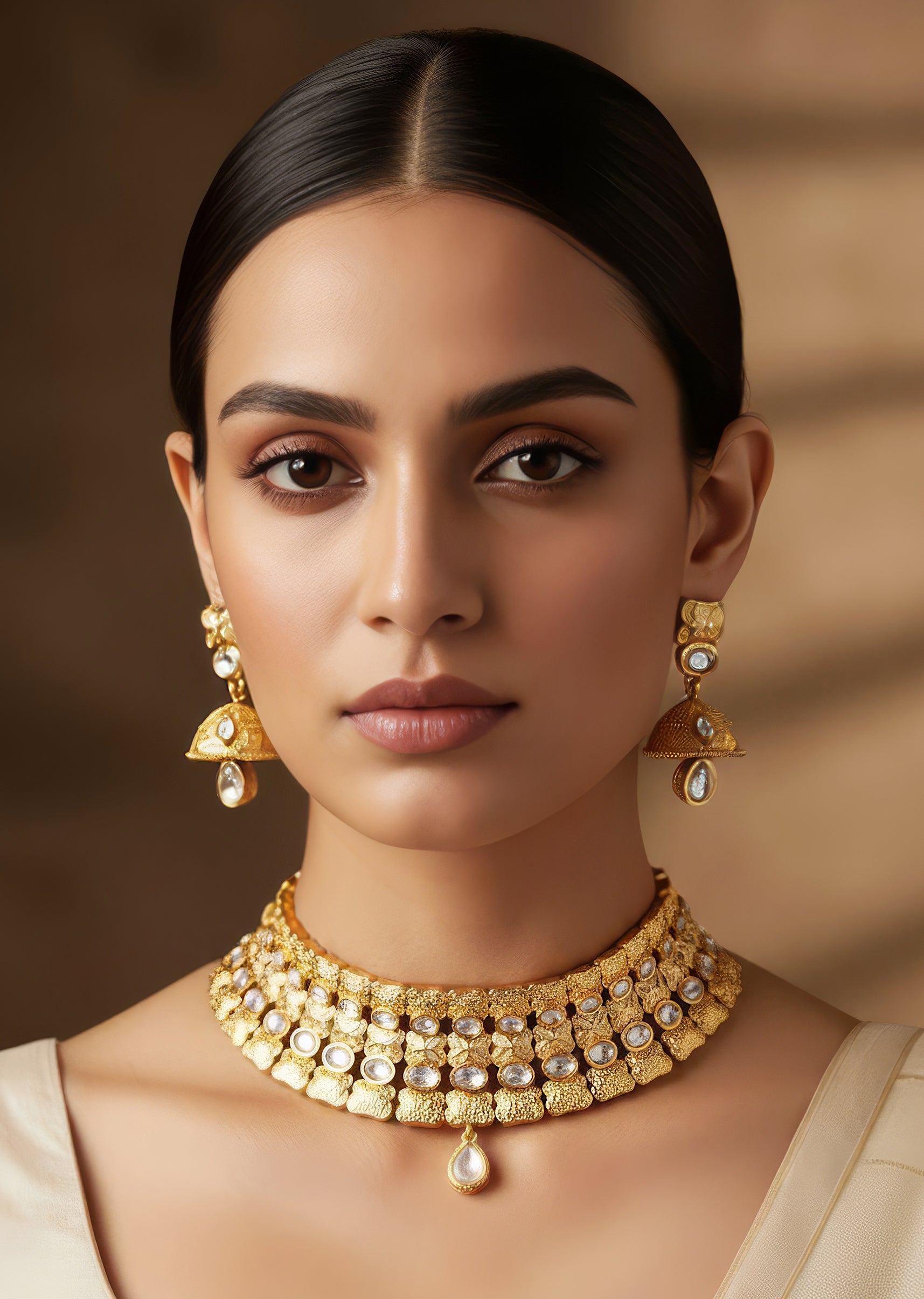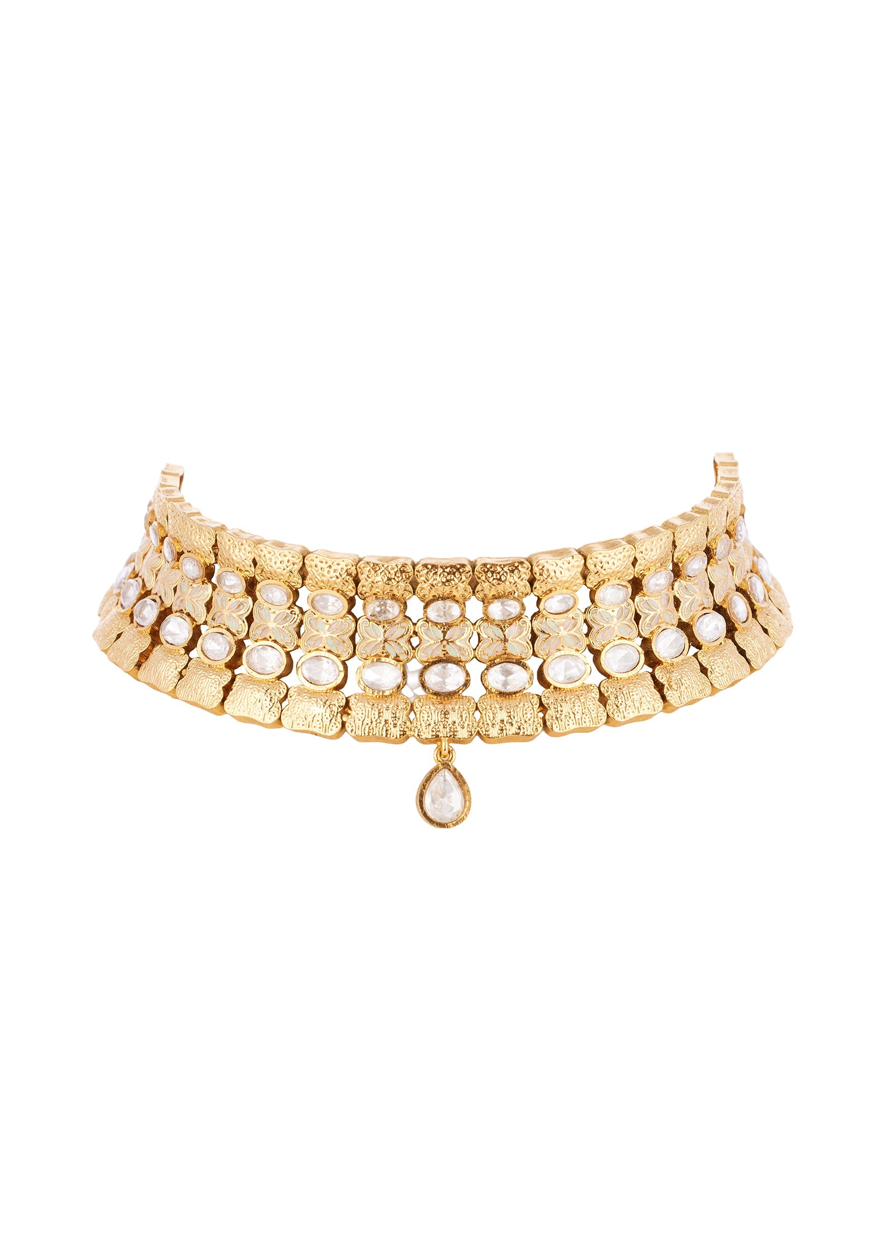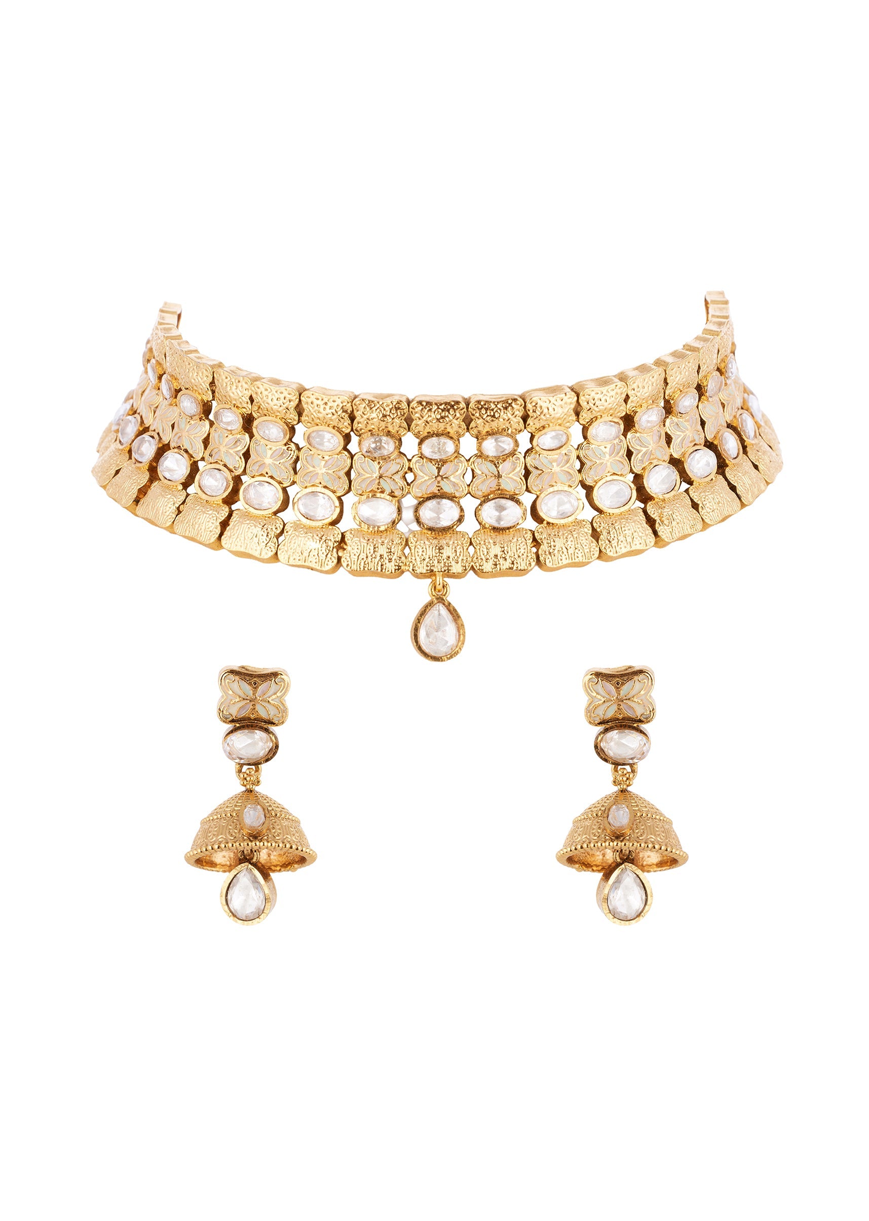 This gold and white necklace set features delicate kundan craftsmanship that adds a subtle sparkle and refined charm to your look. The intricately designed necklace paired with matching earrings enhances the neckline while adding an elegant and sophisticated touch to any ensemble. Lightweight and balanced, it pairs beautifully with lehengas, sarees, and indo western outfits, making it a versatile accessory for those who appreciate classic style with polished detailing.
