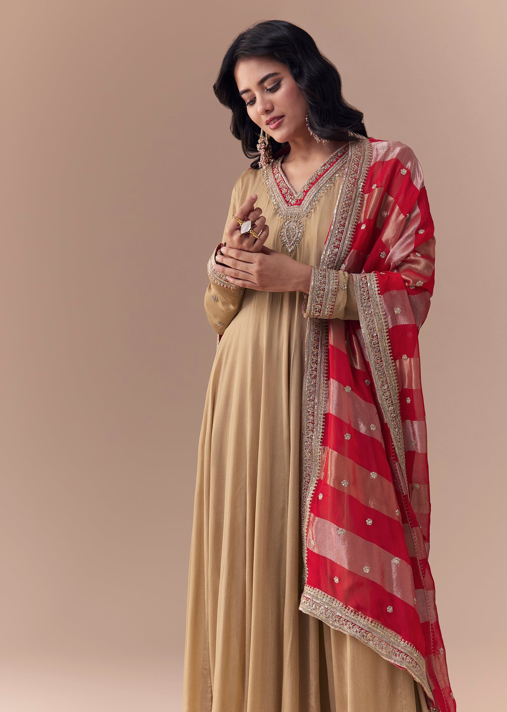 Gold chandbalis and embellished heels enhance its refined festive sparkle.