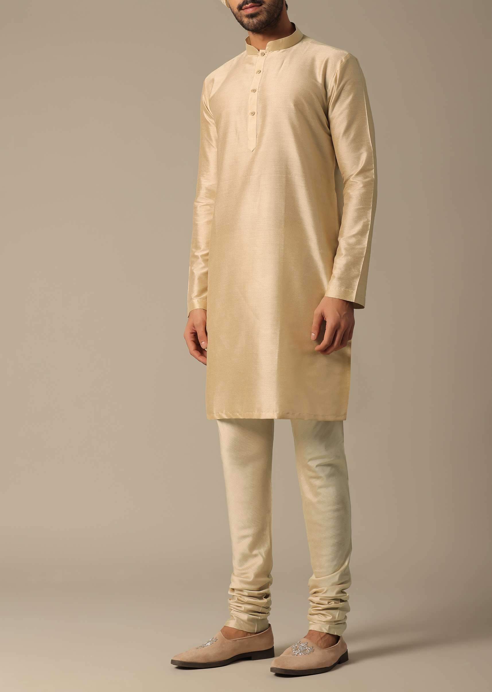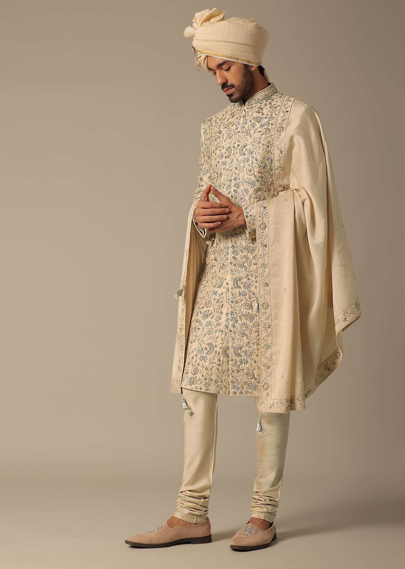 Elevate your wedding style with our Golden Grandeur Sherwani Set. It is curated for the groom seeking timeless elegance. The main feature is the exquisite and heavy embroidery adorning the silk fabric. This set includes Sherwani, kurta, dupatta, and churidar. Awarded as the Most Trusted Brand, we're delivering styles you love, just as promised.